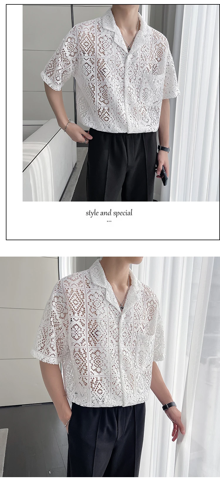 Wiaofellas Summer Men Mesh Hollow Lace Short Sleeve Loose Casual Vintage Shirts Male Beach Shirts Male Streetwear Fashion Shirts Blouse