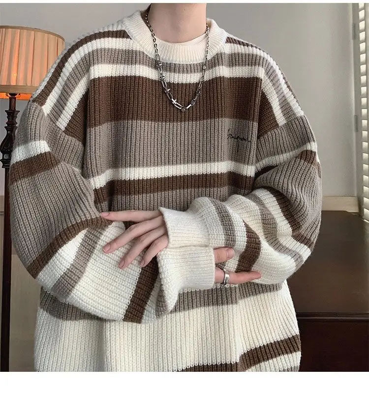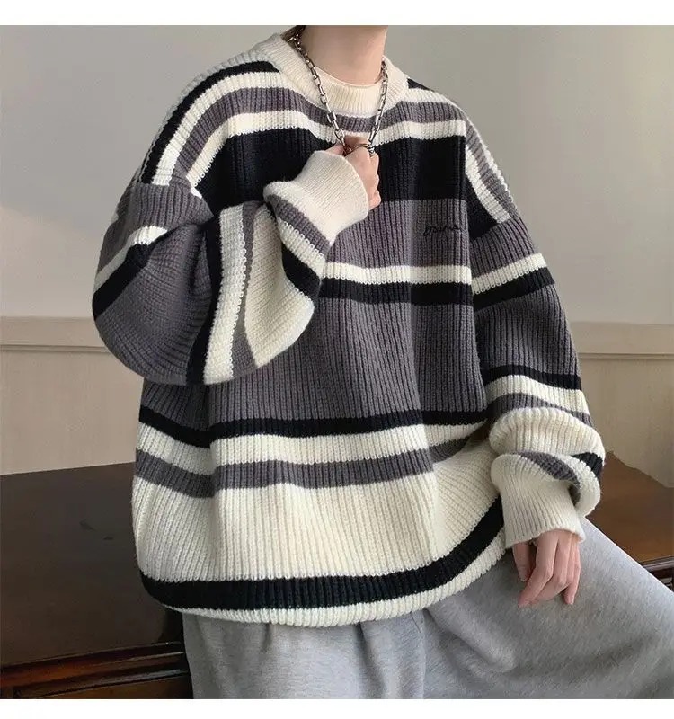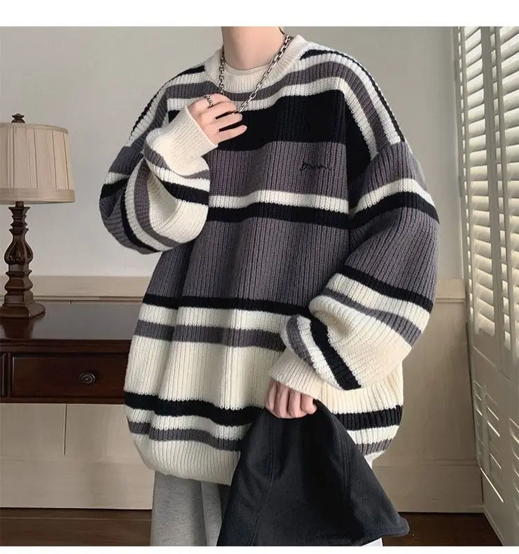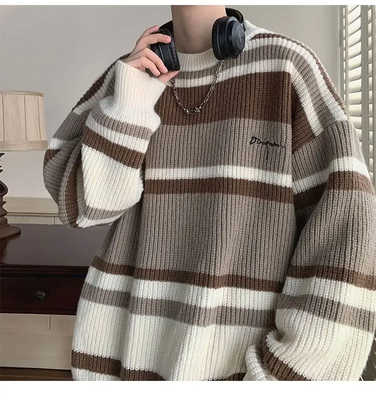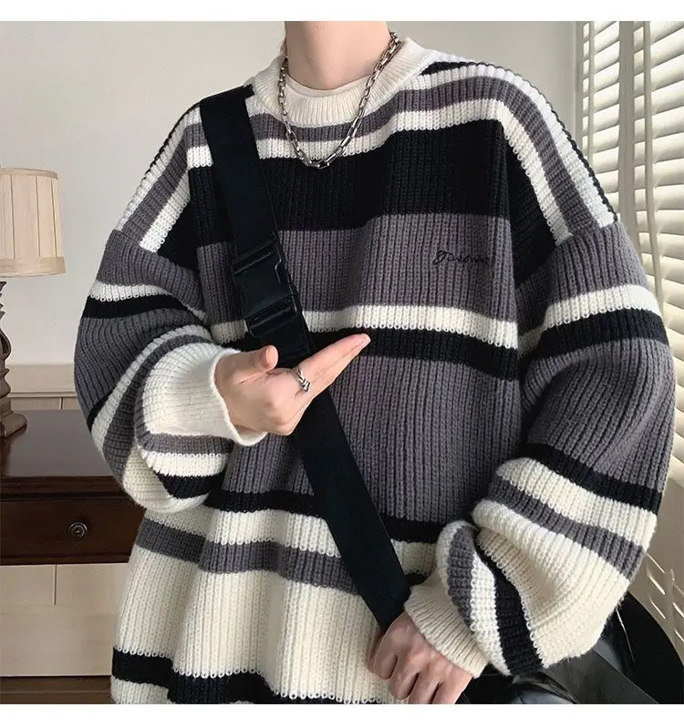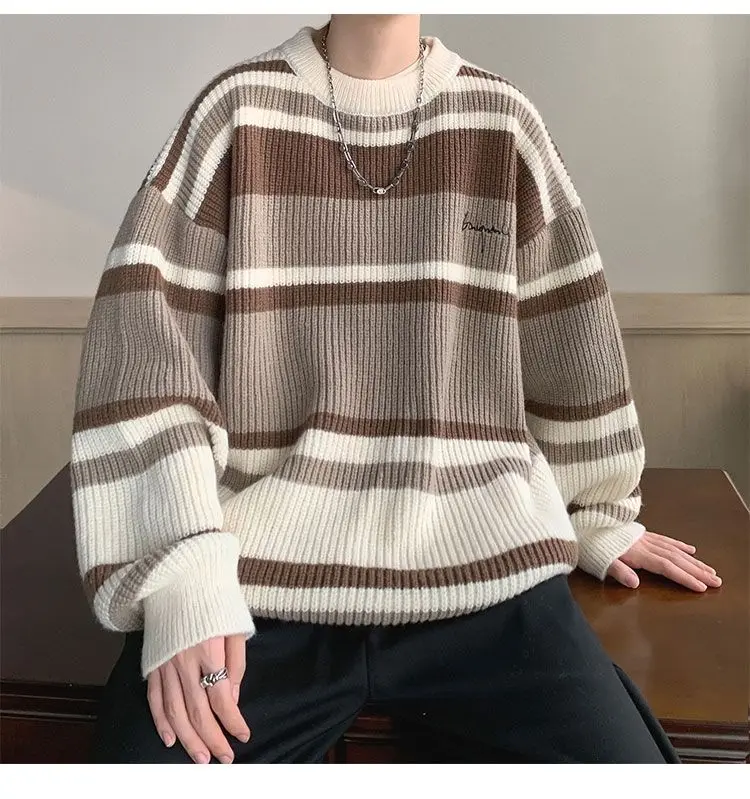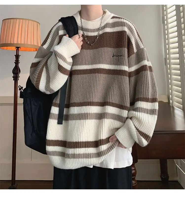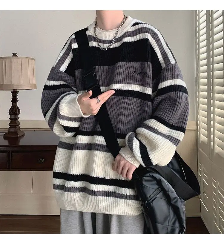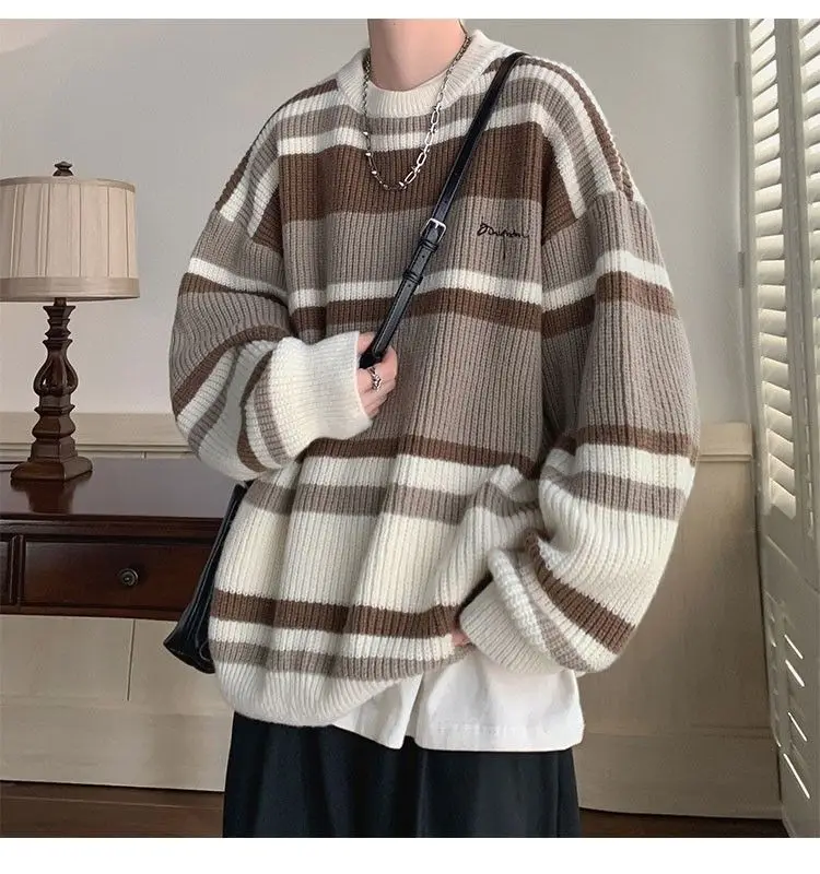 Wiaofellas Sweater Men Autumn Winter Striped O-neck Knitted Pullovers Warm College Leisure Knitwear Fashion Korean Clothing A198