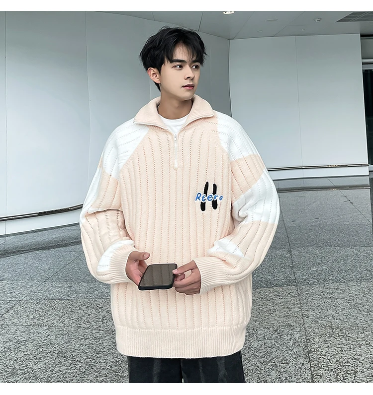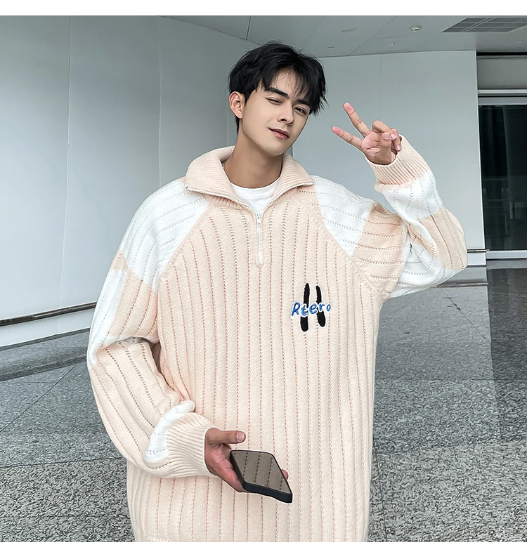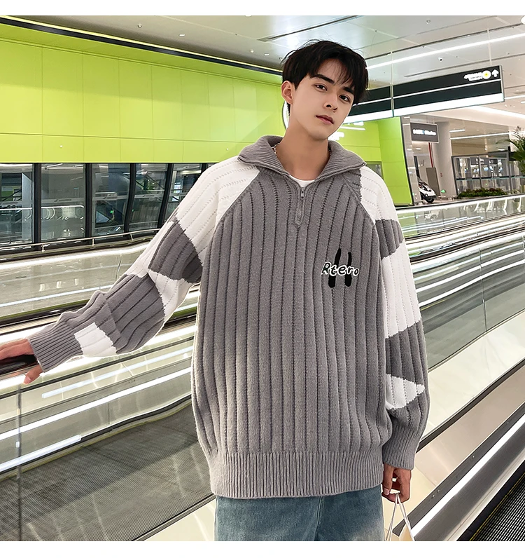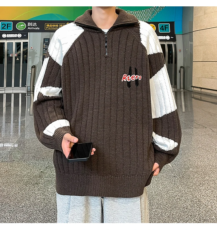 Wiaofellas Winter American Retro Contrast Color Cardigan Sweater Coat Fashion Brand Loose bf Style Versatile Knit Chic Unisex Men Clothing