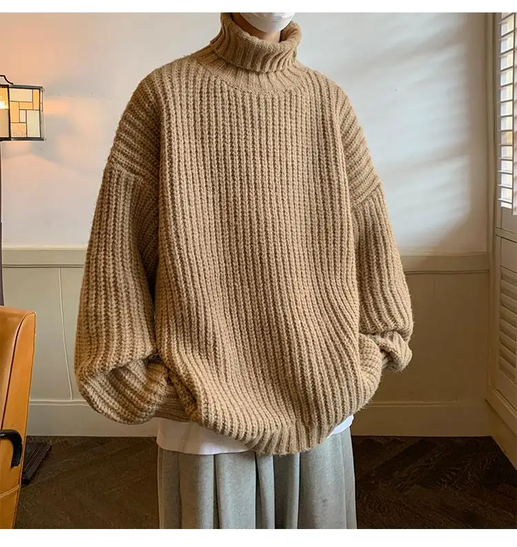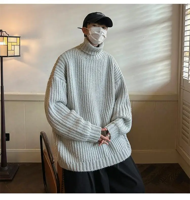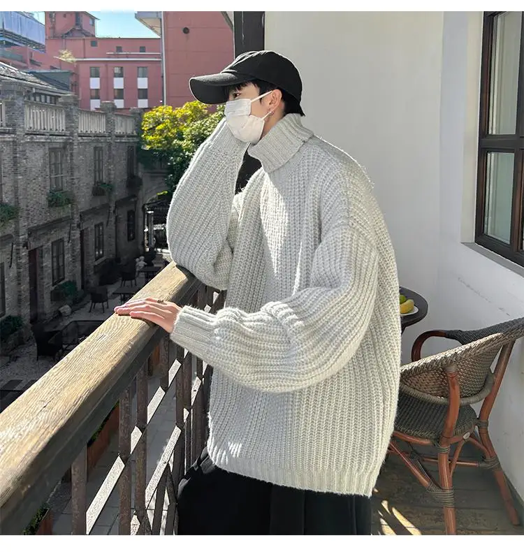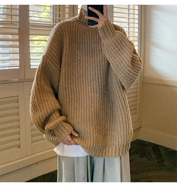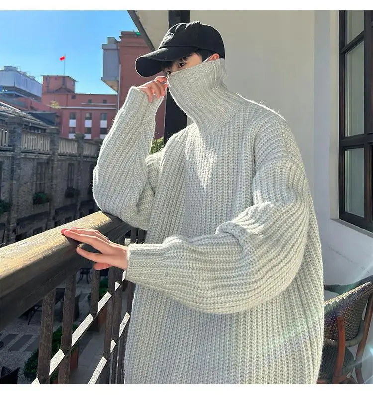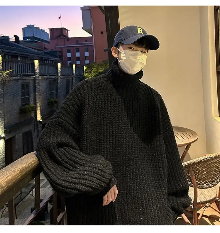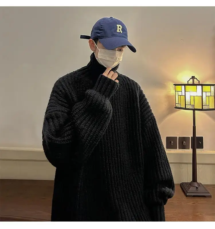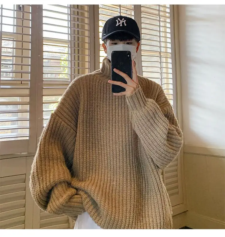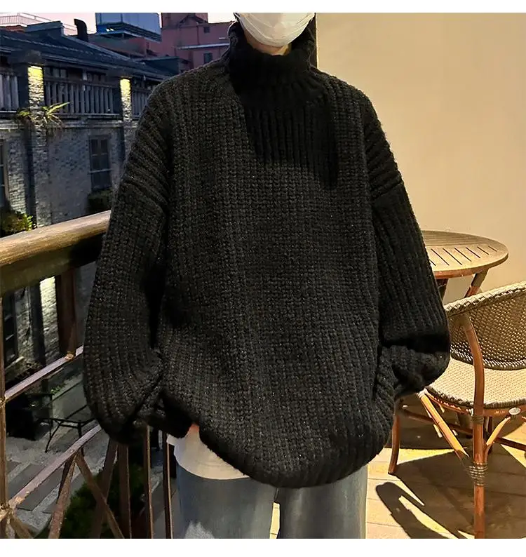 Wiaofellas Hong Kong Style Solid Color High Collar Versatile Couple High Collar Sweater Knit Pullover Fashion Daily Handsome Men Clothing