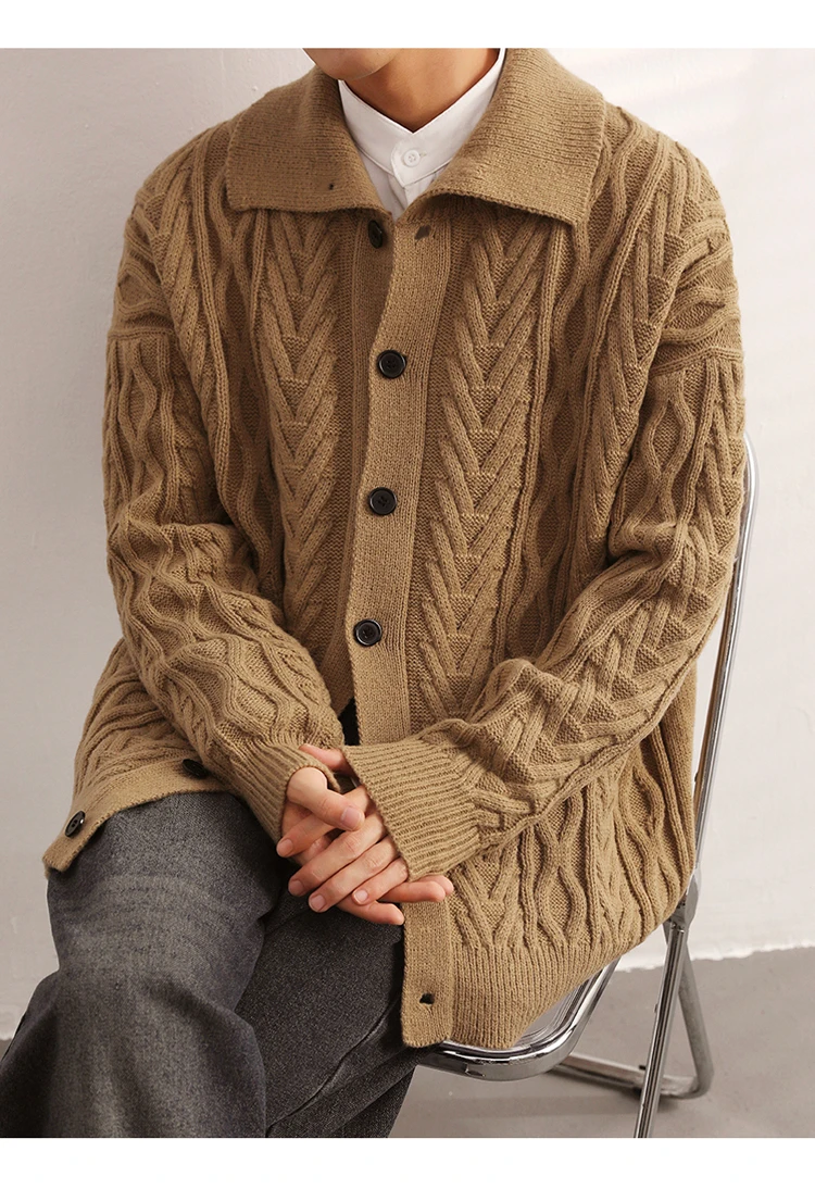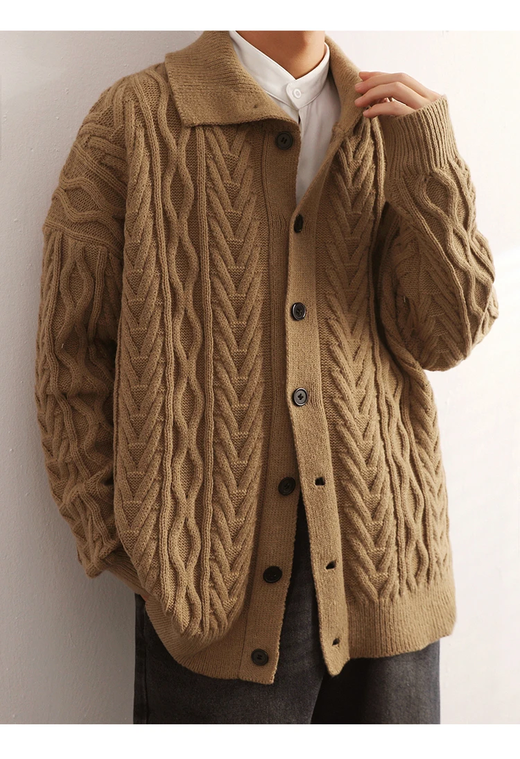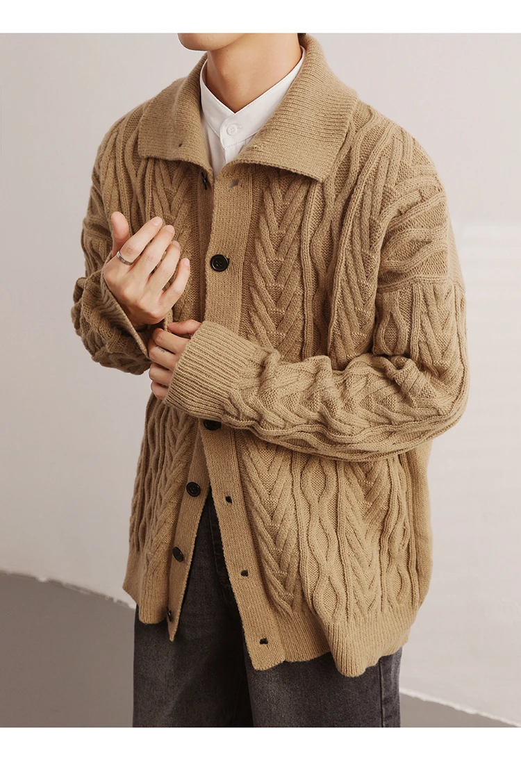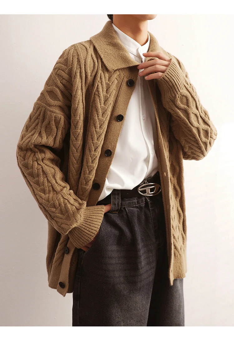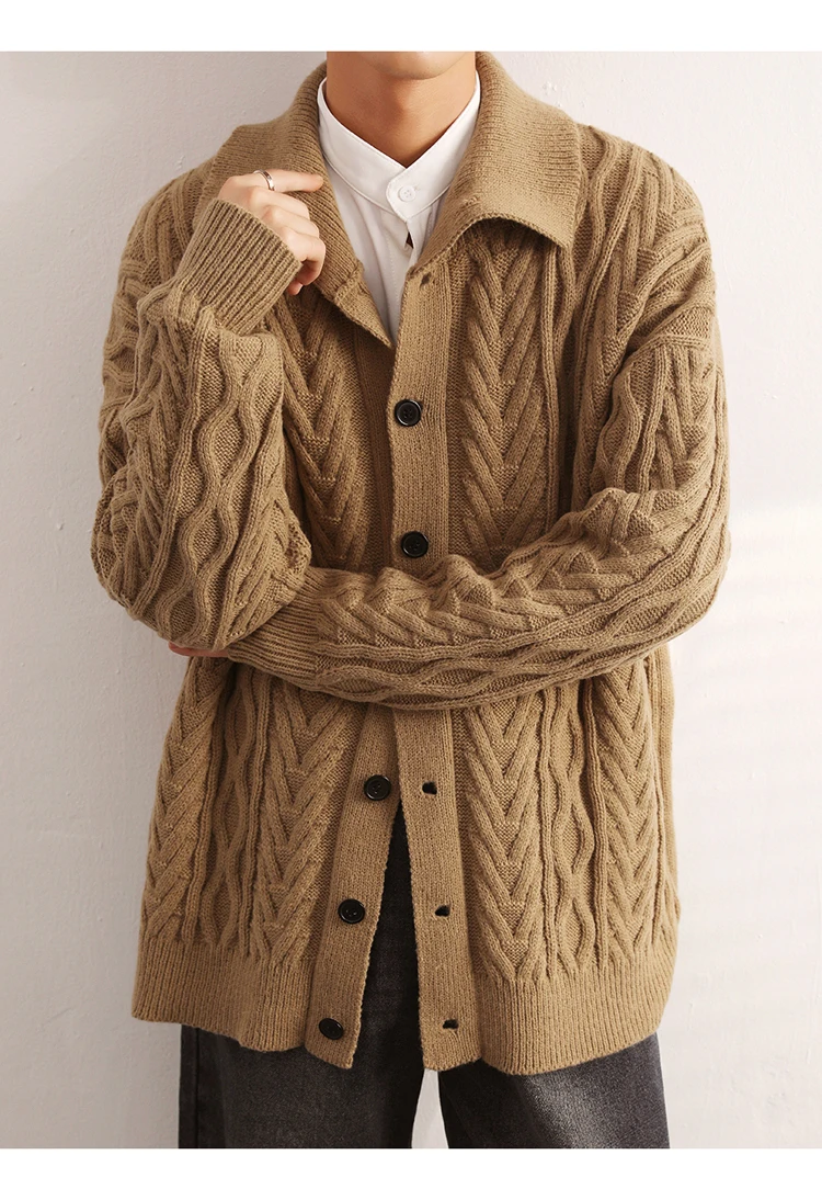 Wiaofellas Winter Fashion Thickened Collar Cardigan Sweater Men's Japanese Retro Lazy Loose Versatile Casual Fried Dough Twists Knit Coat