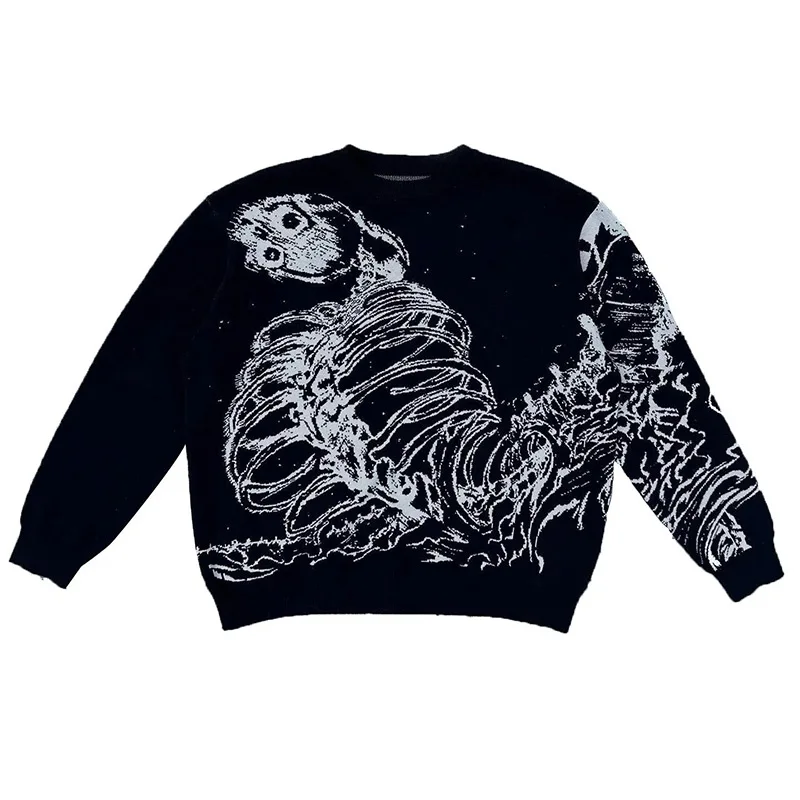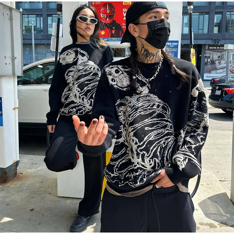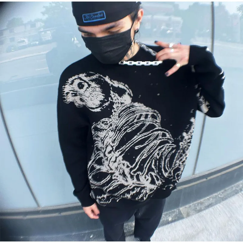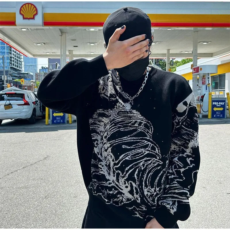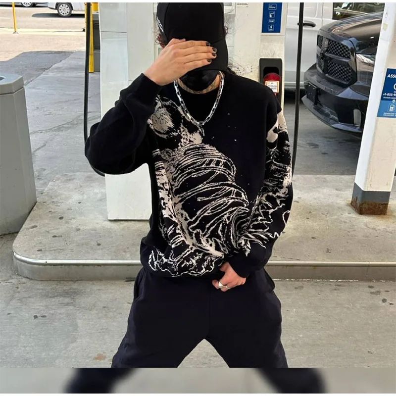 Wiaofellas - Fashion Street Men's Knitted Sweater Casual Loose Round Neck Jacquard Pullover Male Autumn Long Sleeve Jumpers Knitwear