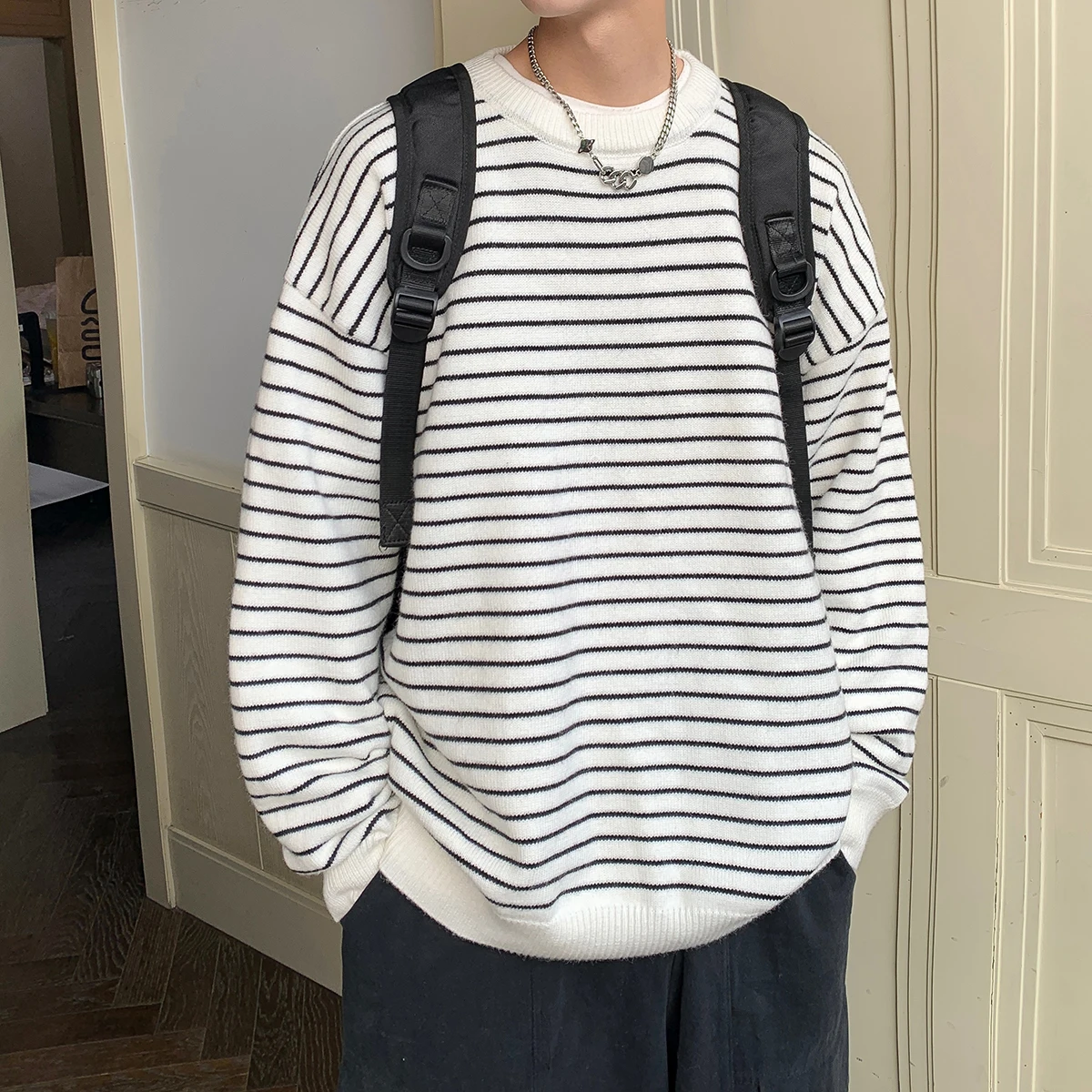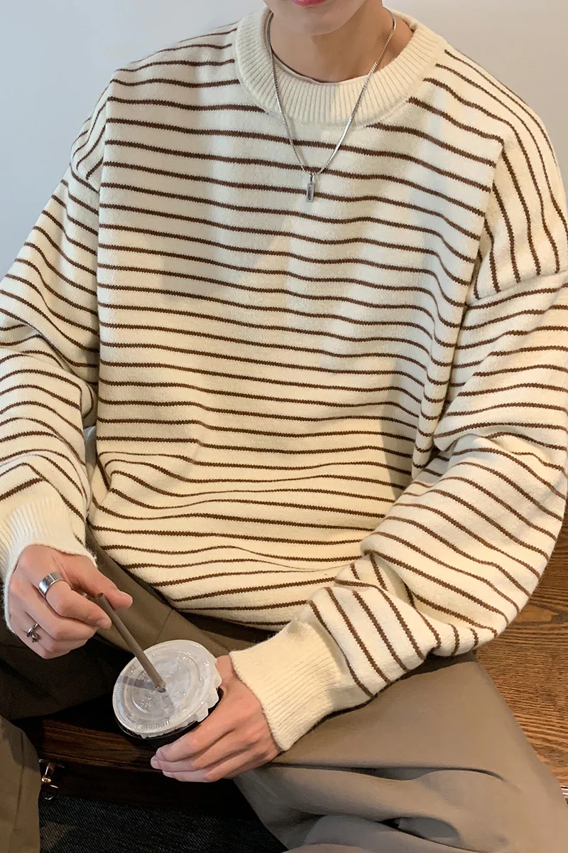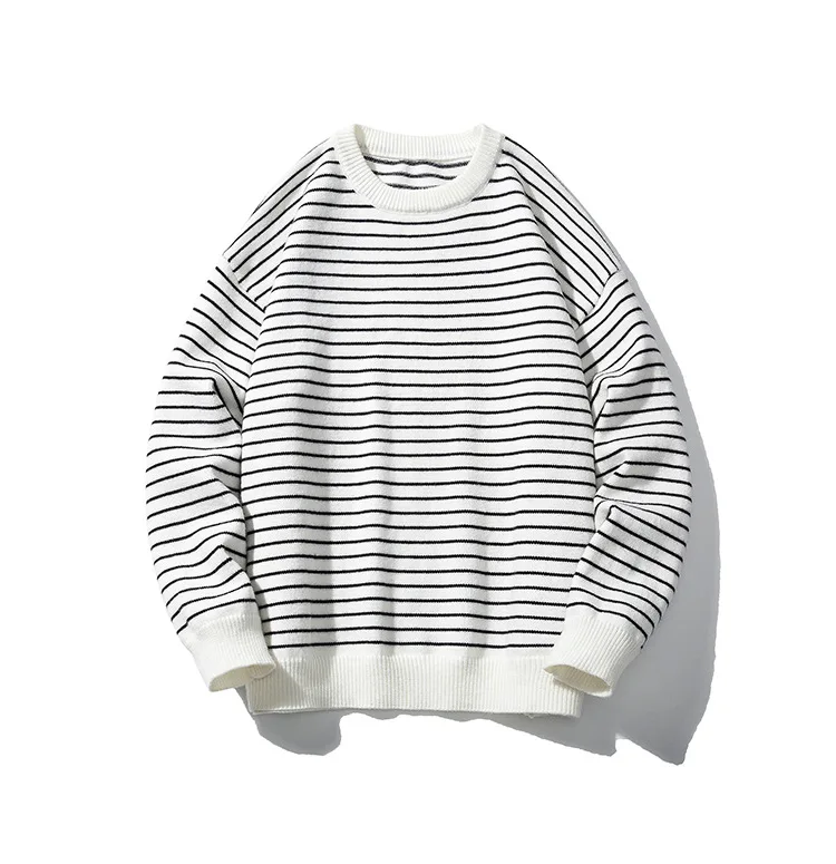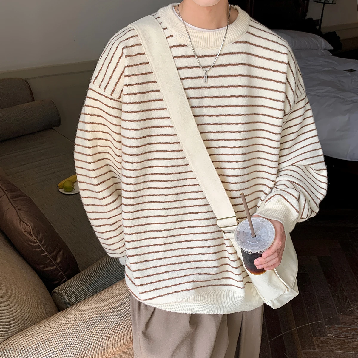 Wiaofellas - Men Striped Sweaters Men Autumn Oversized Fashion O-Neck Knitted Spliced Sweater Male Casual Korean Pullovers M-5XL