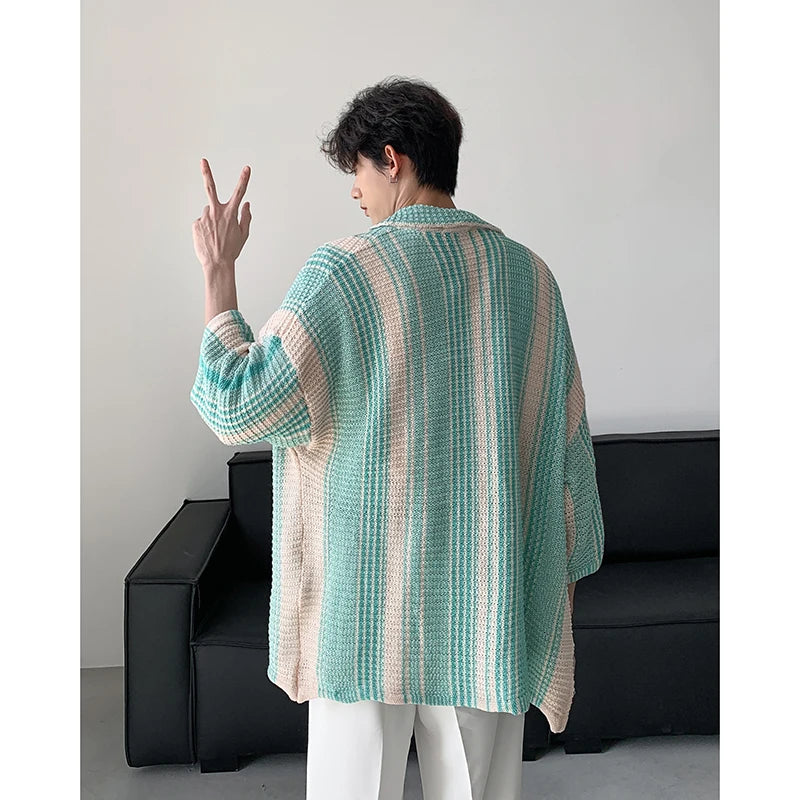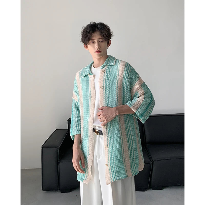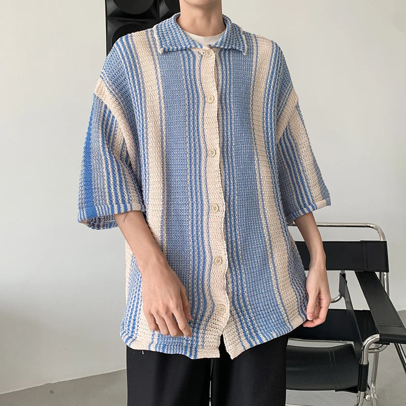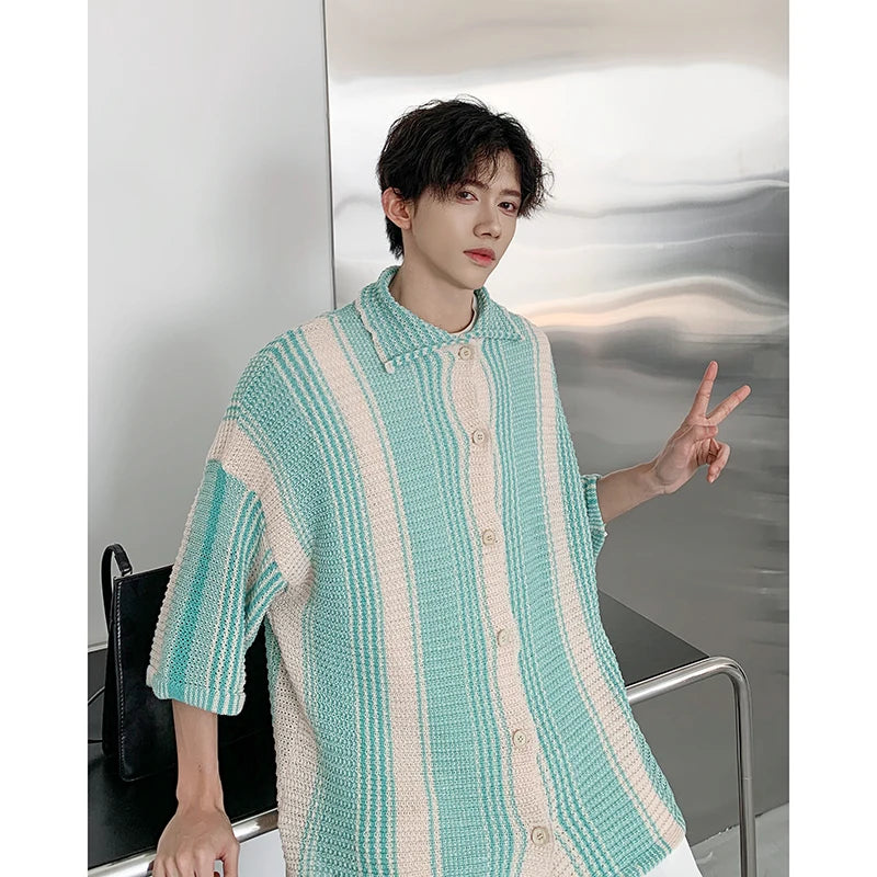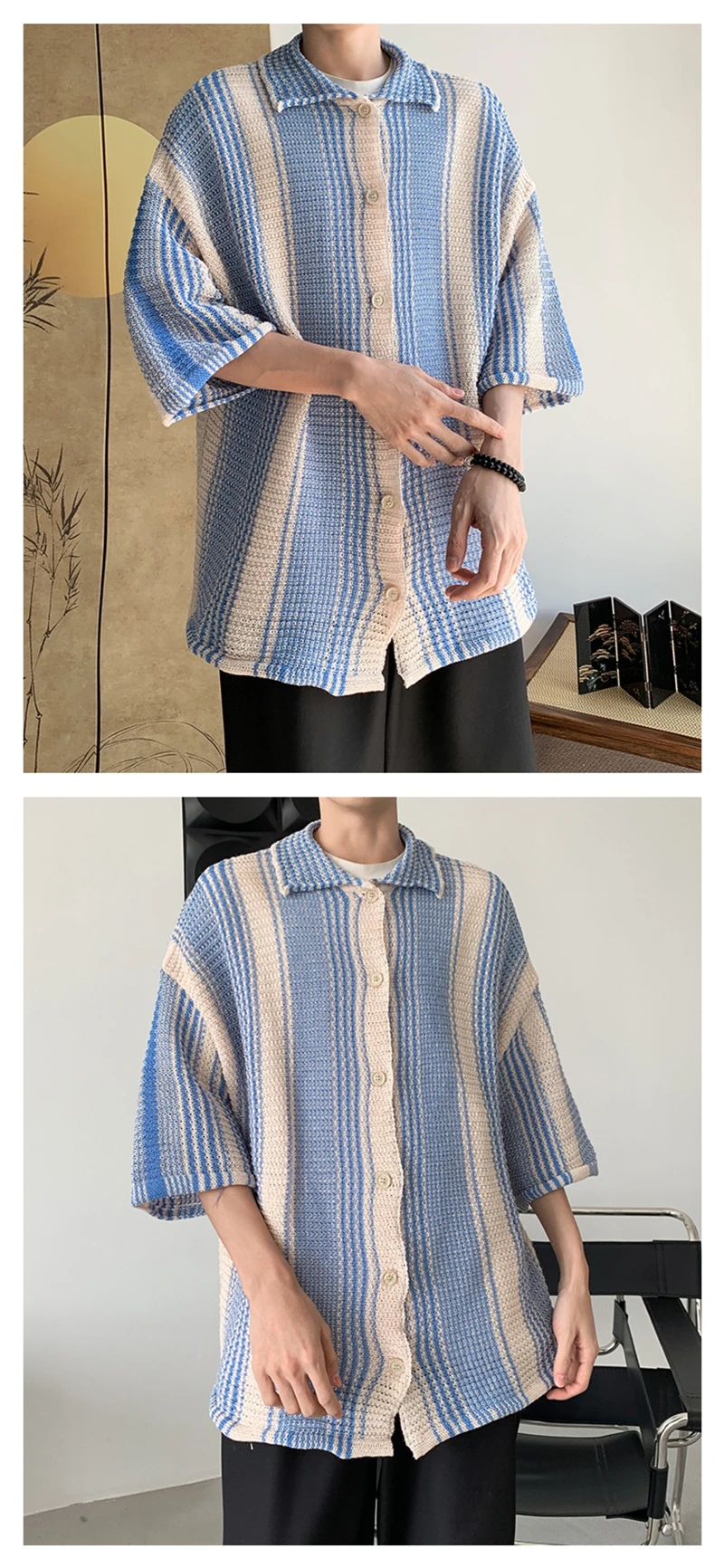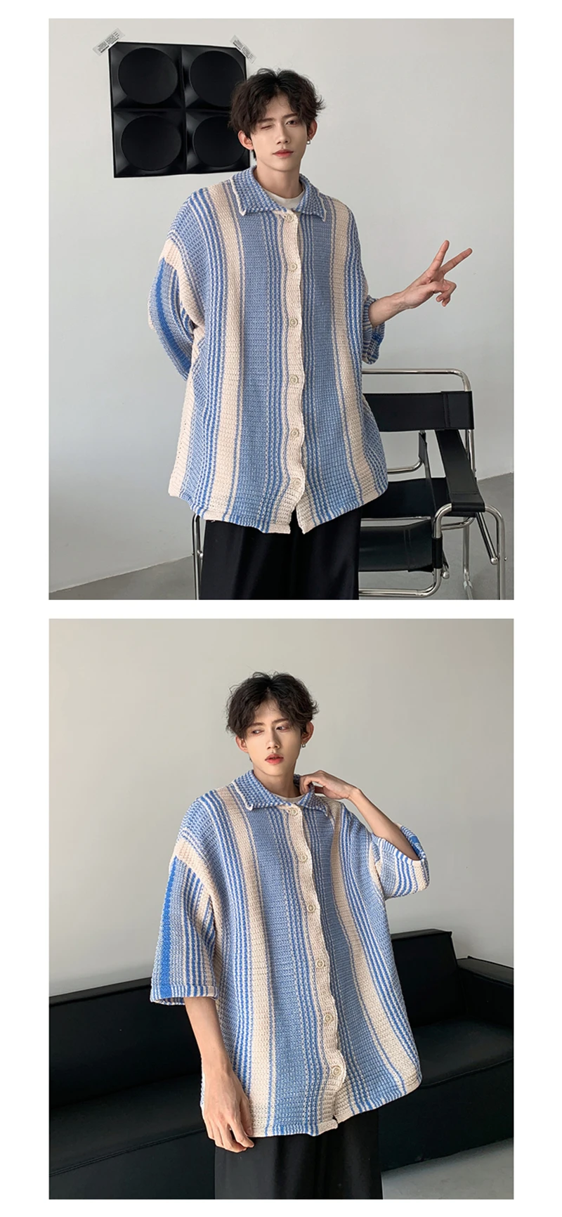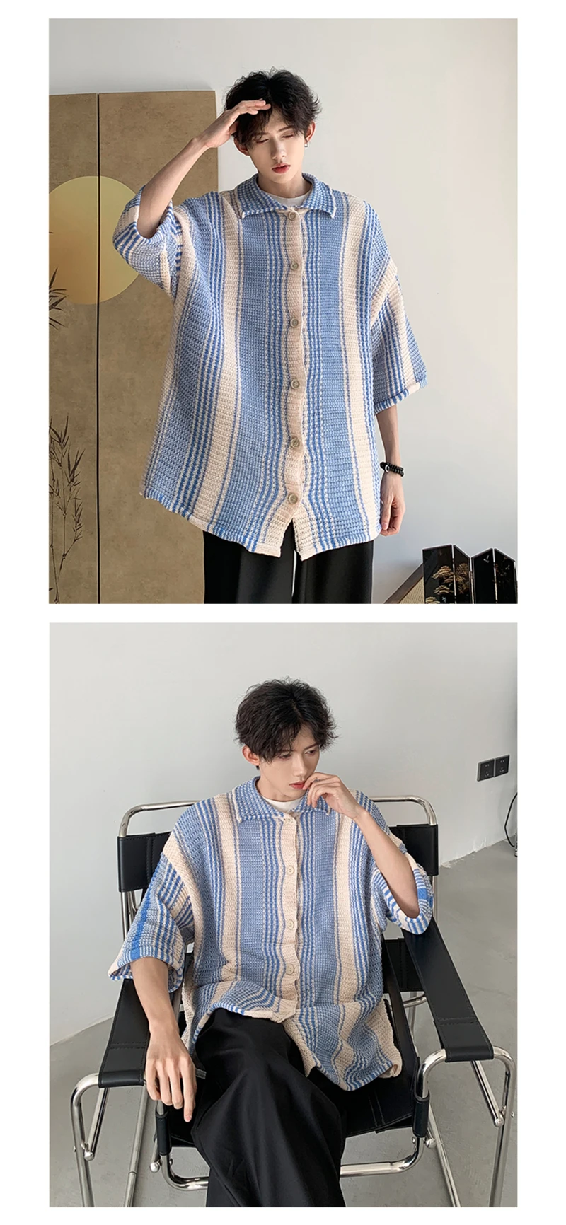 Wiaofellas Summer Short Sleeve Knitted Polo Shirt Casual Men Button-up Turn-down Collar Tops Mens Fashion Striped Polos Man Streetwear