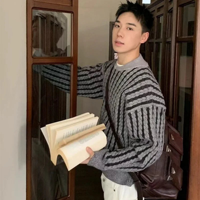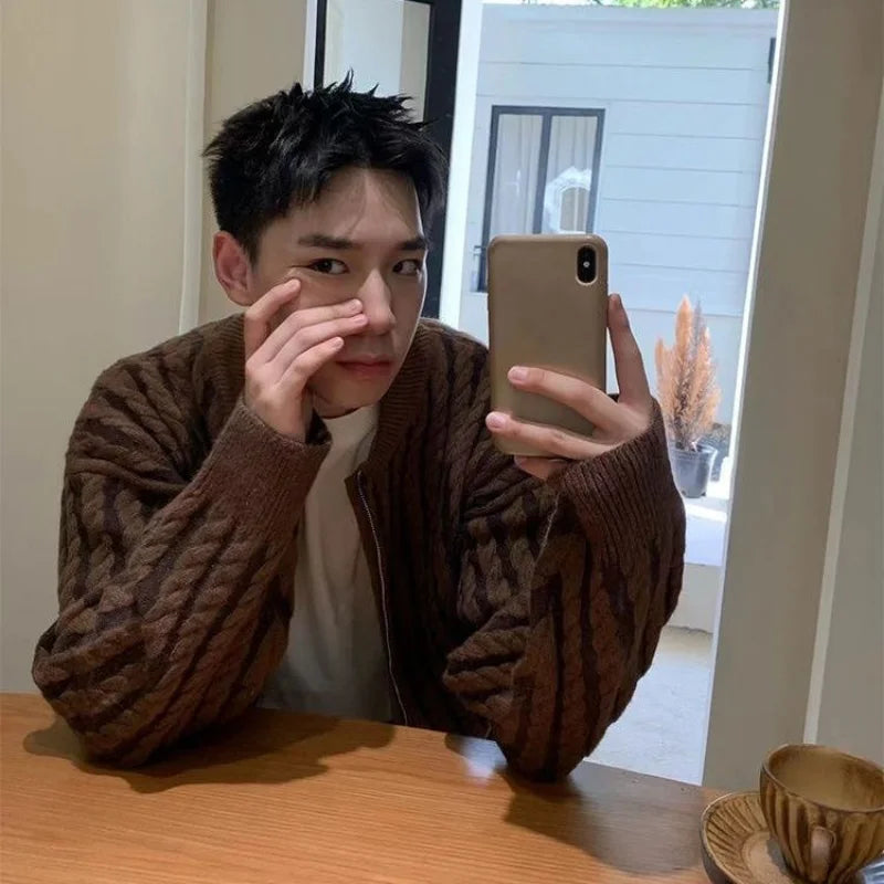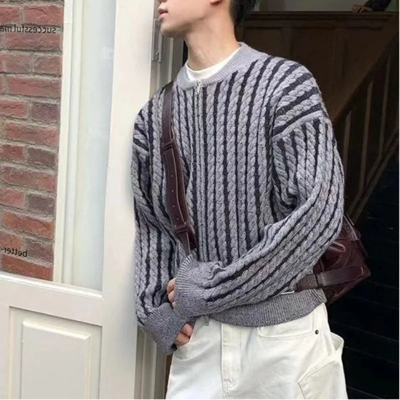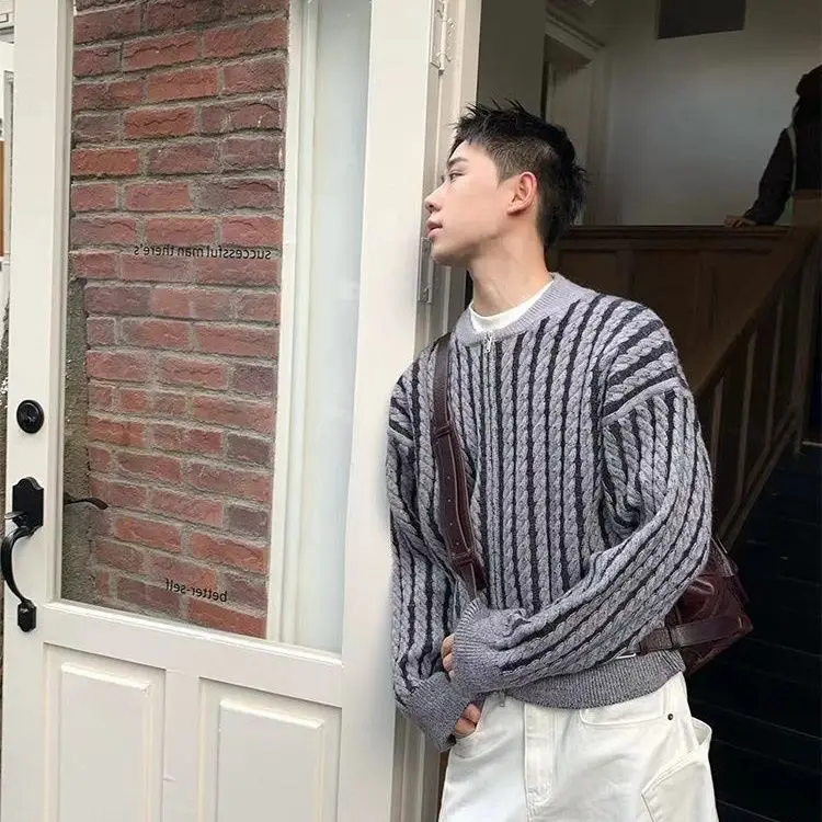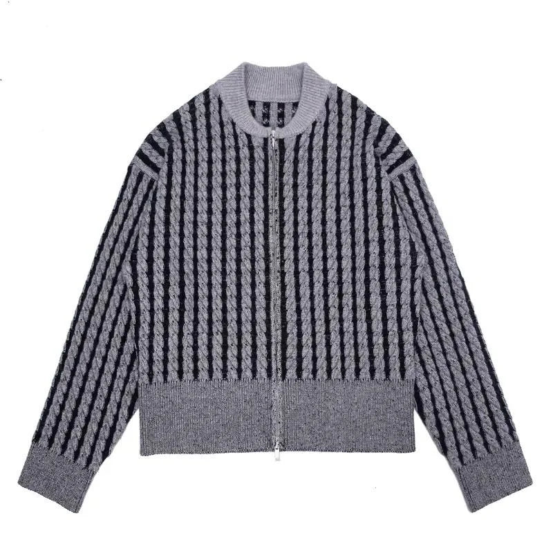 WIAOFELLAS  -  American Retro Contrasting Striped Twisted Zipper Cardigan Knit Sweater Jacket Men and Women Casual Versatile Tops