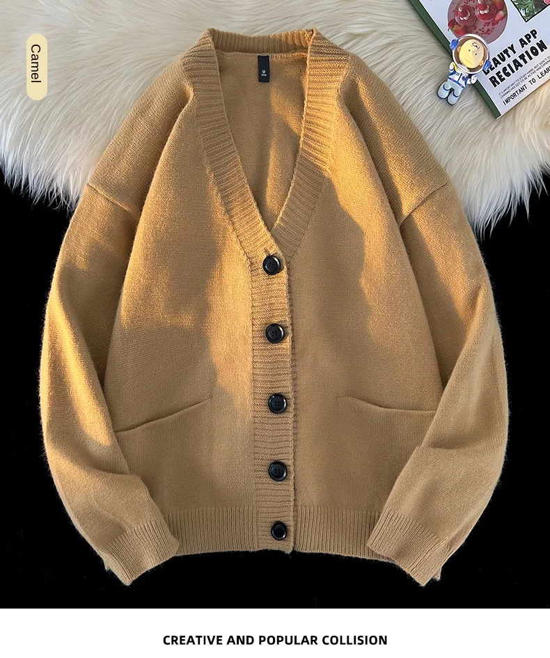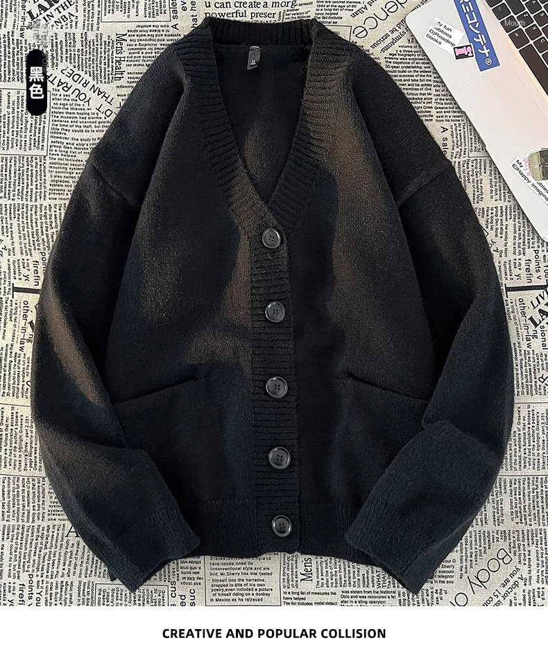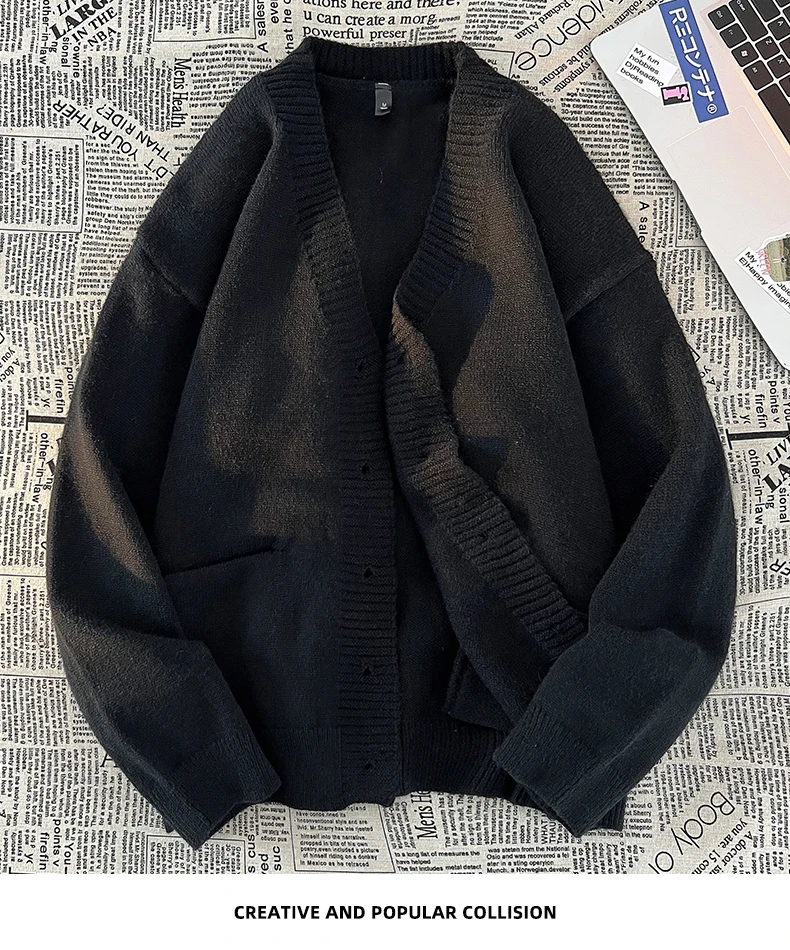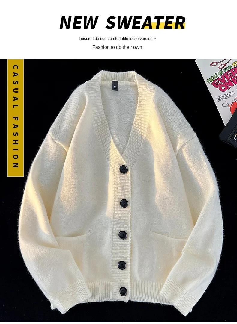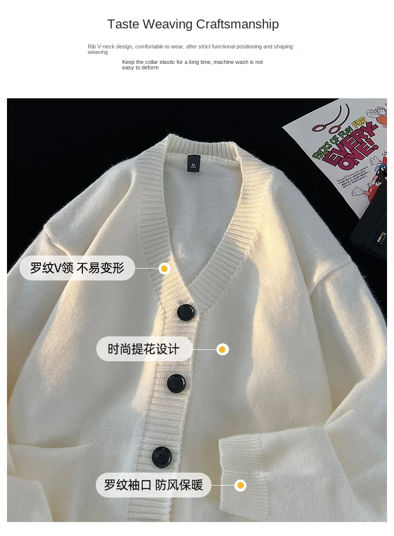 WIAOFELLAS - Autumn and Winter New Korean Fashion Versatile Casual Cardigan Ribbed V-neck Sweater Jacket Men's Light Jacquard Design Jacket
