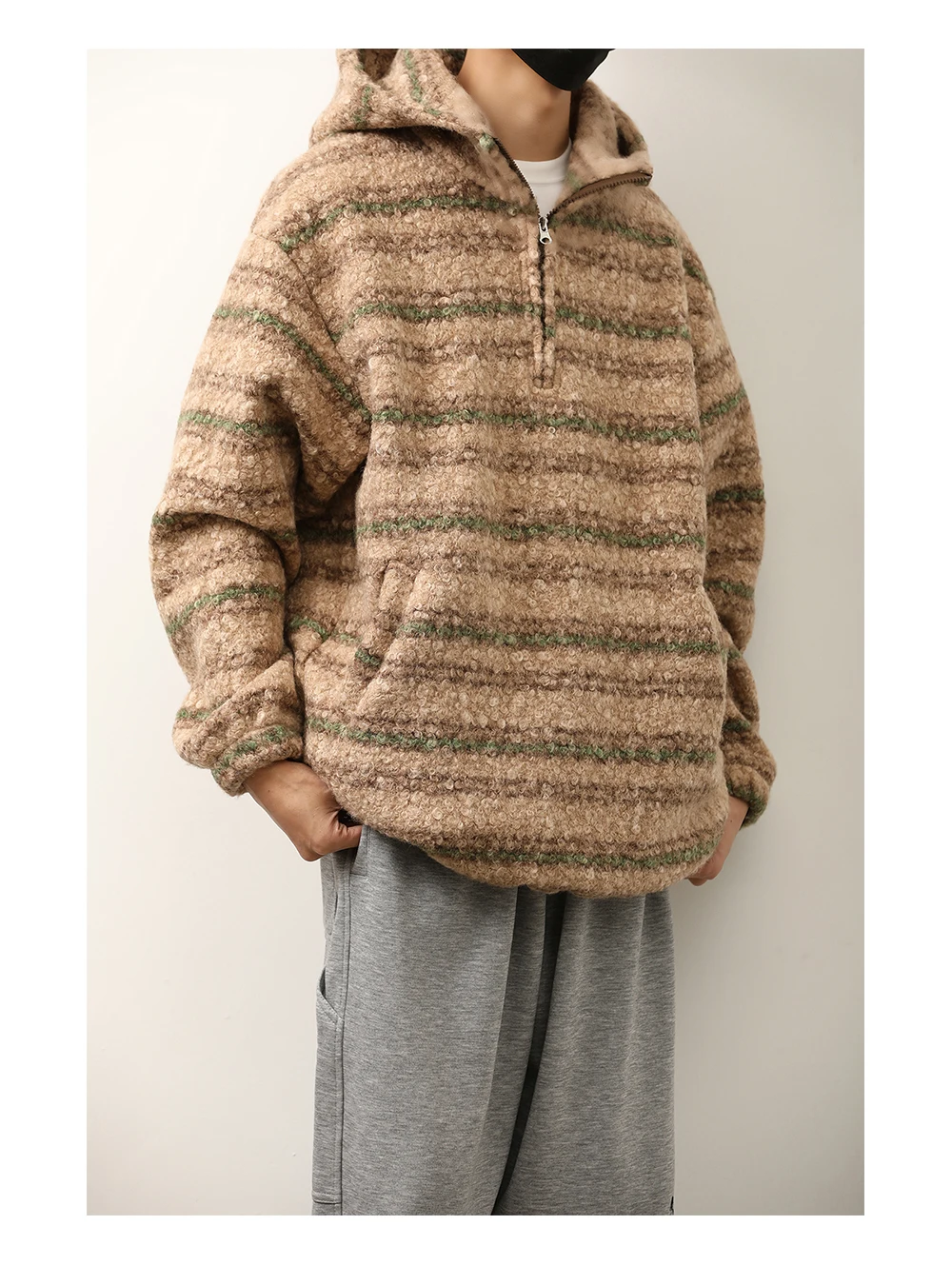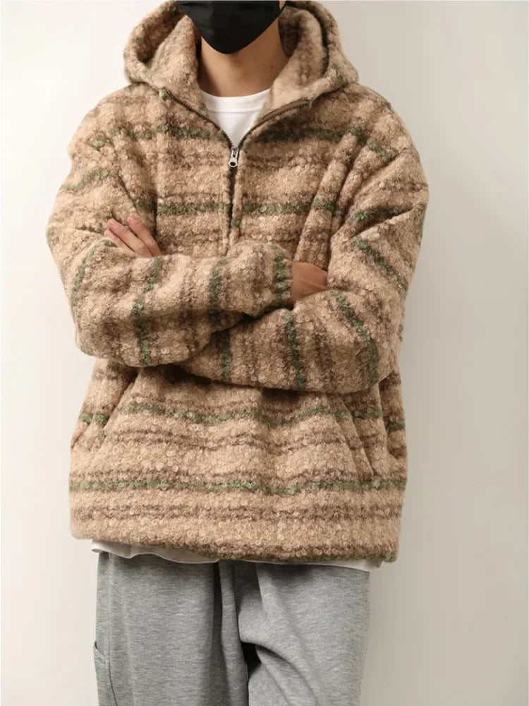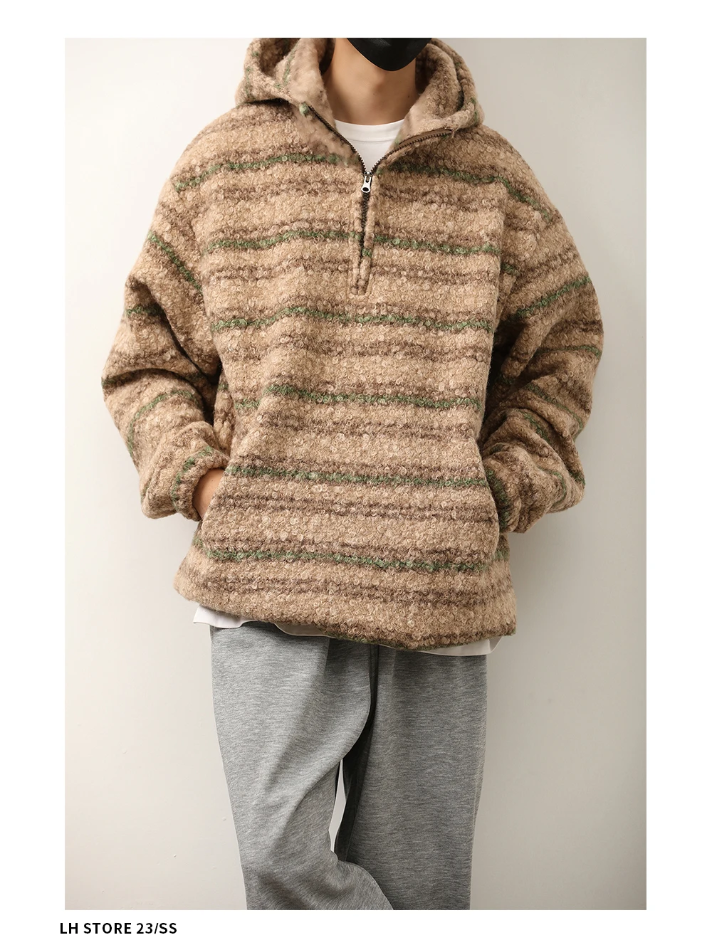 WIAOFELLAS - Autumn Winter Hooded Sweaters for Men Japanese Trendy Loose Casual Thickened Striped Pullover Harajukuhigh Street Long Sleeved