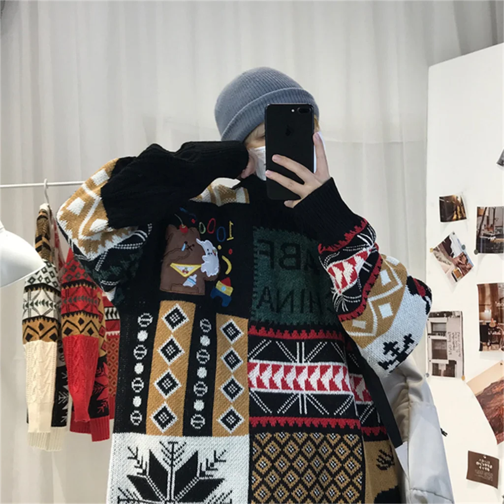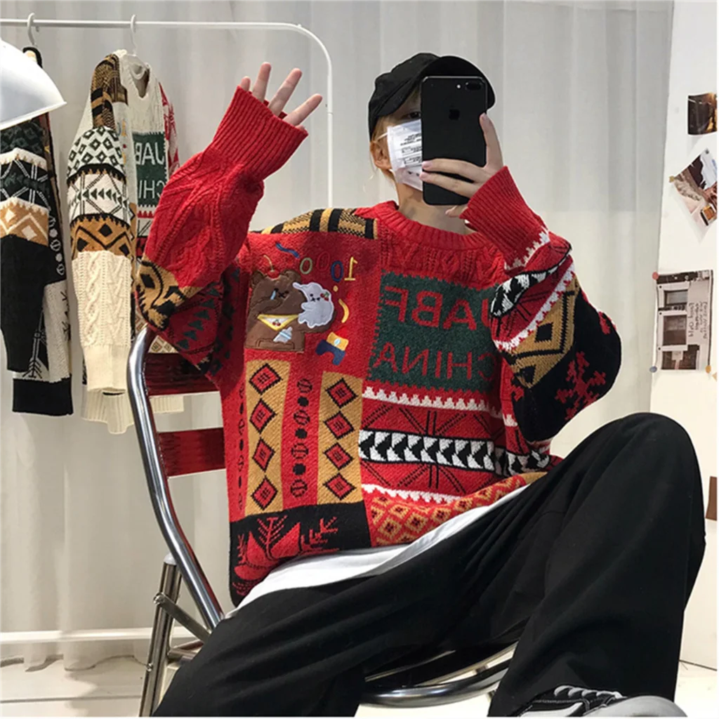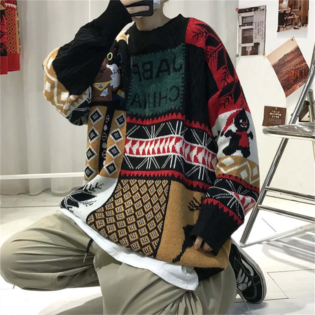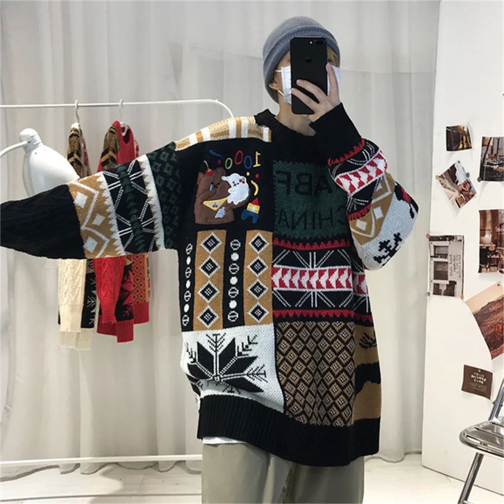 WIAOFELLAS - Christmas Sweater Men Fashion Cartoon Animal Embroidery Pullovers Gengar New Year Streetwear Clothing New Knitted Sweater Unisex
