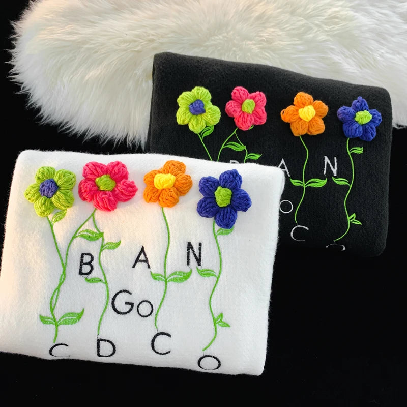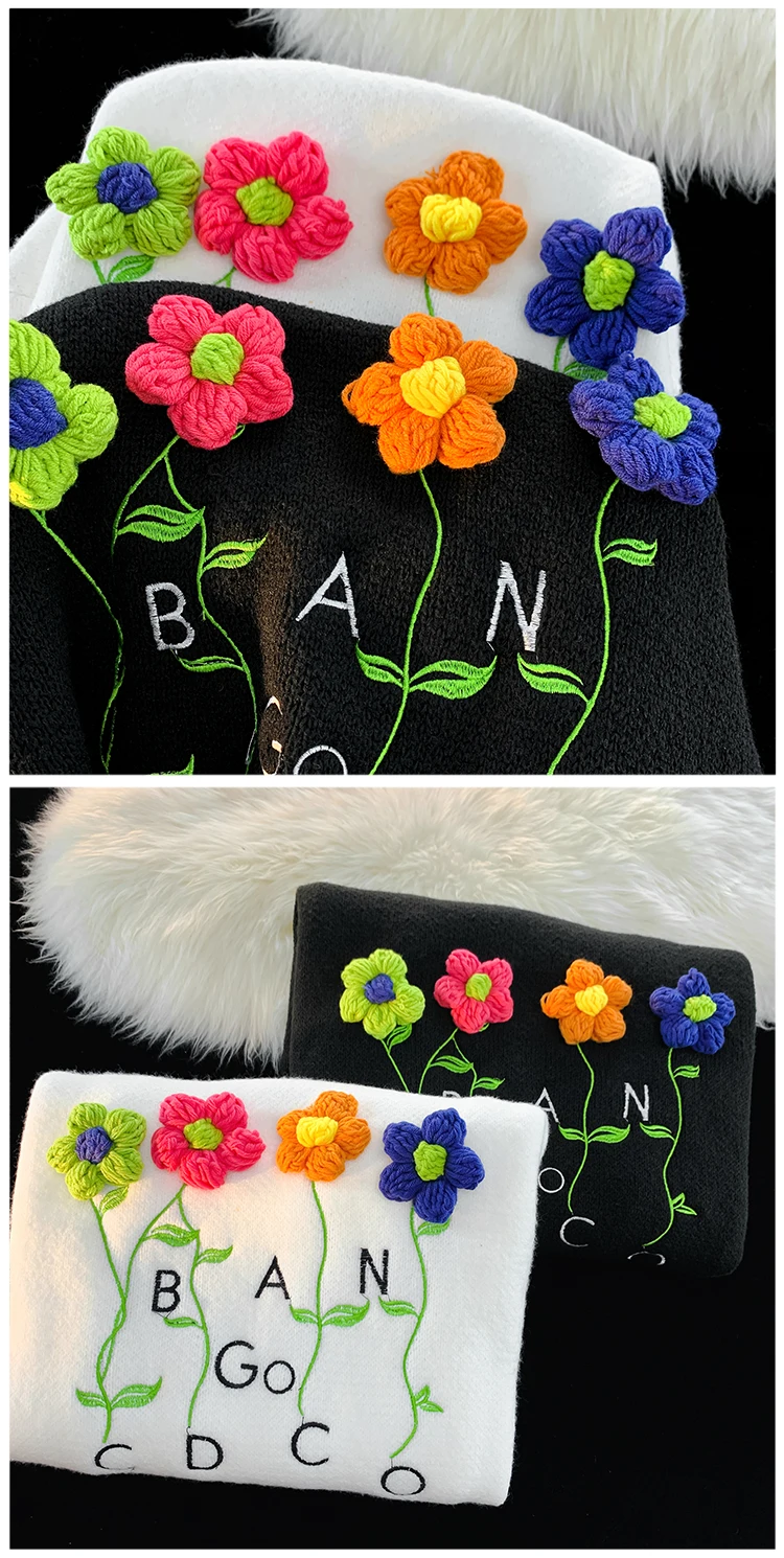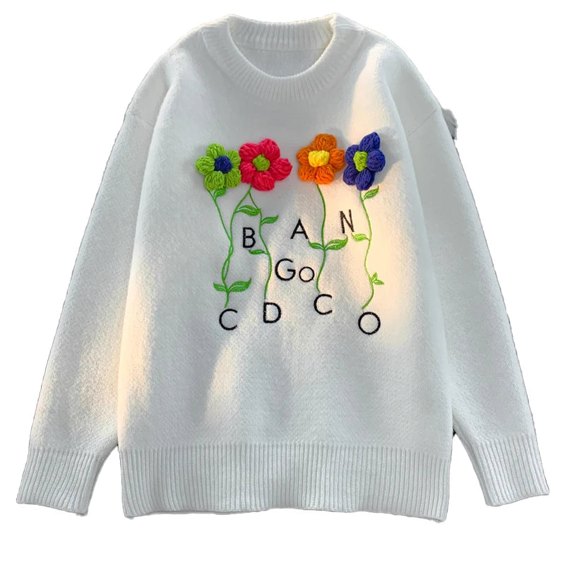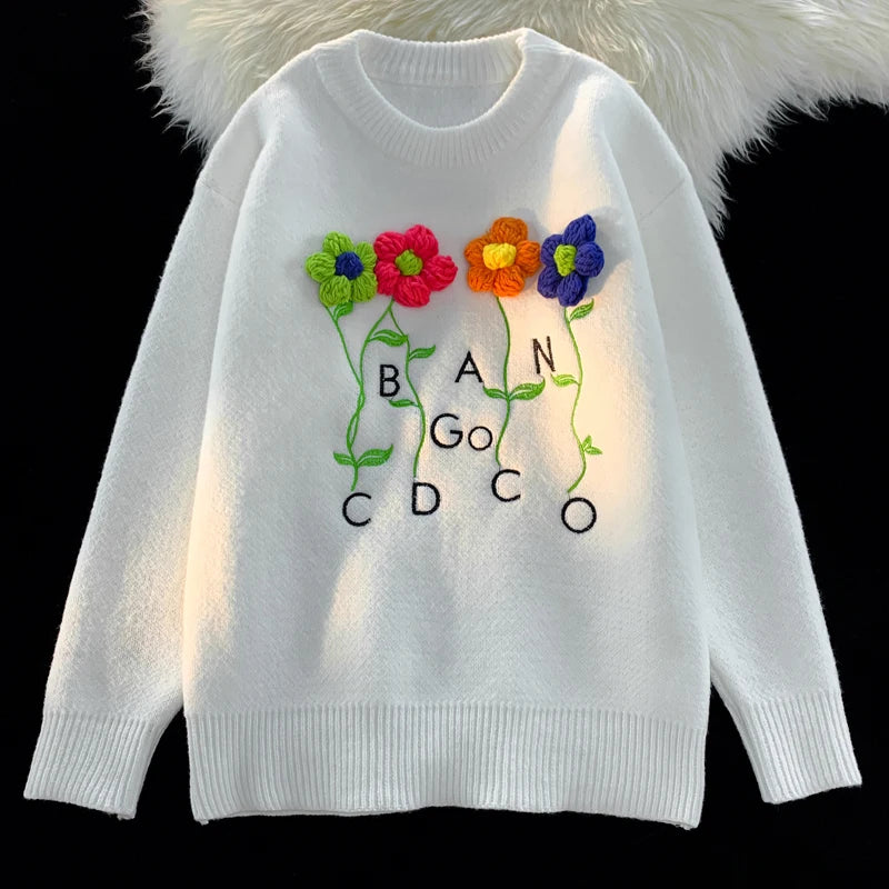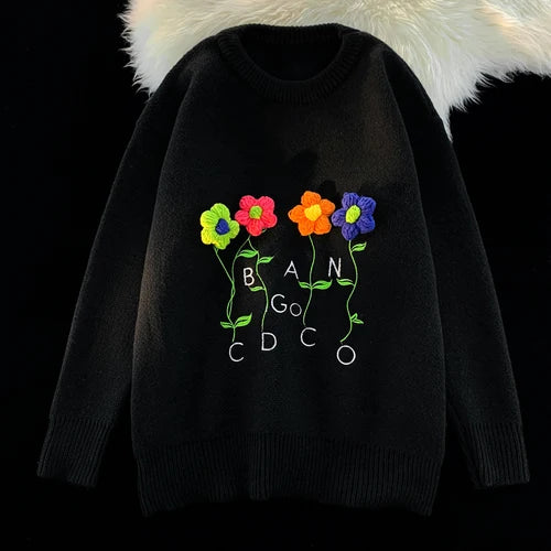 WIAOFELLAS - Harajuku Oversized Knitted Sweater Men Floral Embroidery Jumpers Japanese Fashion O-Neck Streetwear Couple Unisex Knitwear E173