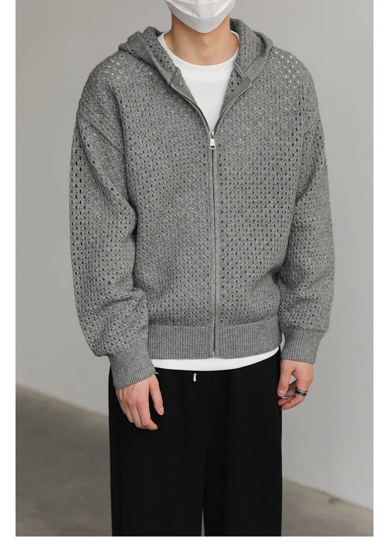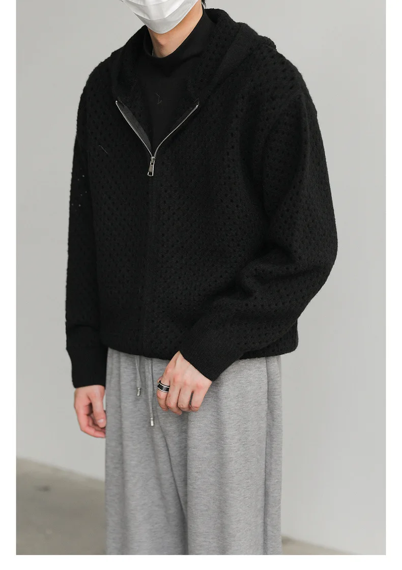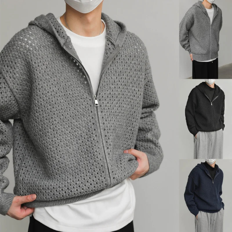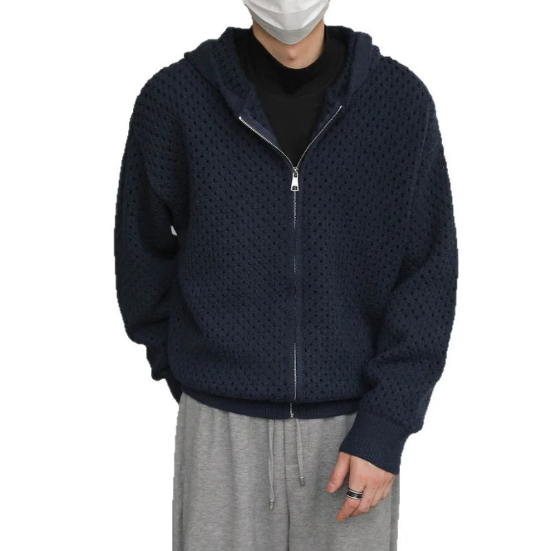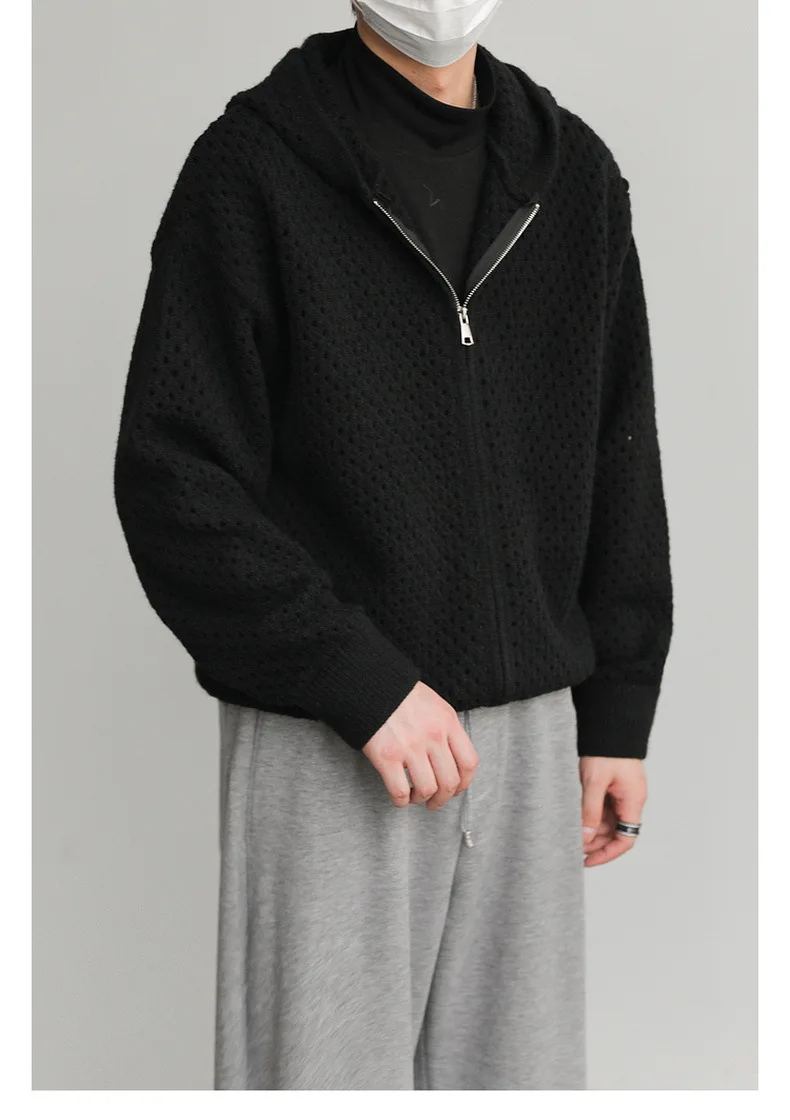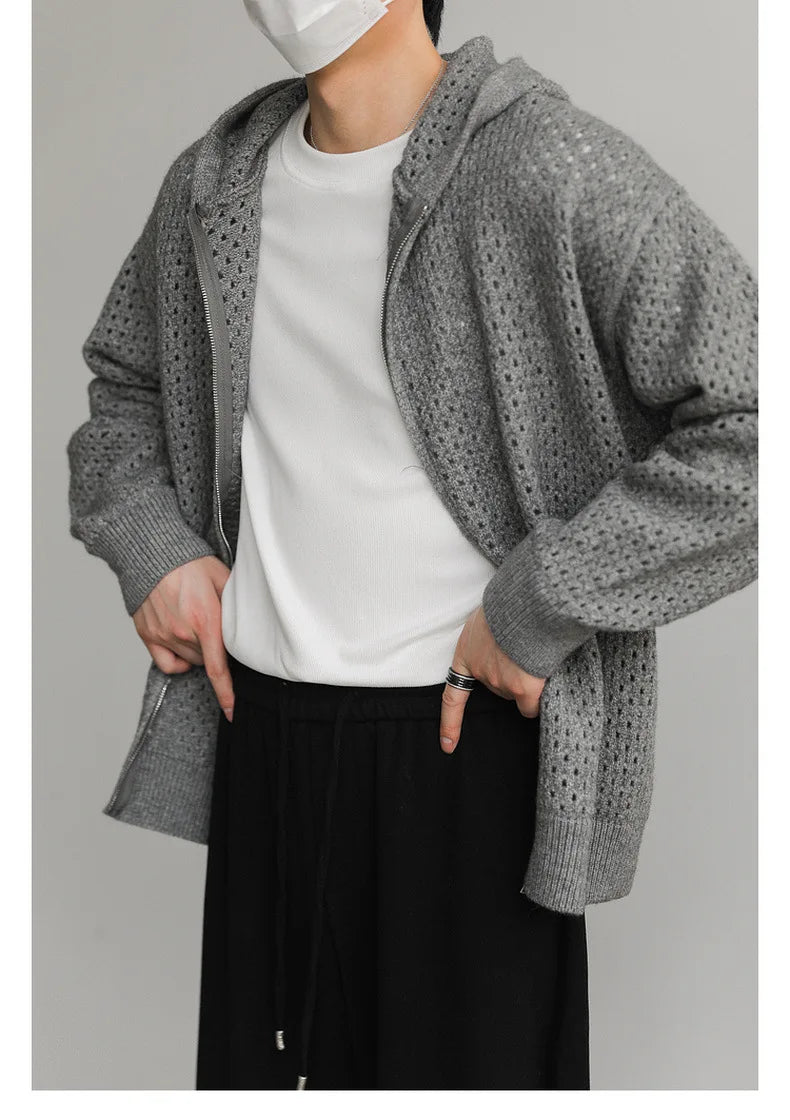 WIAOFELLAS - Hollow Hooded Knitted Cardigan Sweater Men's Spring and Autumn New Couple's Jacket Casual Versatile Fashion Top