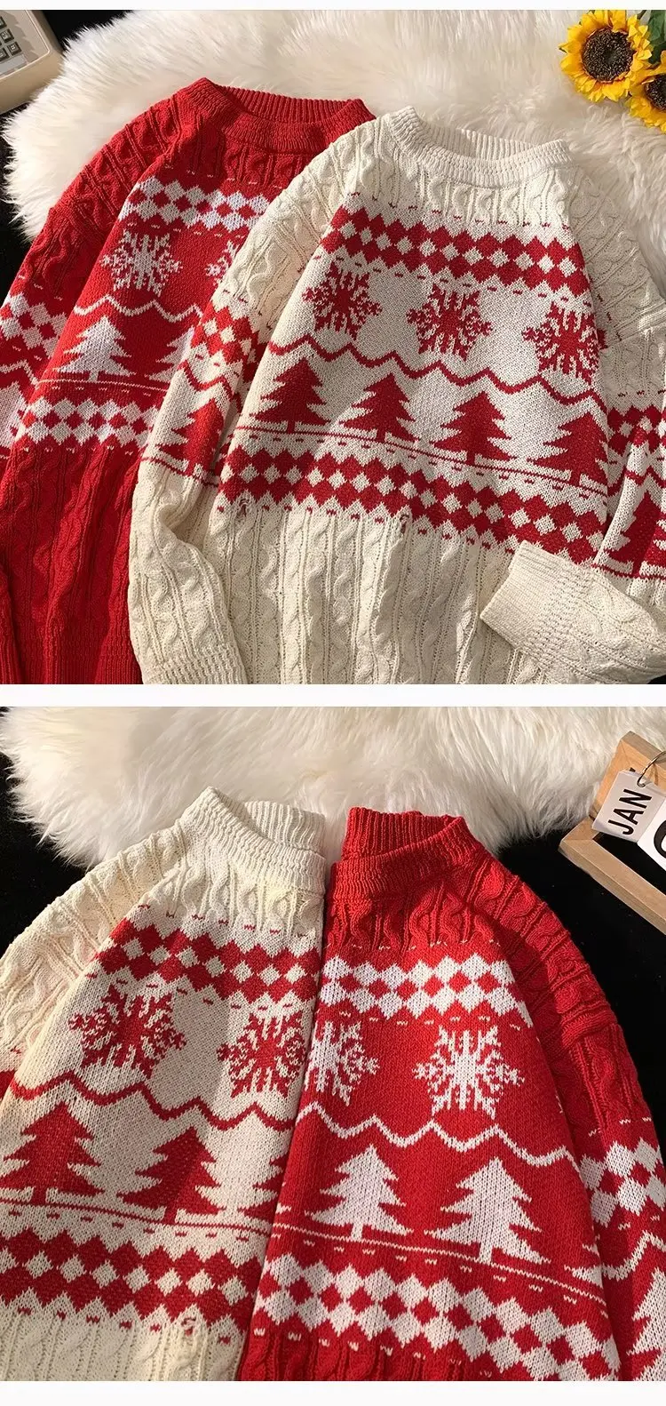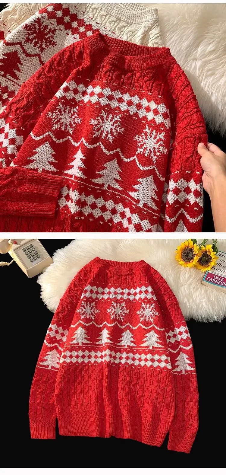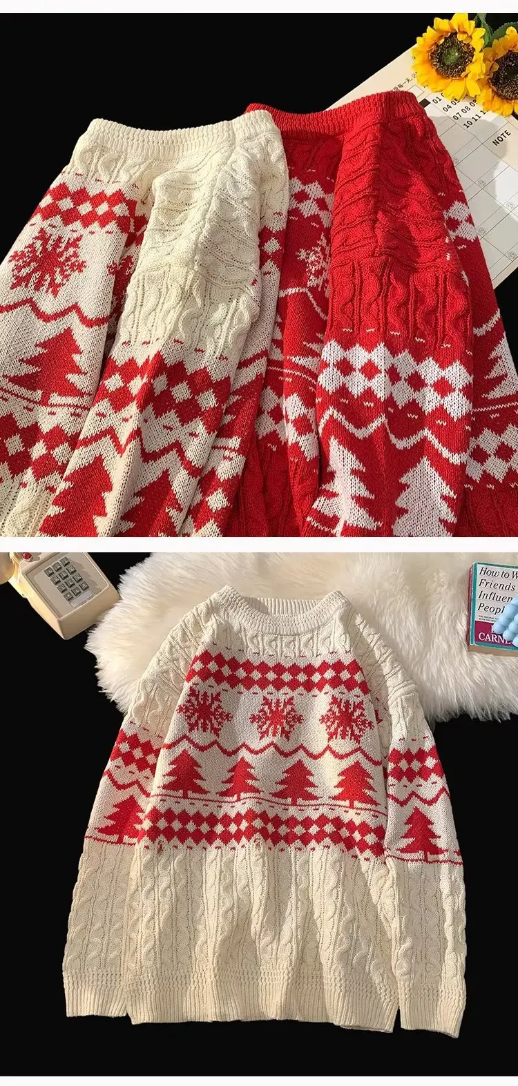 WIAOFELLAS - Japanese Retro Diamond-shaped Christmas Sweater Men and Women Couple Winter Pullover Knitted Sweater Top