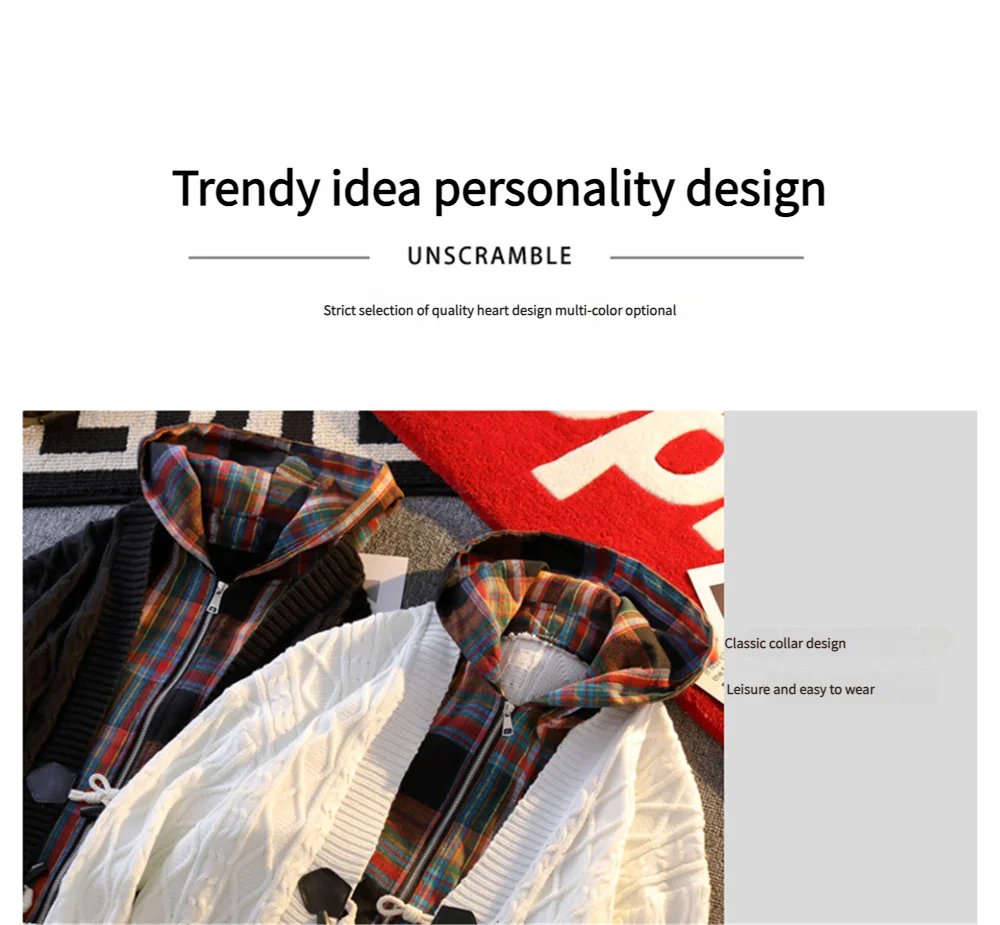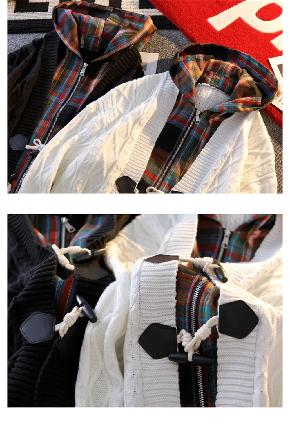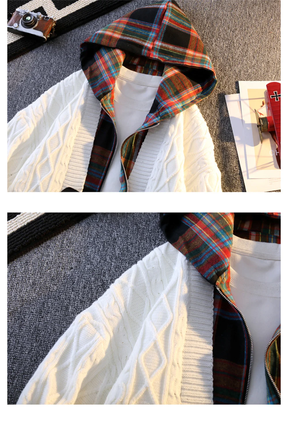 WIAOFELLAS  -  Korean Casual Checkered Hooded Sweater Holiday Style Fake Two-piece Jacket for Men New Autumn and Winter Cardigan for Teenagers