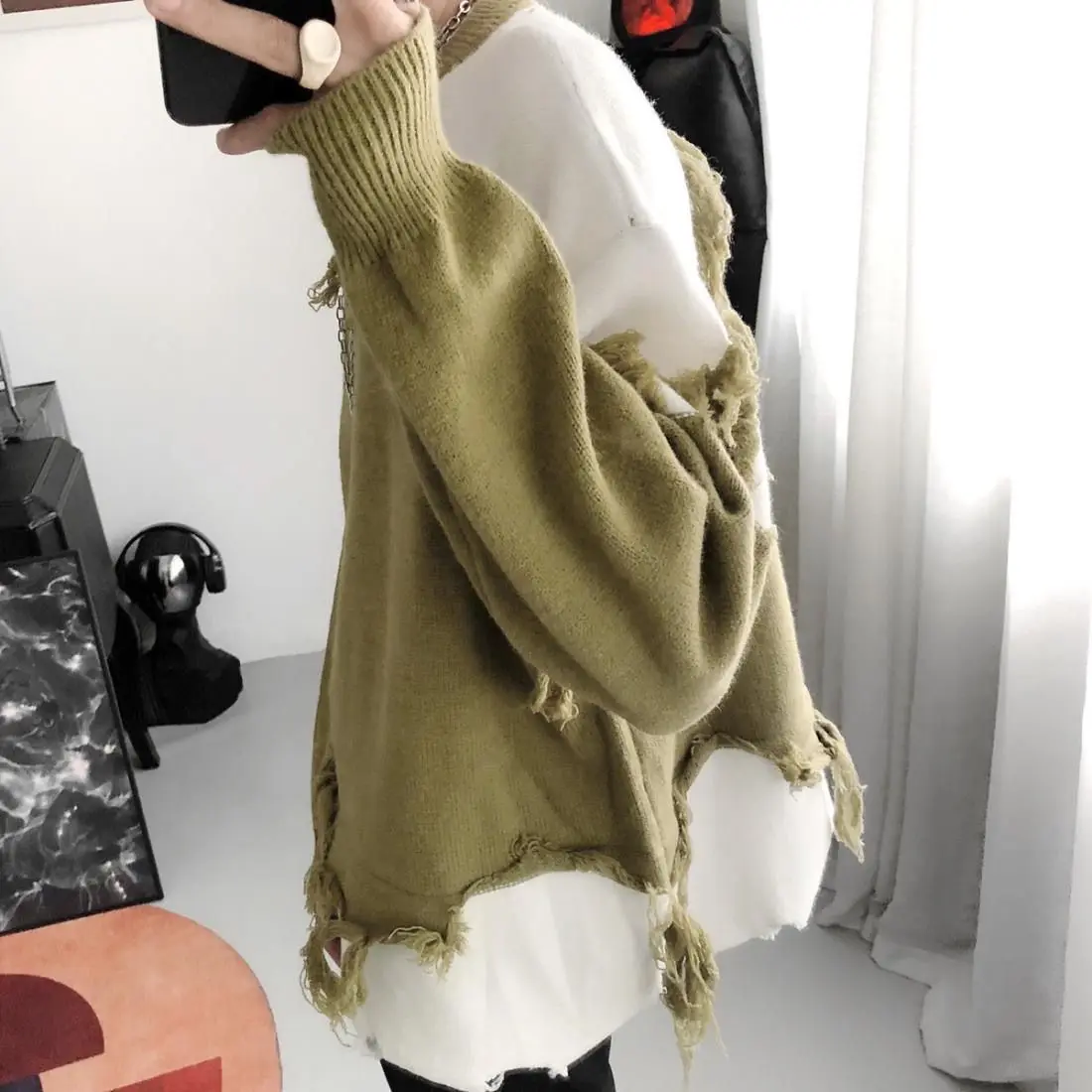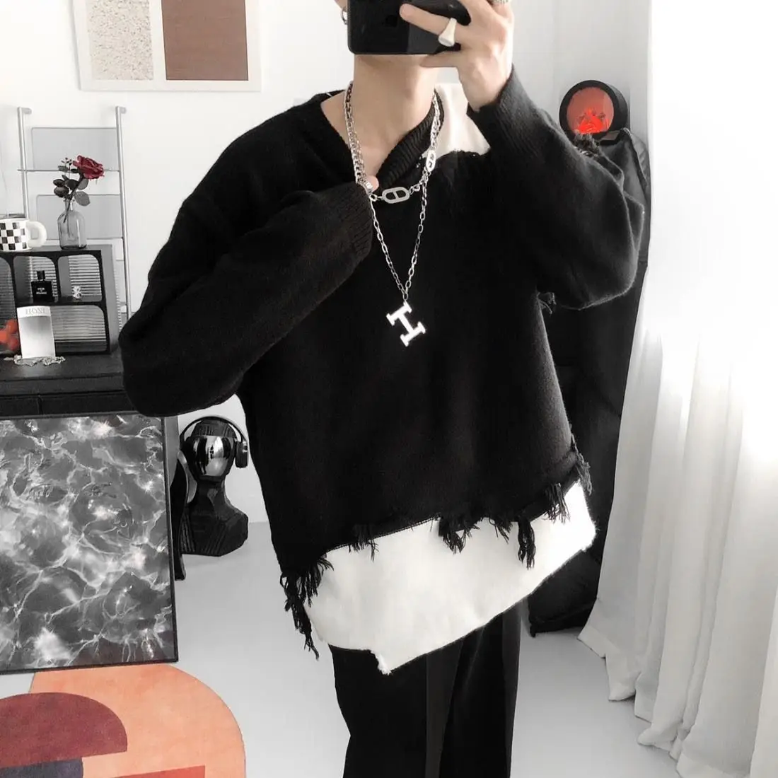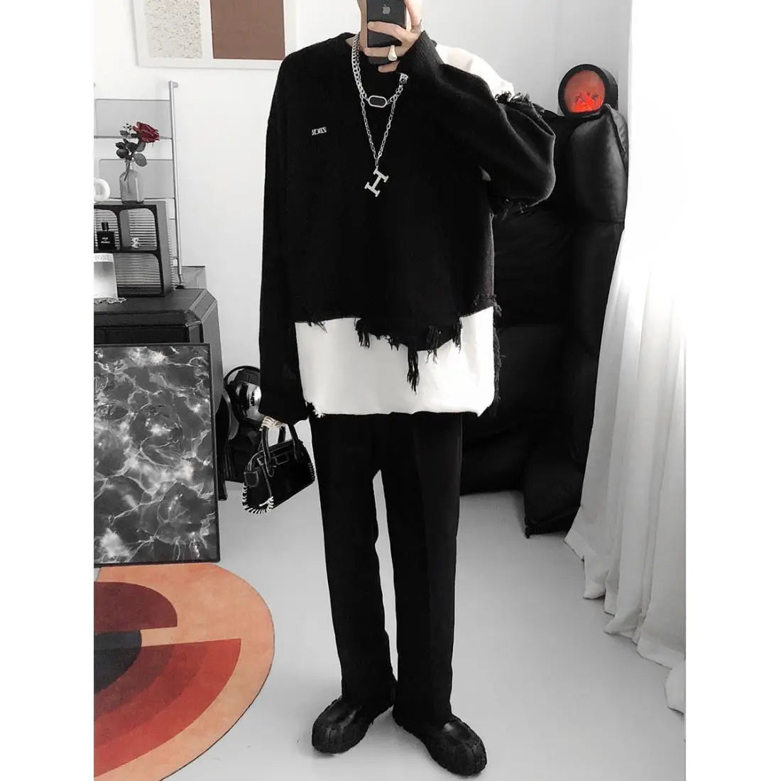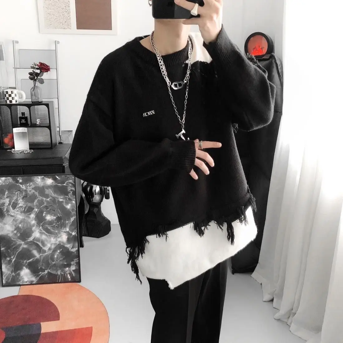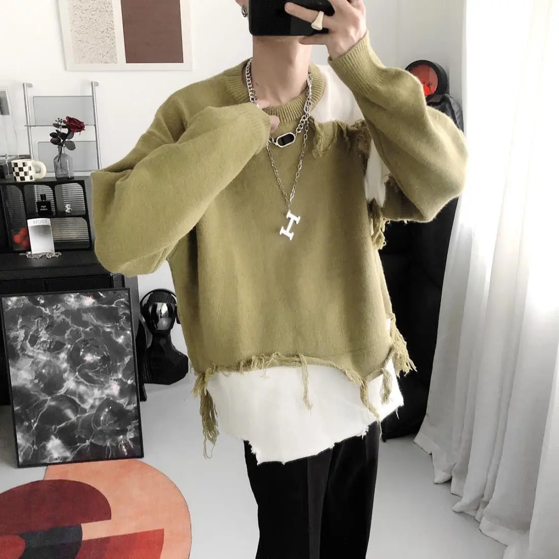 WIAOFELLAS - Korean Design Sense Irregular Sweater Men's American Retro Tassel Lazy Style Loose and Cool Men's Knitted Sweater Trend