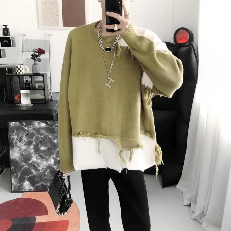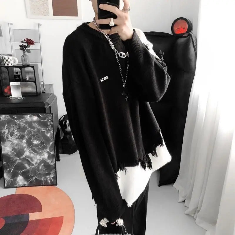 WIAOFELLAS  -  Korean Design Sense Irregular Sweater Men's American Retro Tassel Lazy Style Loose and Cool Men's Knitted Sweater Trend