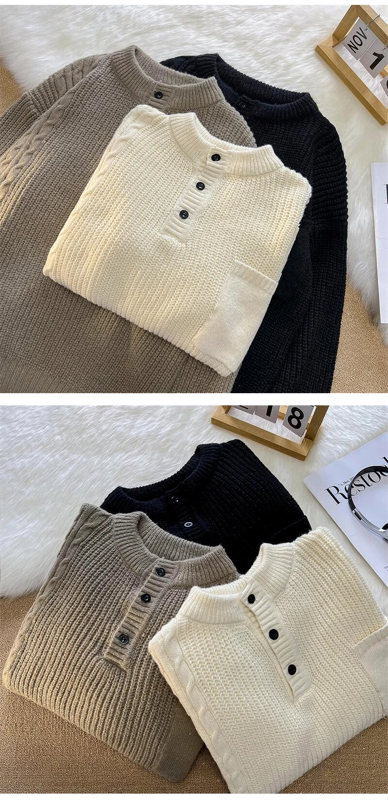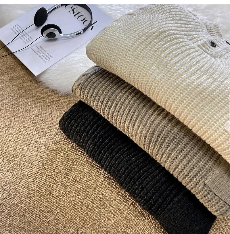 WIAOFELLAS - Men Autumn Winter New Solid Color Sweater Tops Men's Loose Long-sleeved Jumpers Male O-neck Pocket Knitted Tops P157