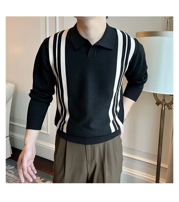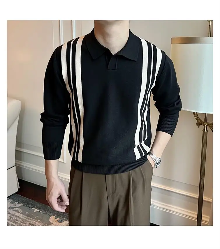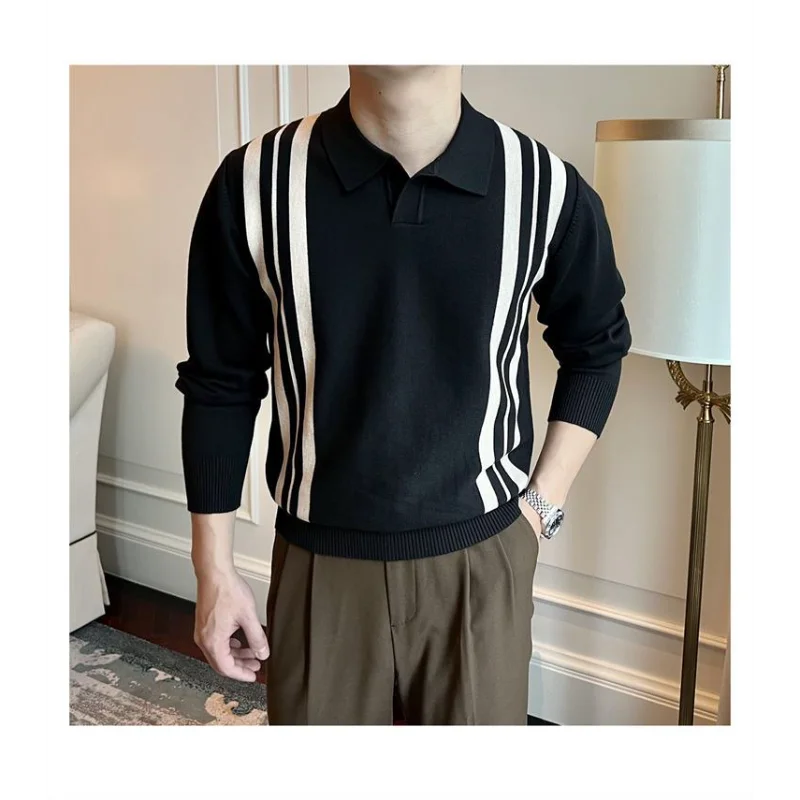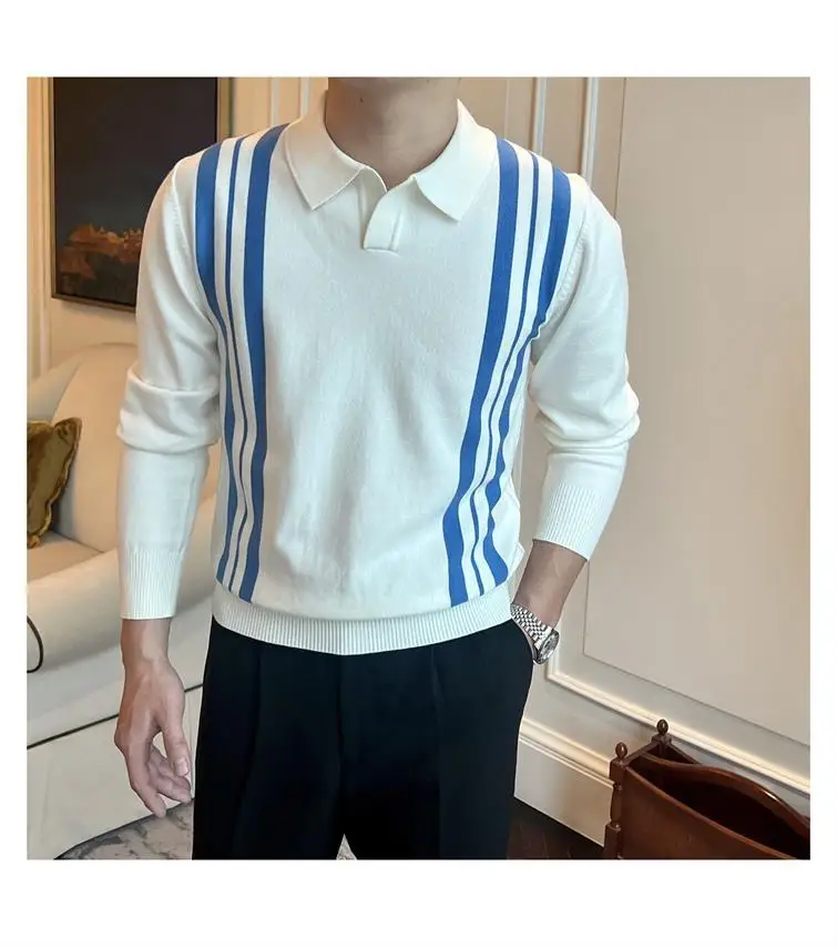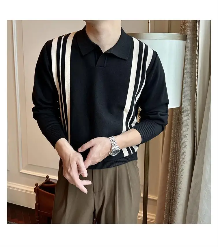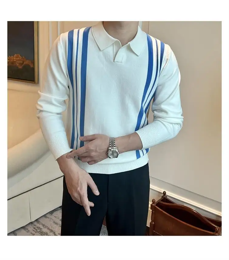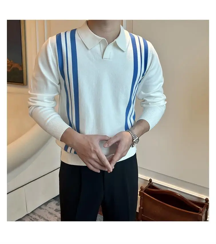 WIAOFELLAS  -  Men's Spring Autumn New Sweater British Retro Stripe Color Block Slim Fit Fashion Elegant Business Casual Knitted Top