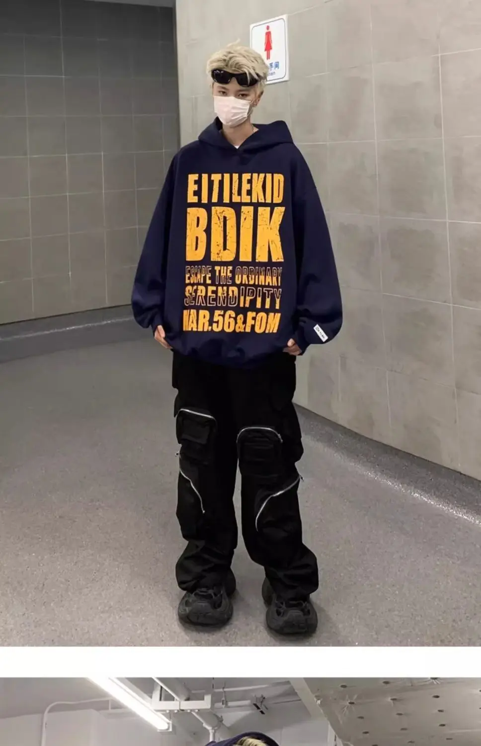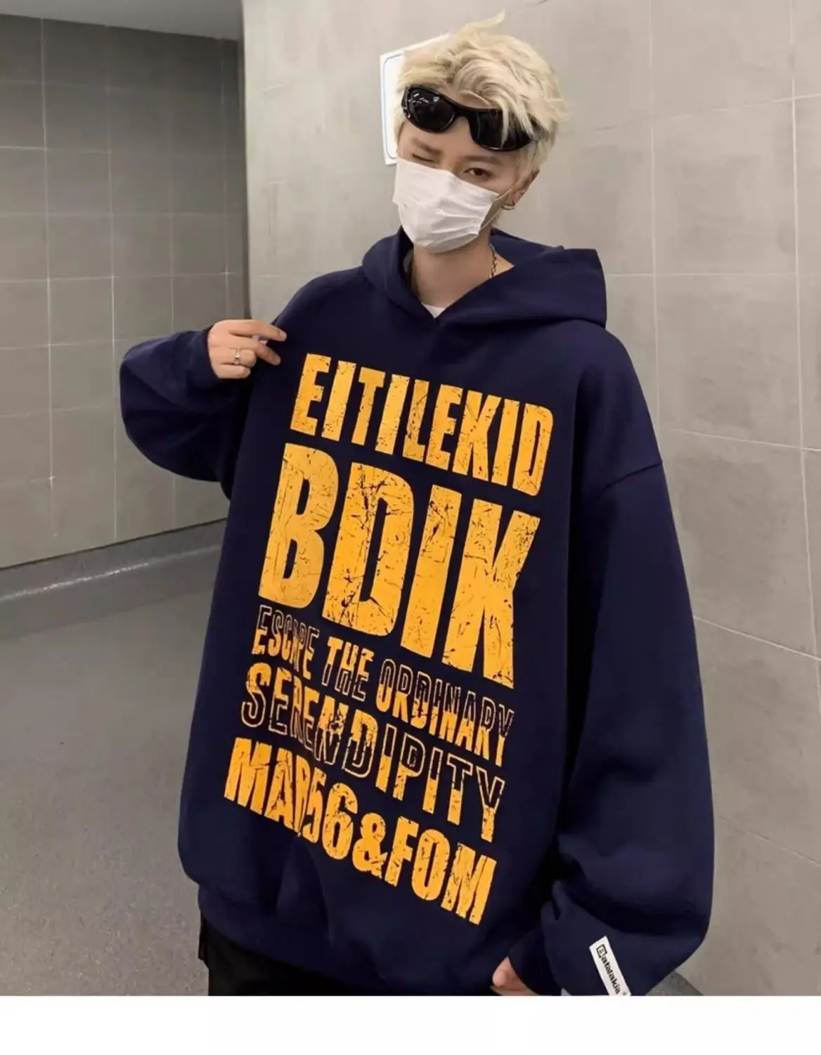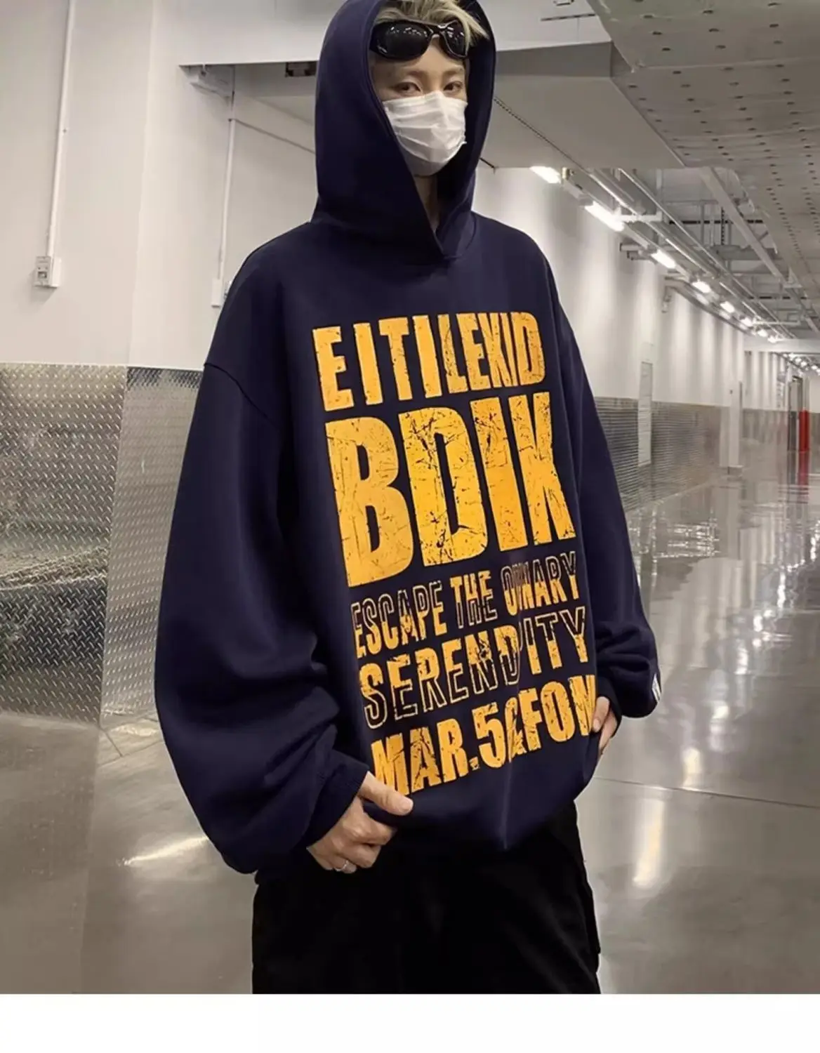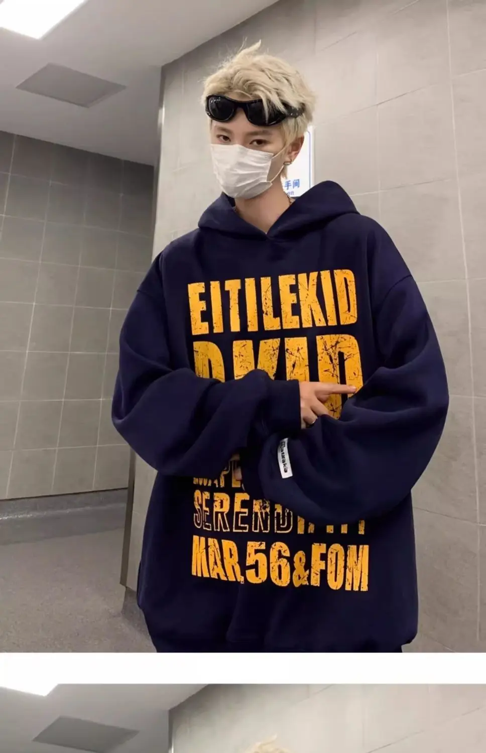 WIAOFELLAS - Navy Heavy Weight Sweater Men's American Retro High Street Hip-hop Couple Coat Oversize China-Chic Top