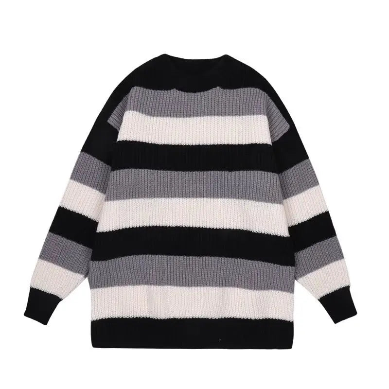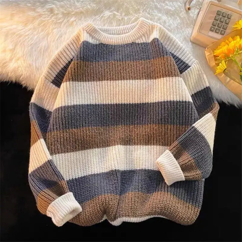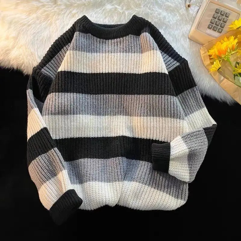 WIAOFELLAS - New Autumn and Winter Fashion Hong Kong Stripe Contrast Round Neck Long Sleeve Casual Loose Thickened Knitted Sweater