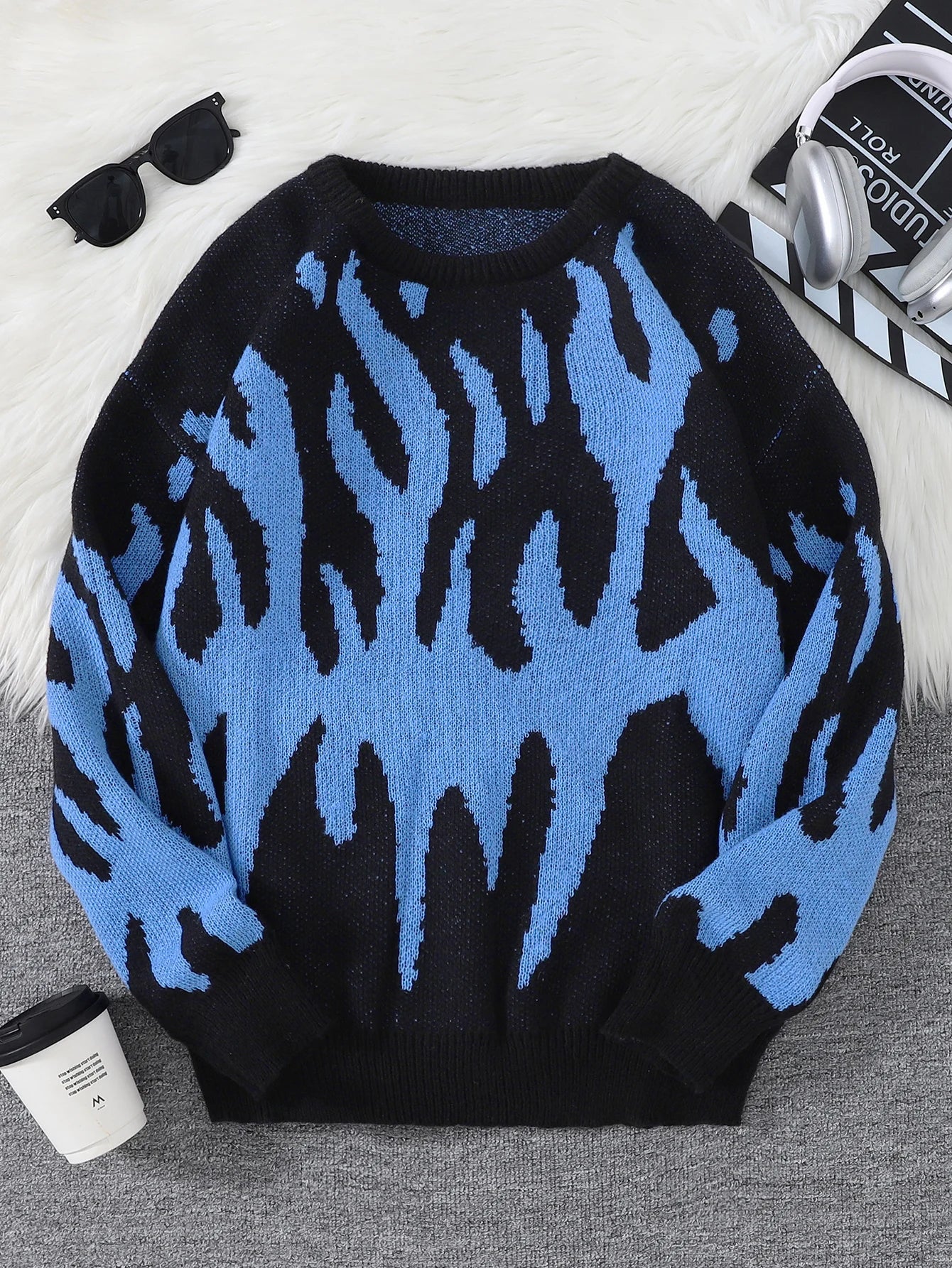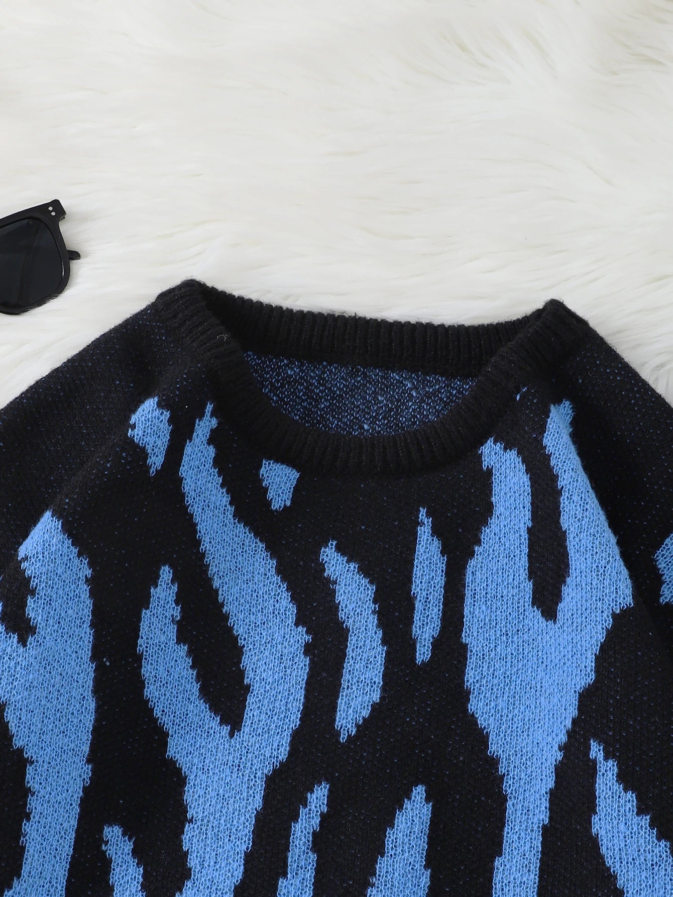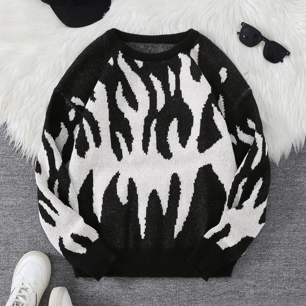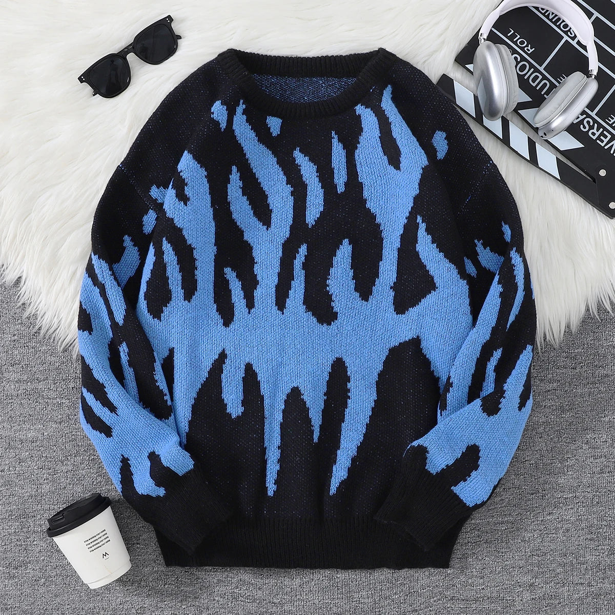 WIAOFELLAS  -  New Popular Fire Pattern Pullover Ripped Sweater Casual Round Neck Knitted Men's Gift Pullover