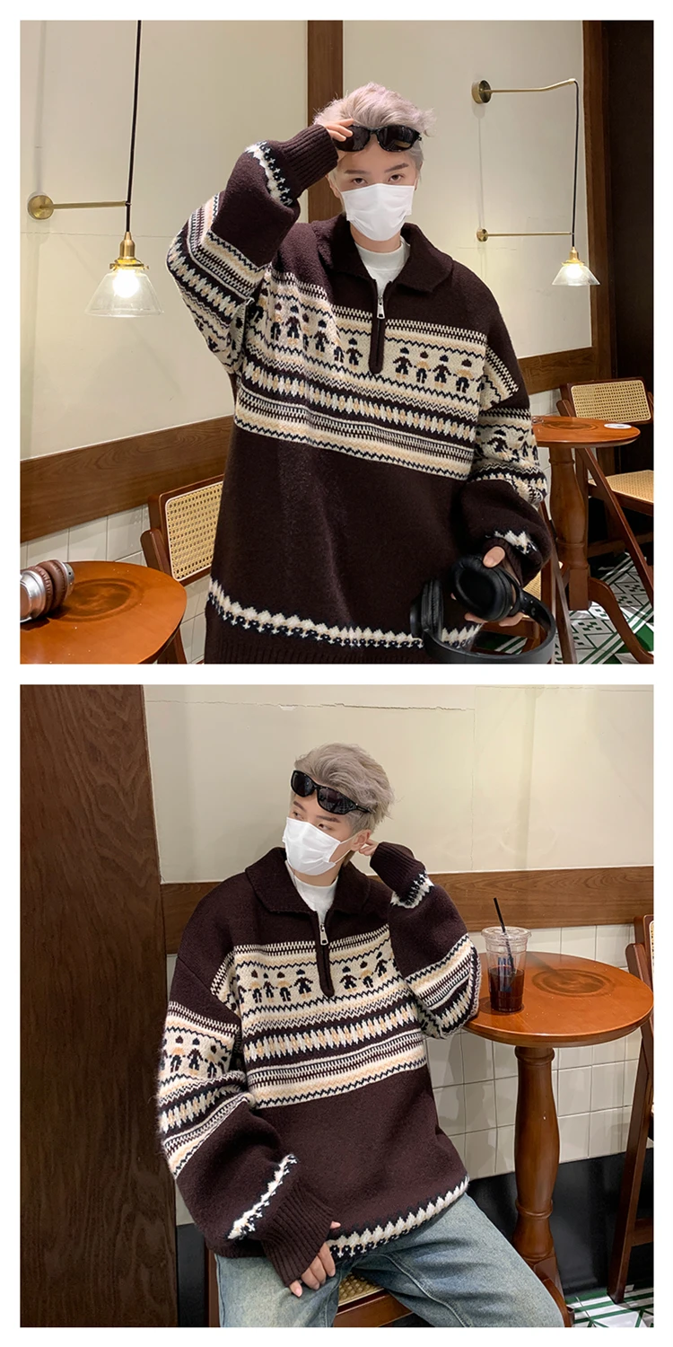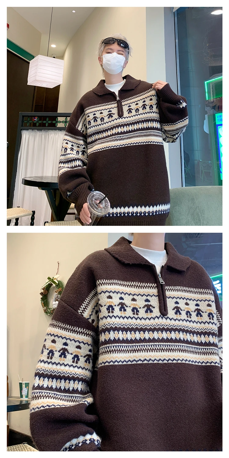 WIAOFELLAS - New Year Striped Christmas Sweaters Men Lapel Zipper Pullover Women Autumn Winter Loose Niche Couple Knitted Sweater Coat
