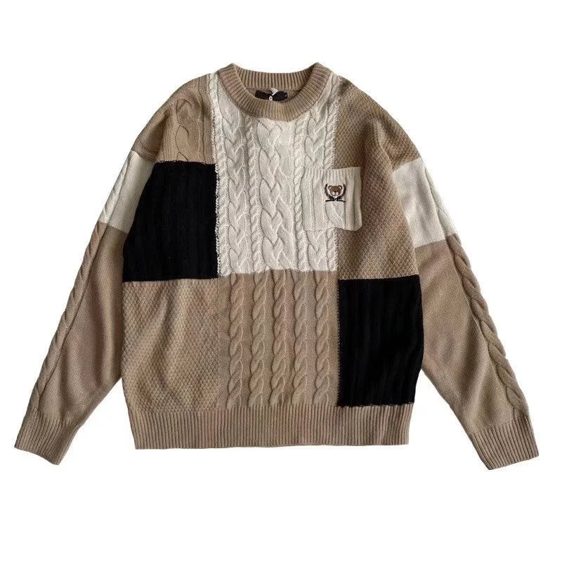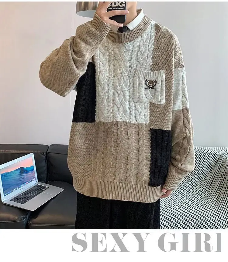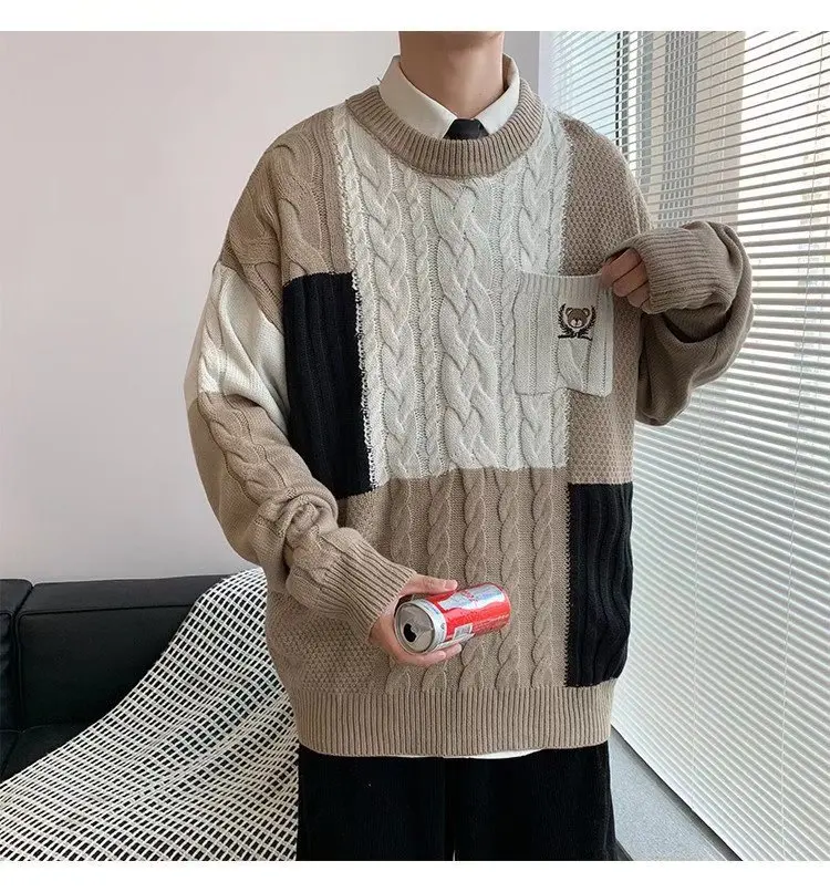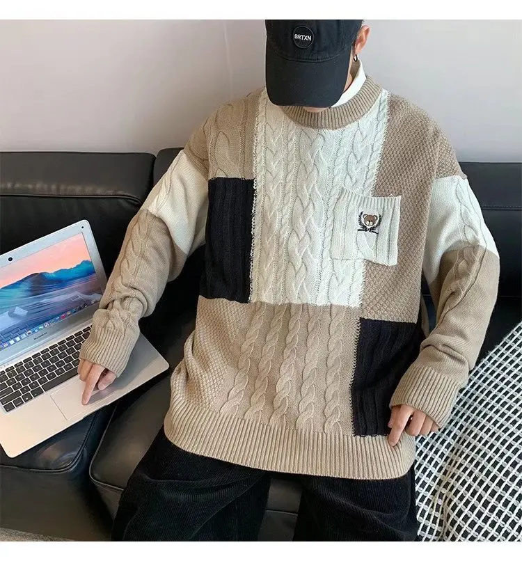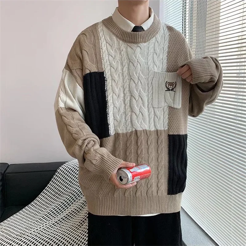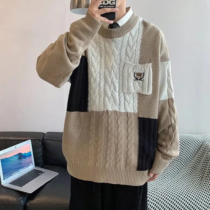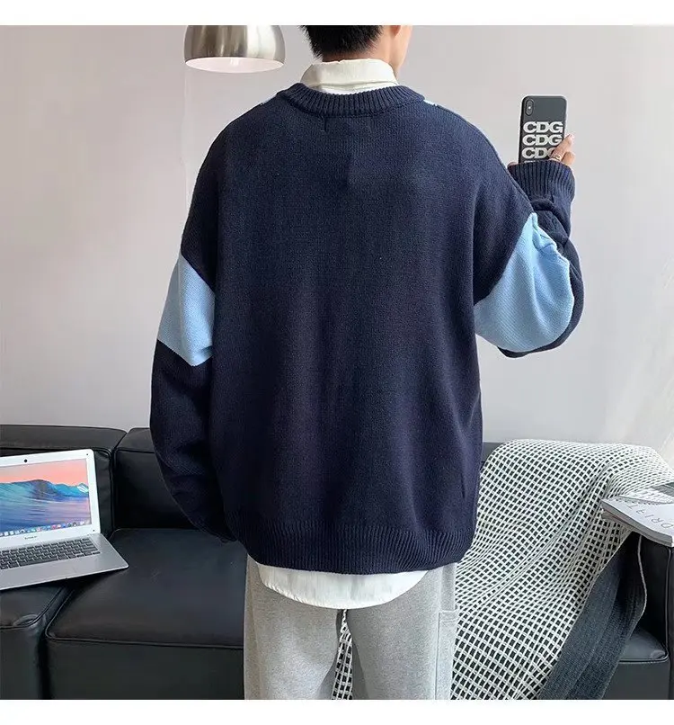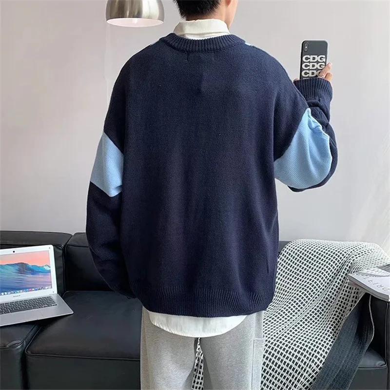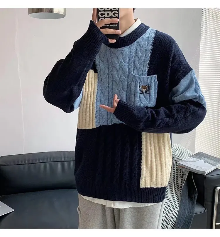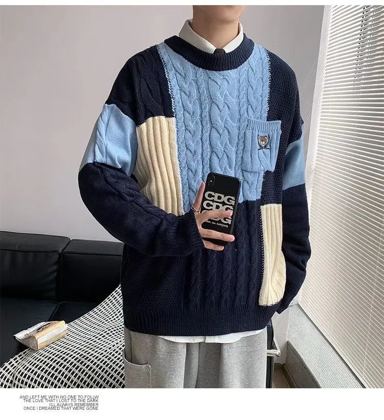WIAOFELLAS - Oversized Men Sweater Fashion Knitted Embroidery Bear Pullovers Spring Lazy Long Sleeve Streetwear Patchwork Klein Blue Sweater