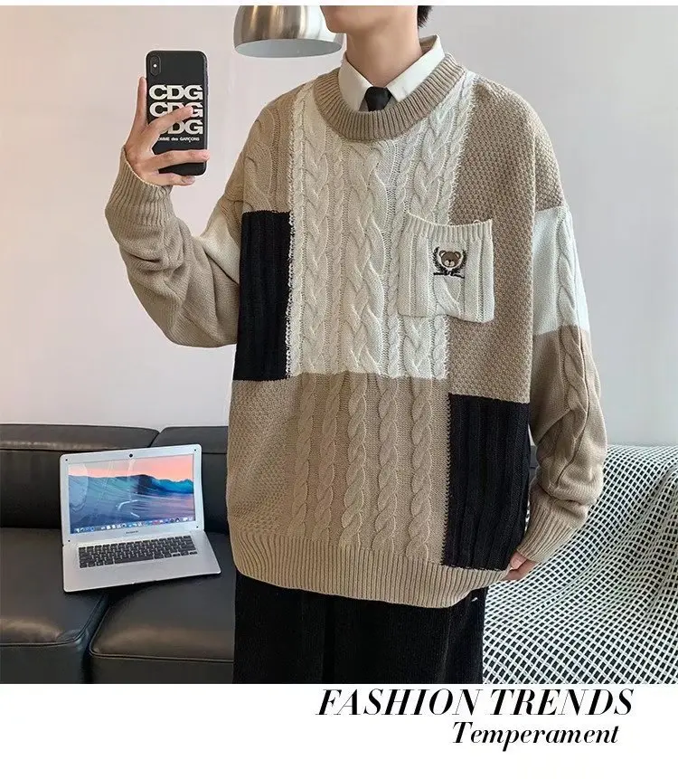 WIAOFELLAS  -  Oversized Men Sweater Fashion Knitted Embroidery Bear Pullovers Spring Lazy Long Sleeve Streetwear Patchwork Klein Blue Sweater