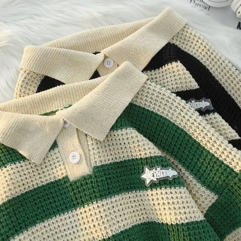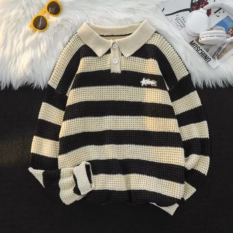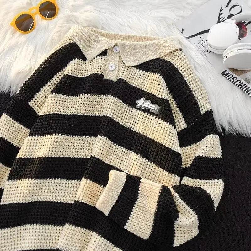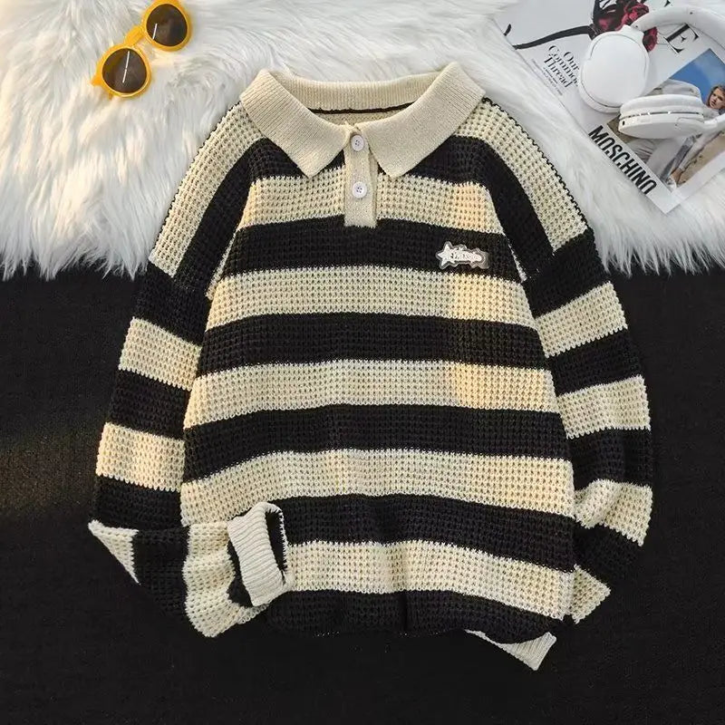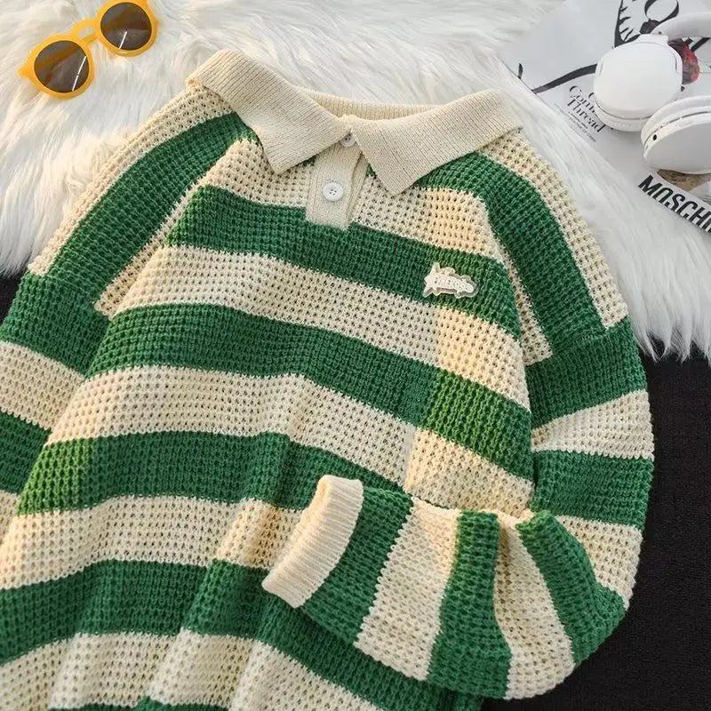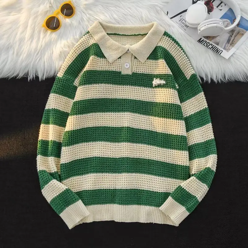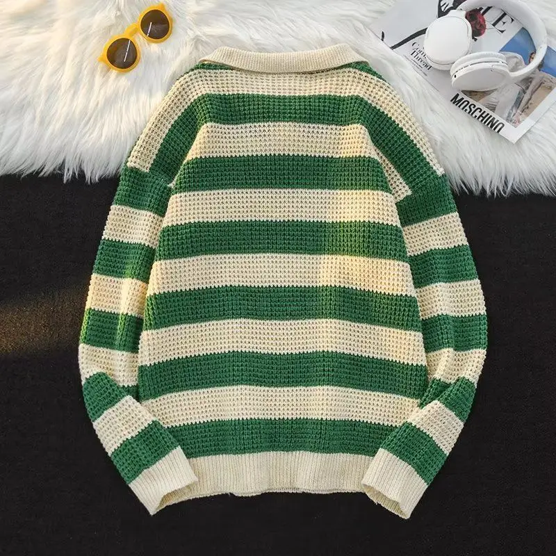 WIAOFELLAS - Retro POLO Lapel Striped Sweater Men's College Contrasting Color Loose and Versatile