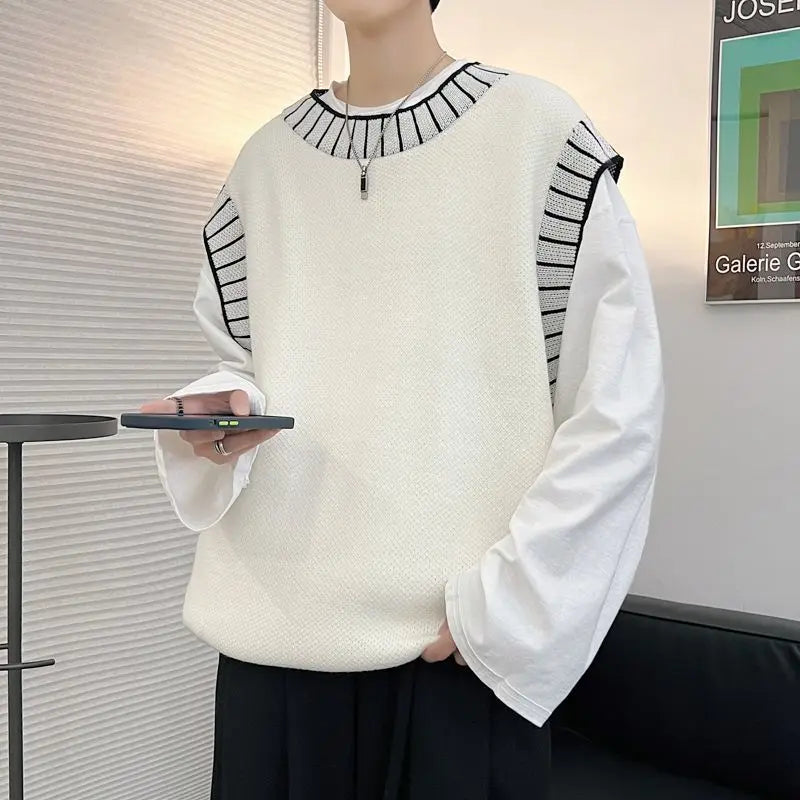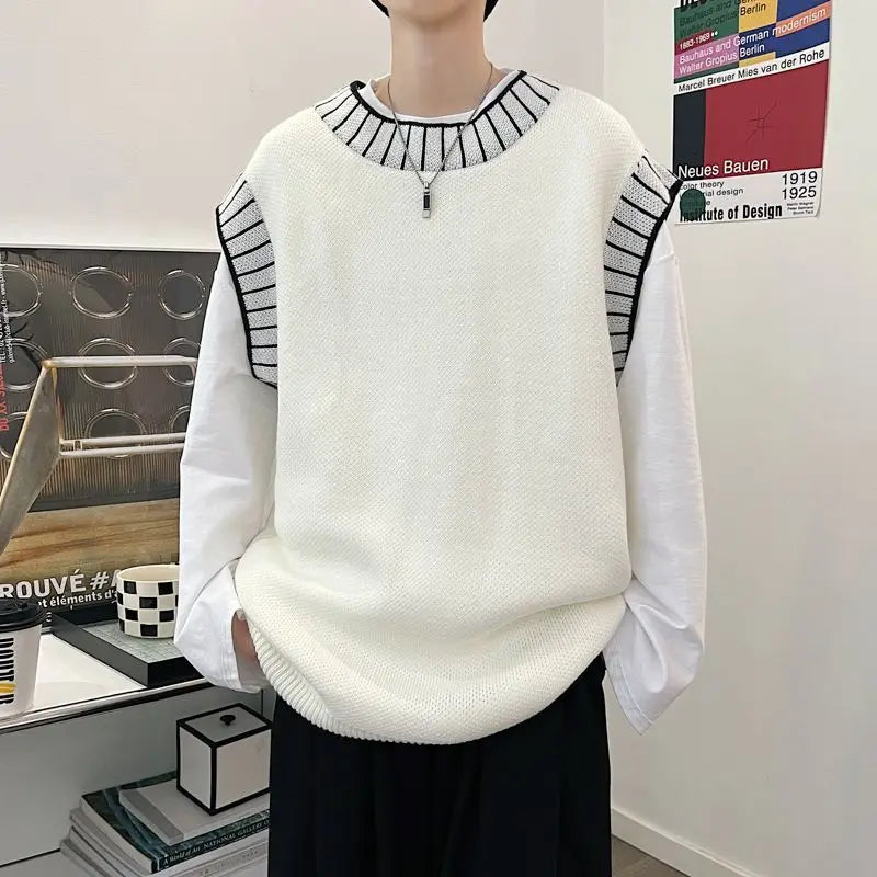 WIAOFELLAS - Sweater Vest Men's Round Neck Pullover Sewn with Famous Thread Knitted Sweater Sleeveless Camisole Versatile and Trendy Vest