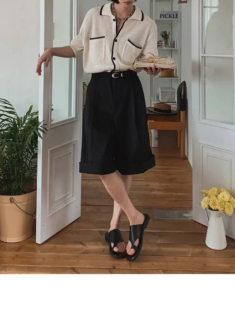 WIAOFELLAS - Trendy Men's Striped Pockets Texture Contrast Color Sweater Fashion Short Sleeves Lapel Pullover Male Summer
