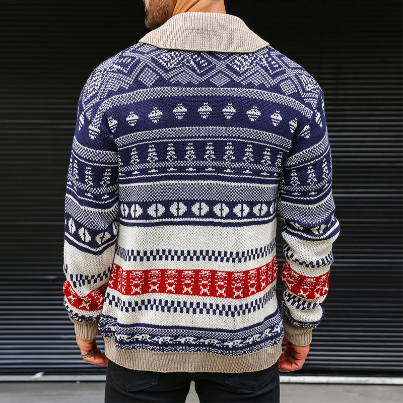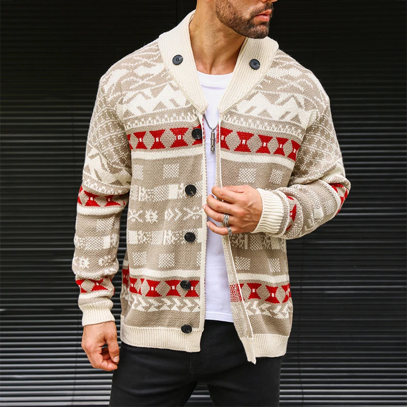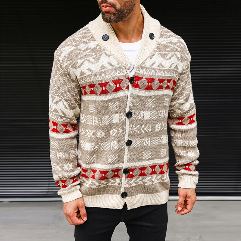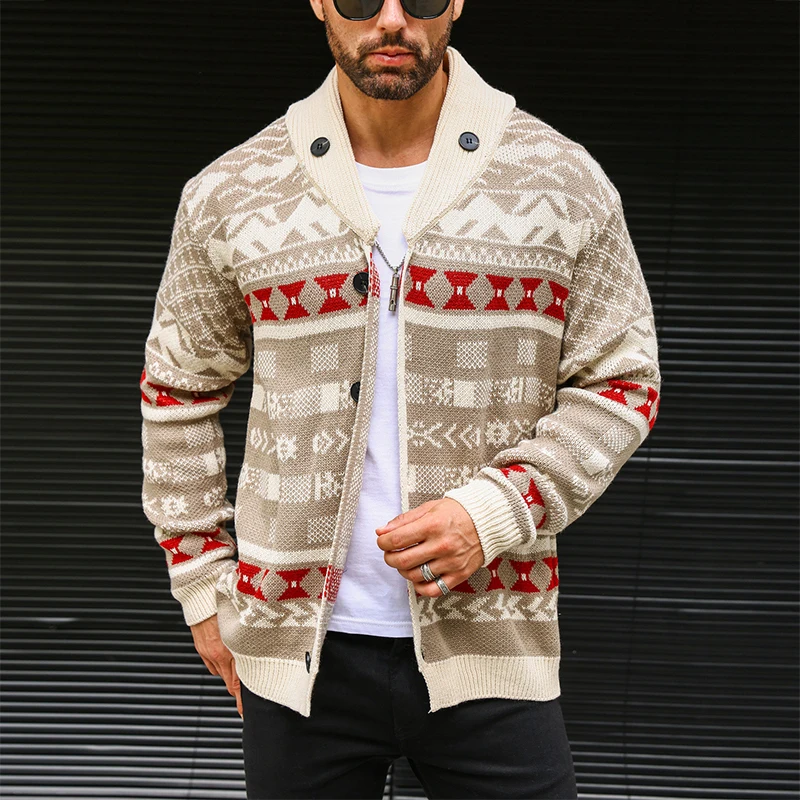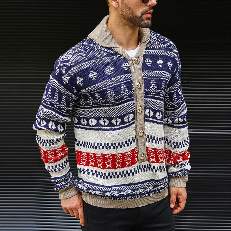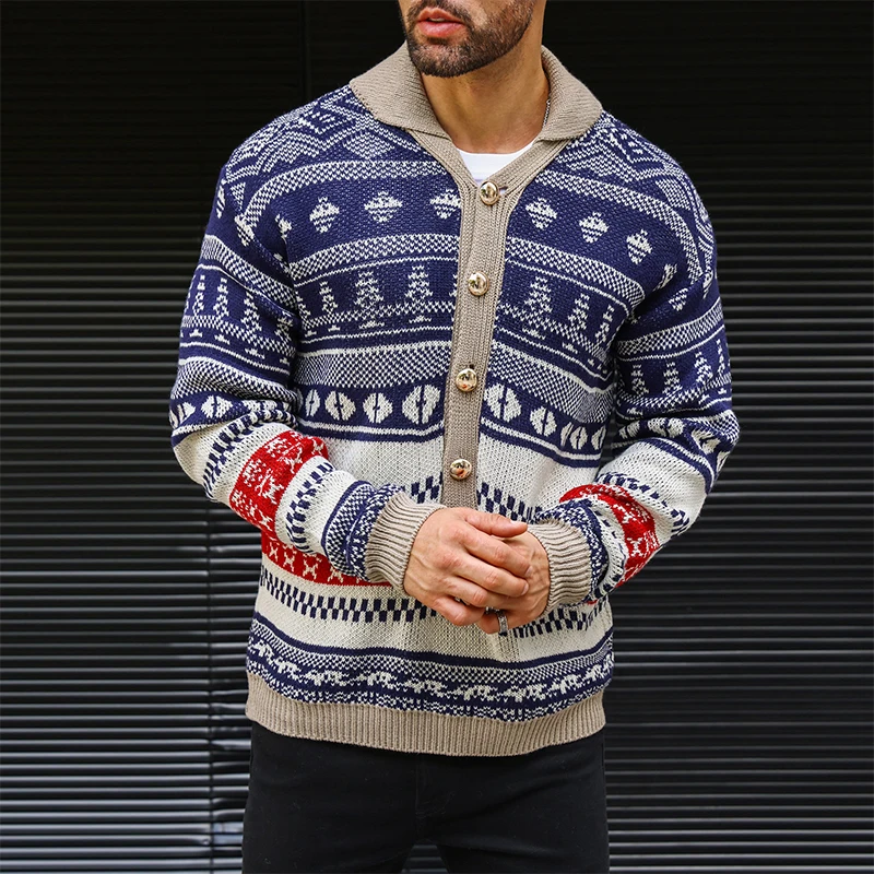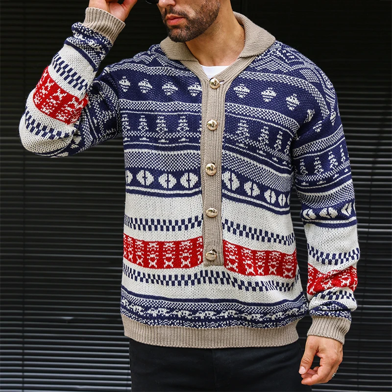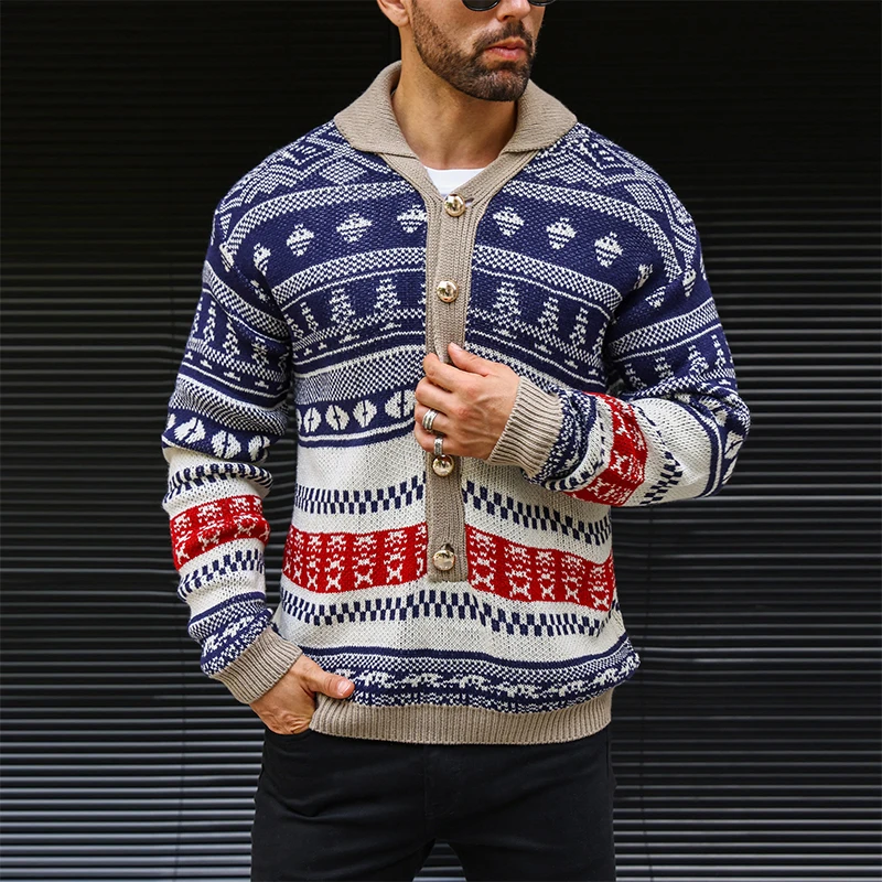 Wiaofellas  -  Vintage Knitwear Mens Autumn Fashionable Pattern Graphic Knitting Sweaters Men Casual Button-up Turn-down Collar Sweater Tops