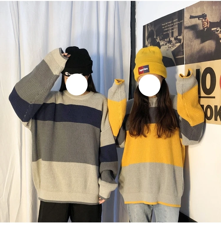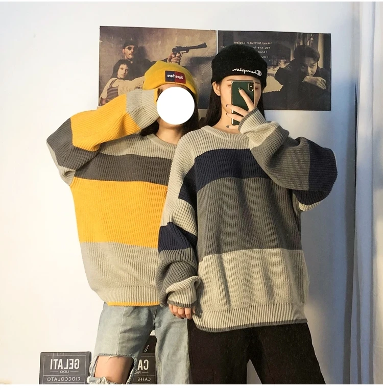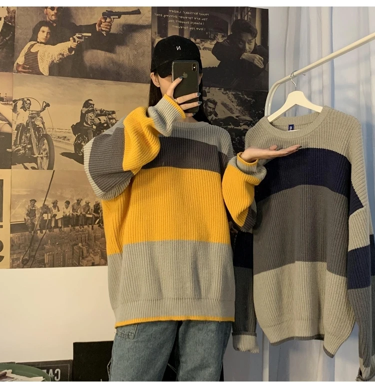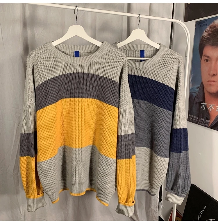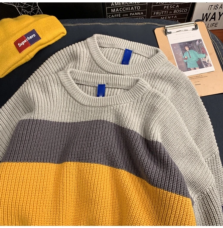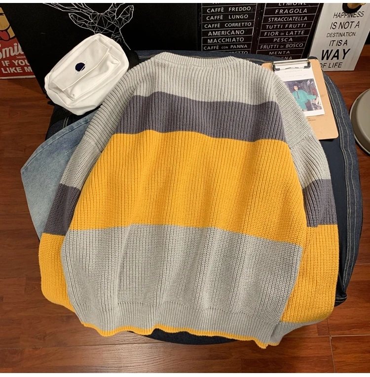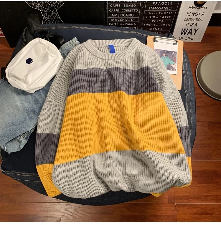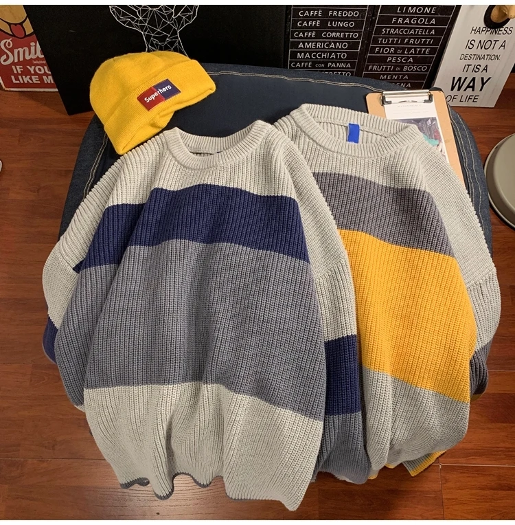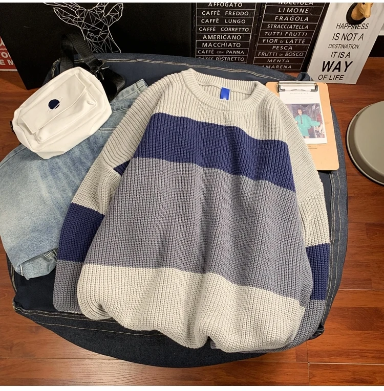 Wiaofellas Winter thick striped color-blocking sweater men's Korean loose knit sweater