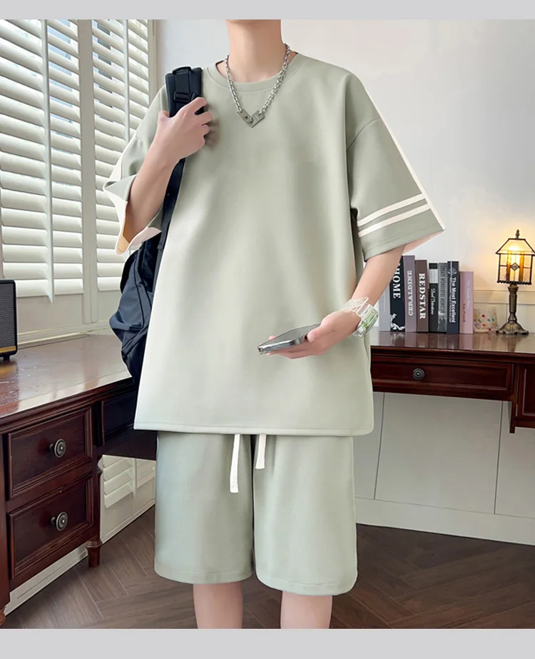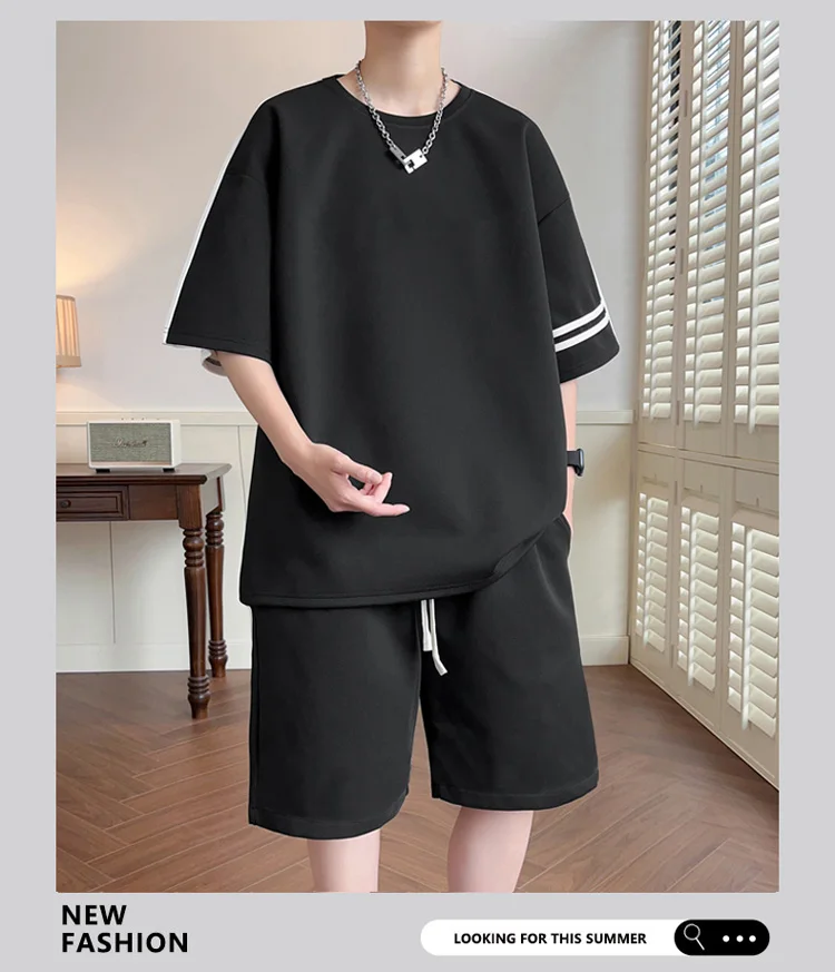 Wiaofellas - Summer Men's Tracksuit Sets Korean Casual Sports Suit Breathable Solid T-shirts Shorts 2 Piece Set High Street Men Clothing