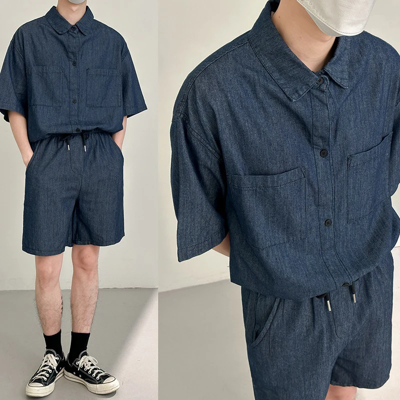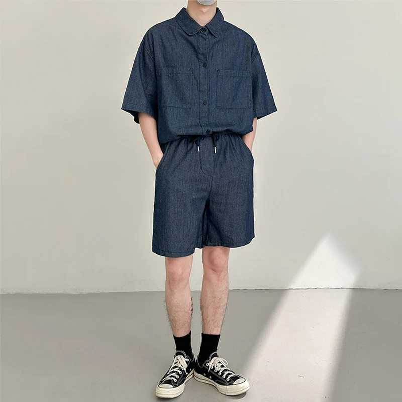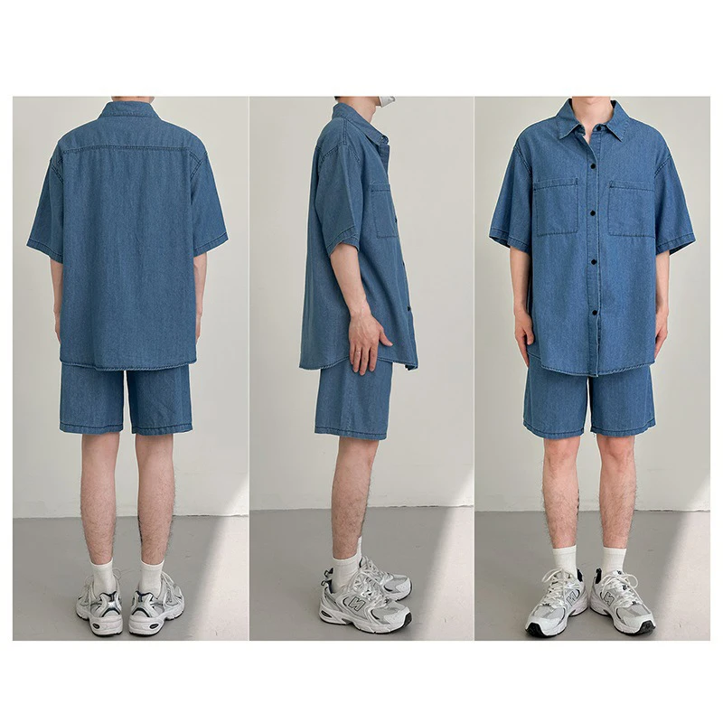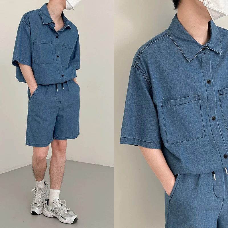 Wiaofellas Thin Denim Suits For Men's Vintage Wash Jean Cloth Two-piece Short Sleeved Lapel Shirt and Shorts Outfits Y2k Summer Casual Sets