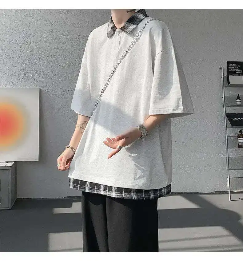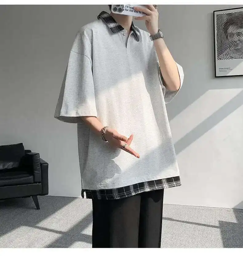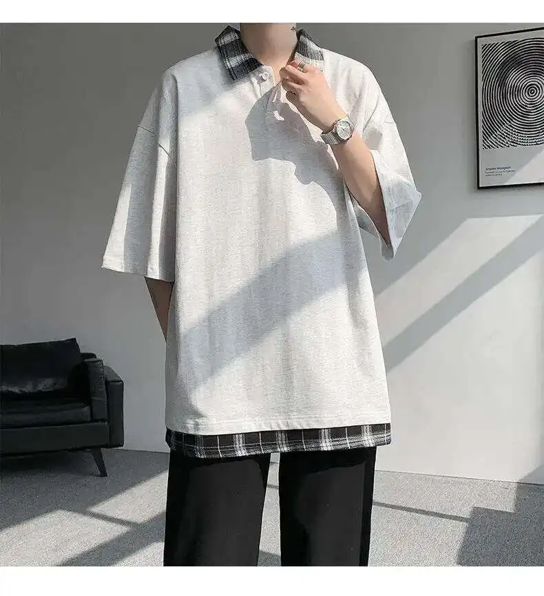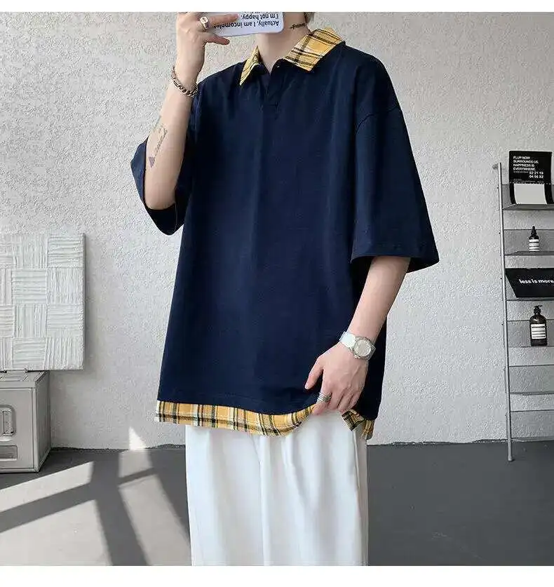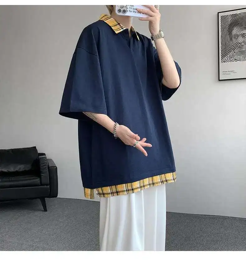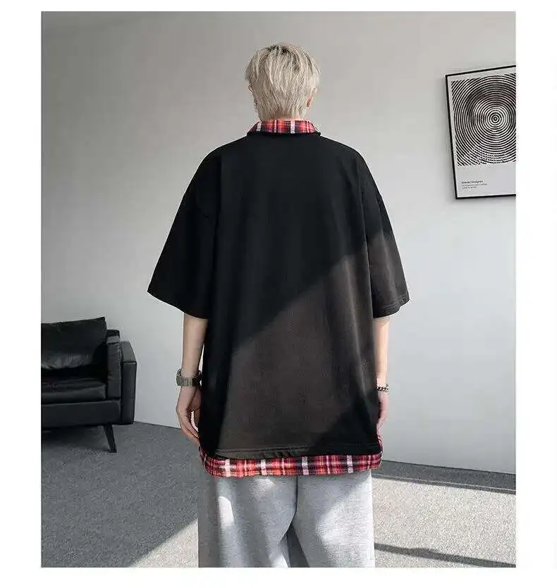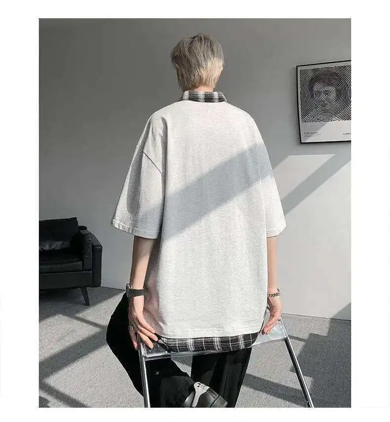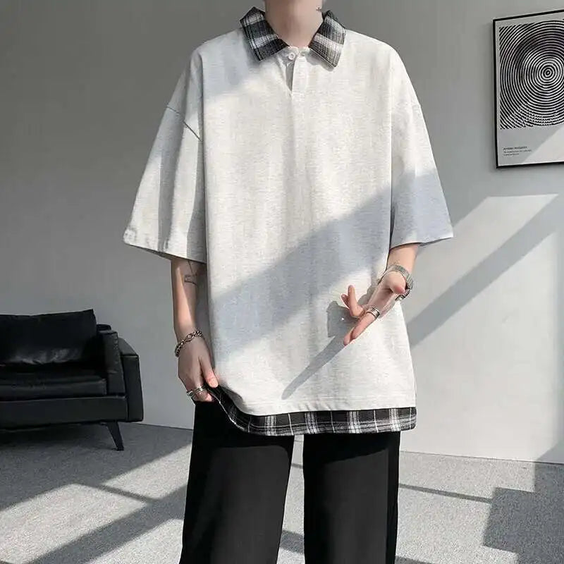 WIAOFELLAS  -  Fashion New Men's Spliced Plaid Fake Two Pieces Casual T-shirt Trendy Turn Down Collar Short Sleeve Tops Male Summer