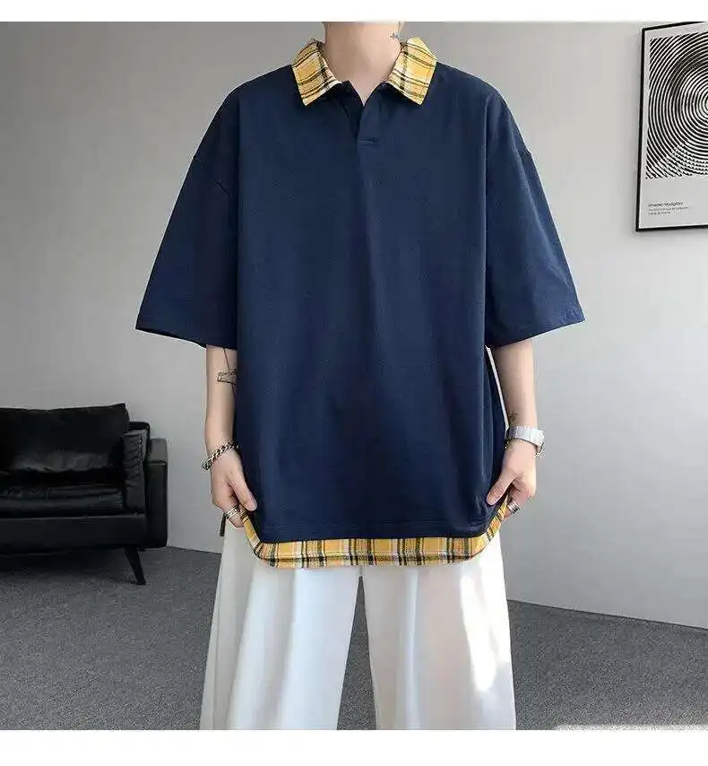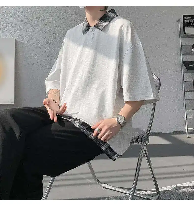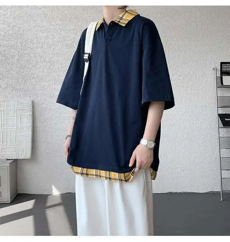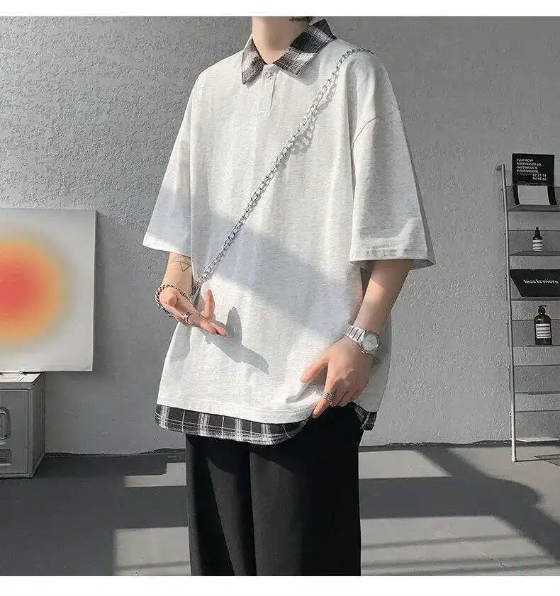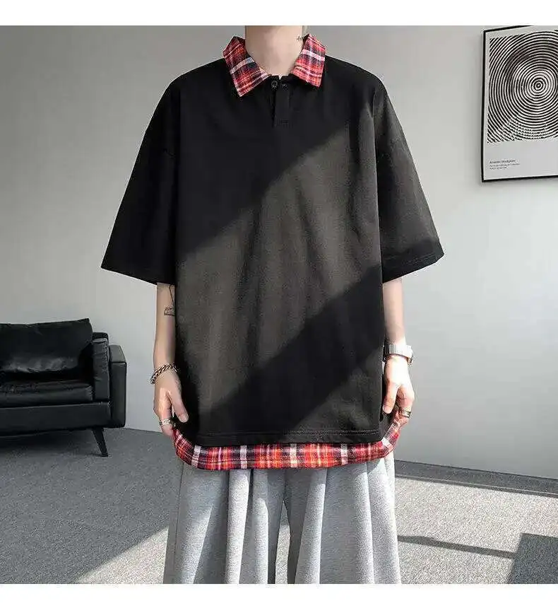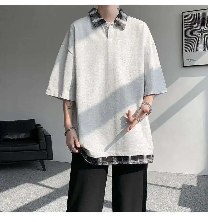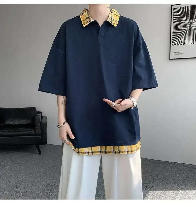 WIAOFELLAS  -  Fashion New Men's Spliced Plaid Fake Two Pieces Casual T-shirt Trendy Turn Down Collar Short Sleeve Tops Male Summer