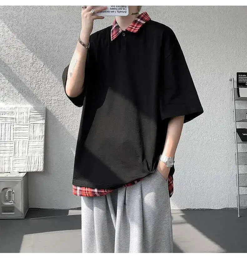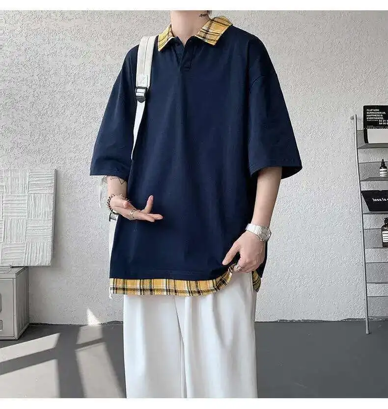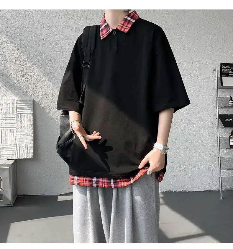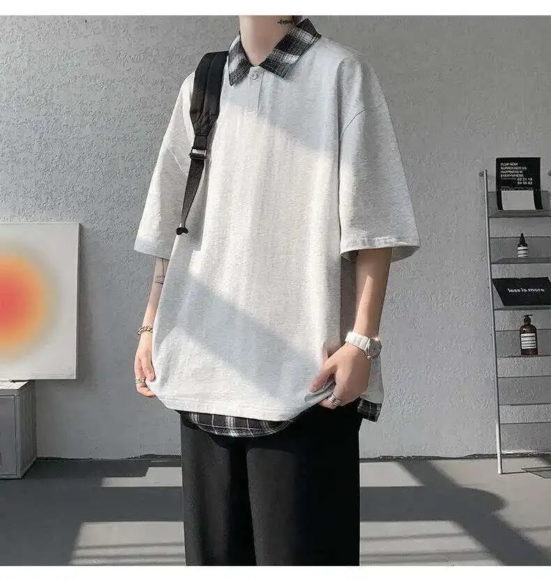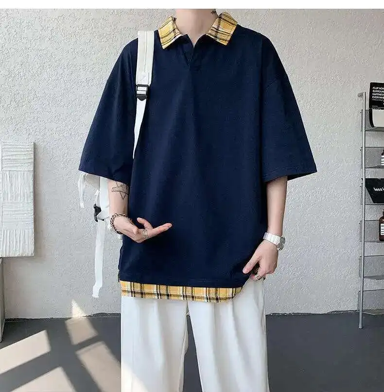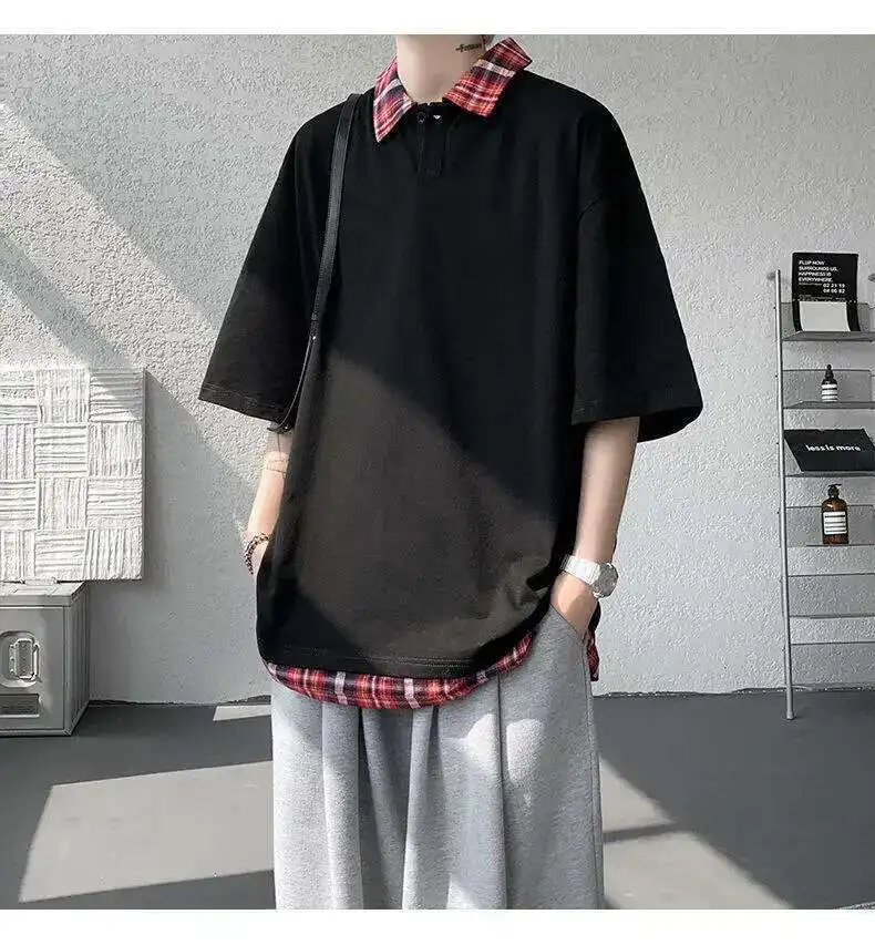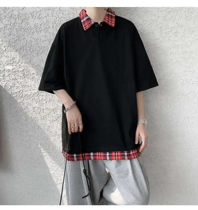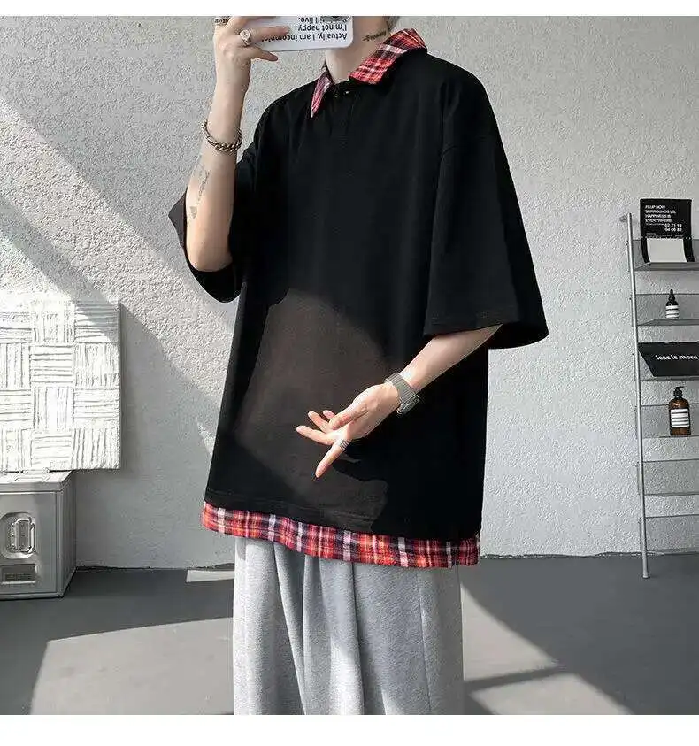 WIAOFELLAS  -  Fashion New Men's Spliced Plaid Fake Two Pieces Casual T-shirt Trendy Turn Down Collar Short Sleeve Tops Male Summer