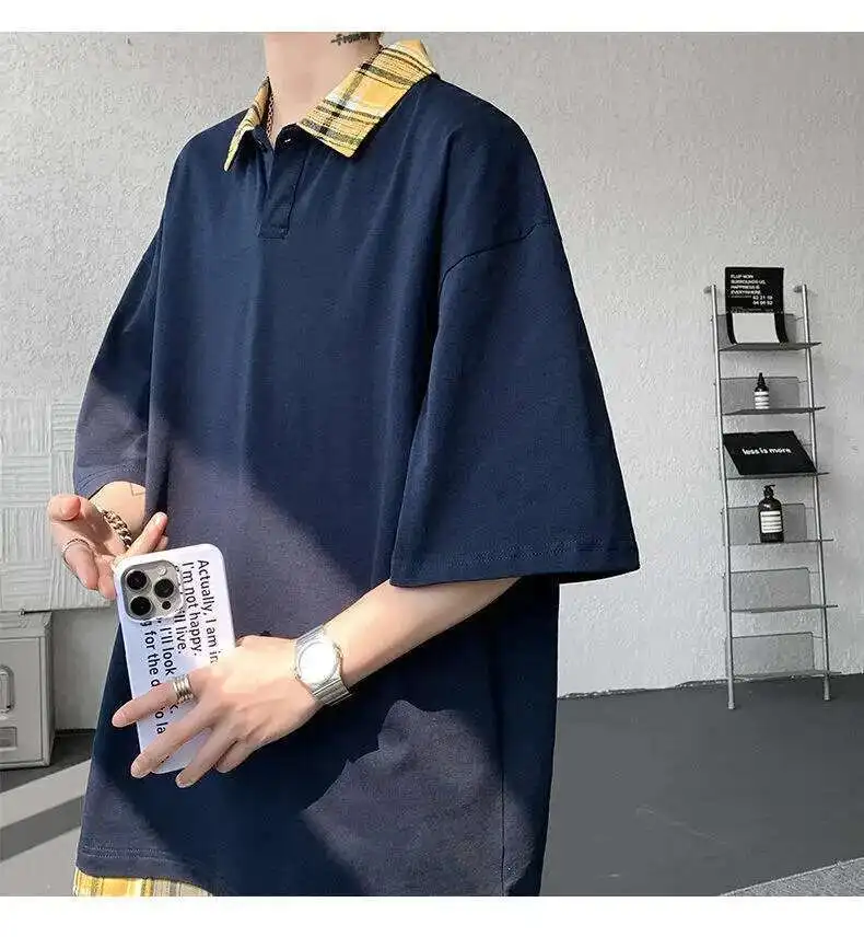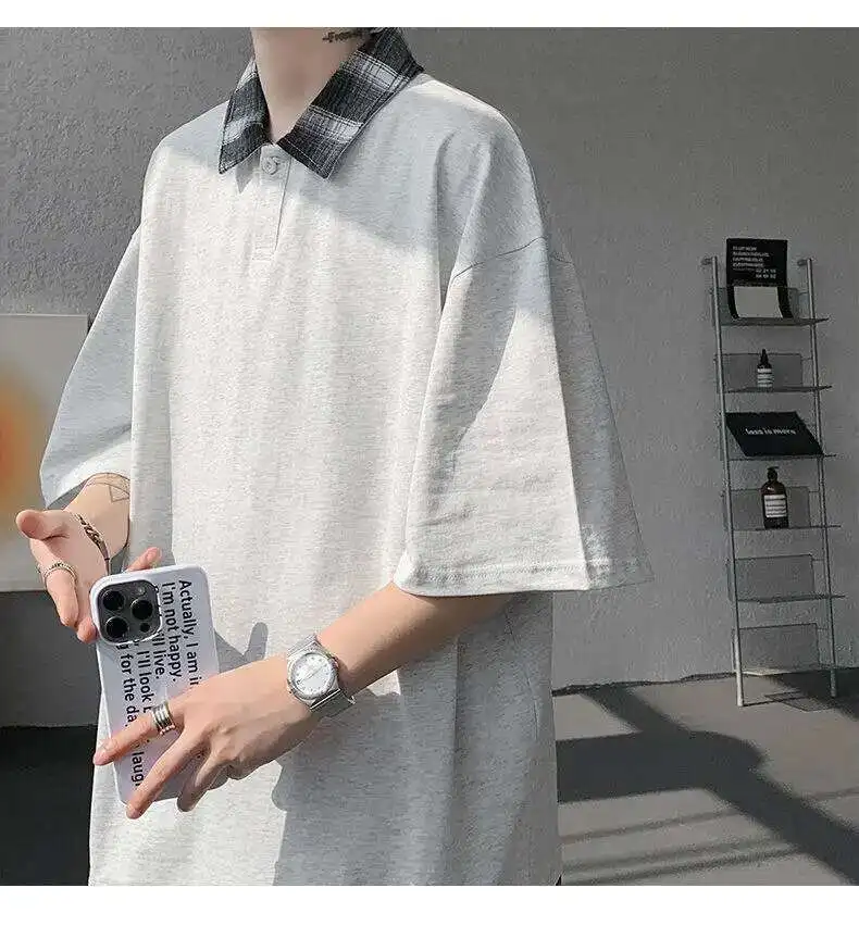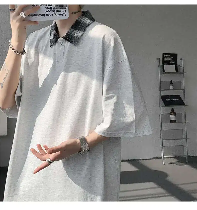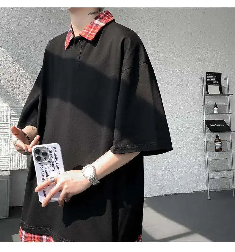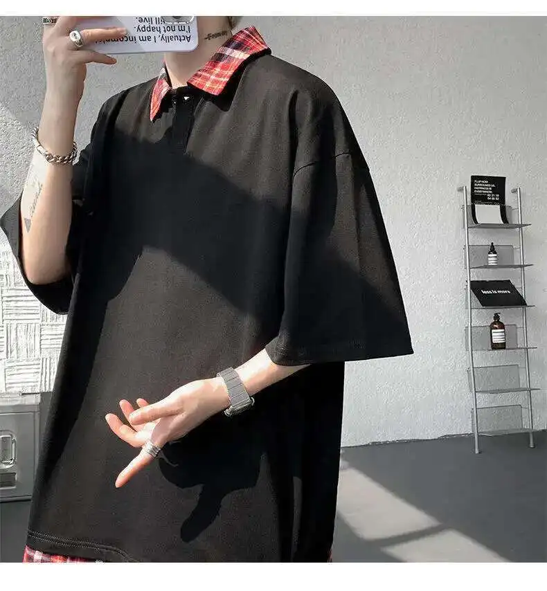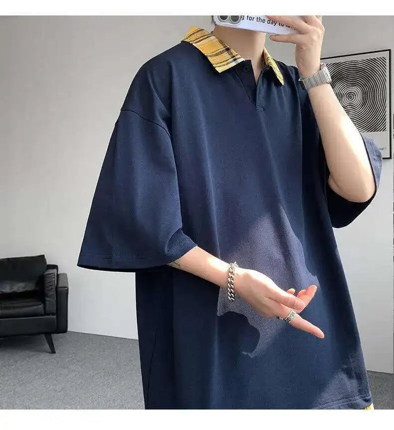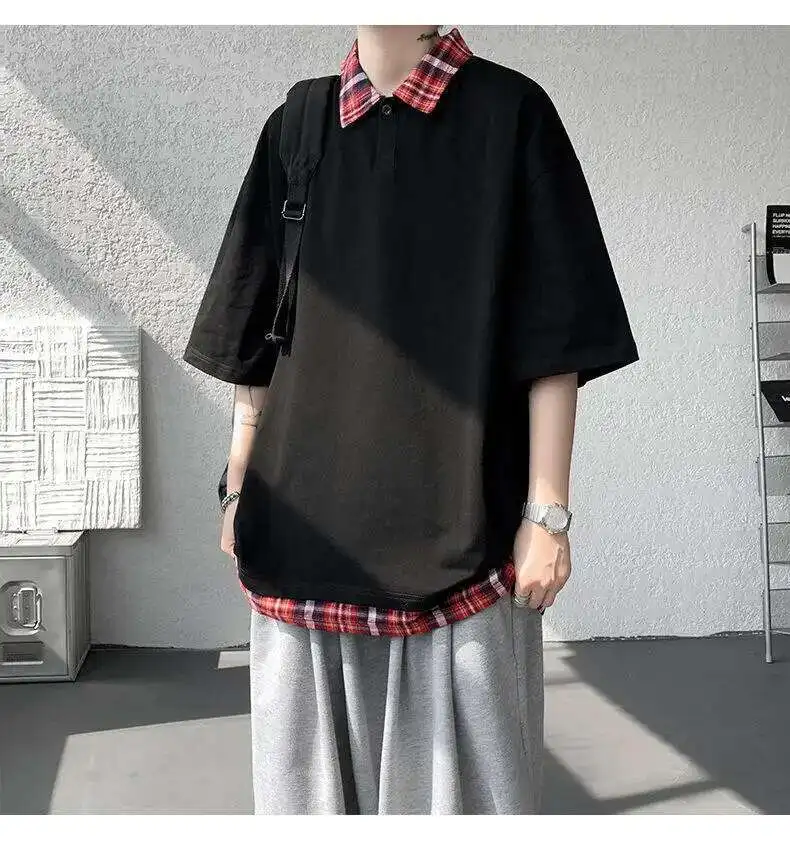 WIAOFELLAS  -  Fashion New Men's Spliced Plaid Fake Two Pieces Casual T-shirt Trendy Turn Down Collar Short Sleeve Tops Male Summer