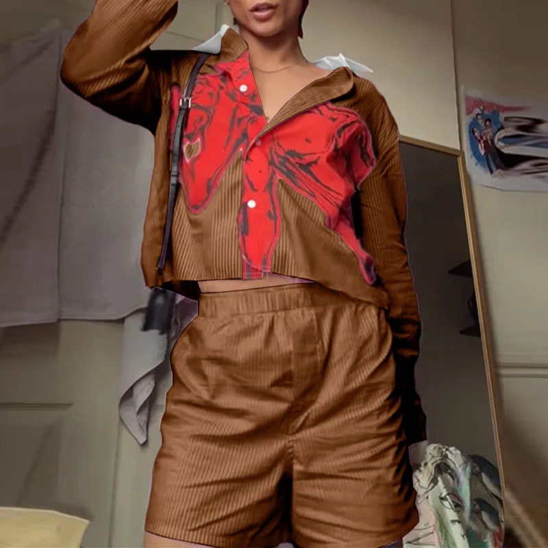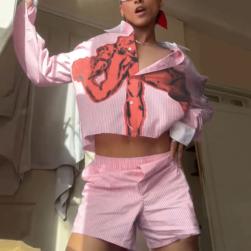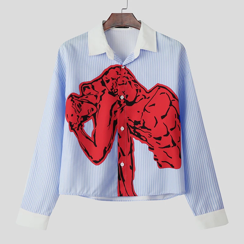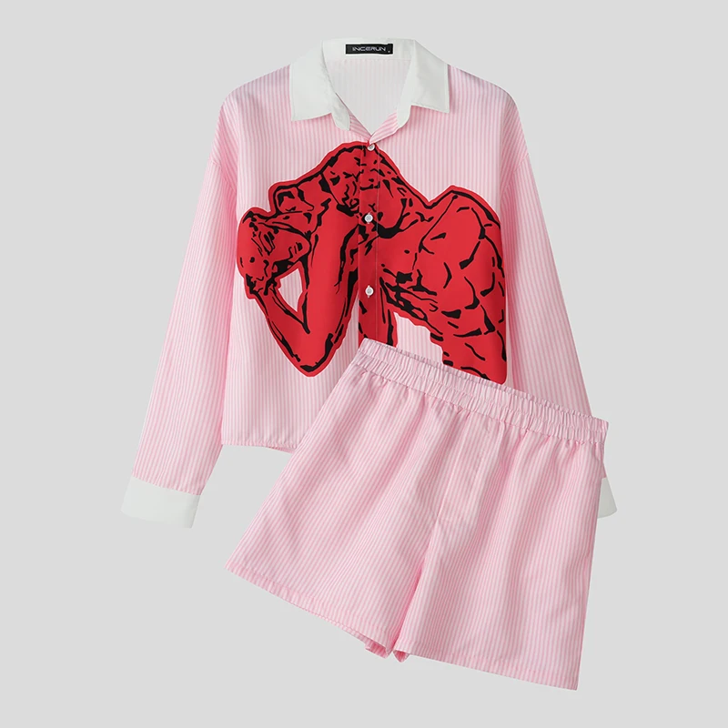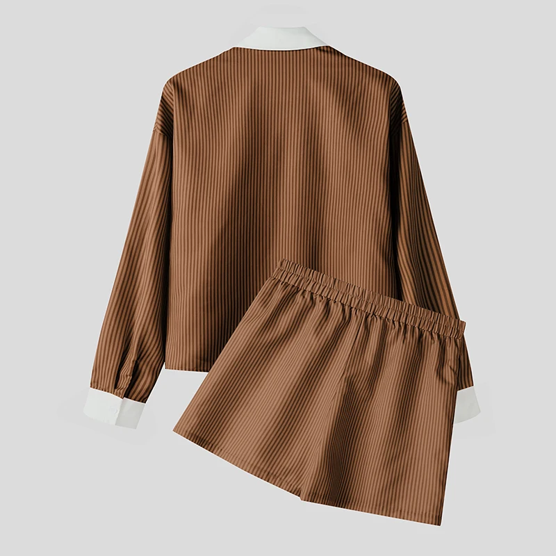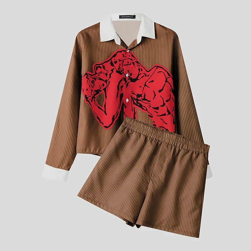 WIAOFELLAS - Men Sets Printing Striped Patchwork Streetwear Lapel Long Sleeve Shirt Crop Tops & Shorts Two Pieces Sets 2025 Men Suits