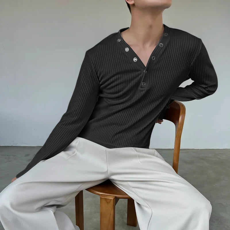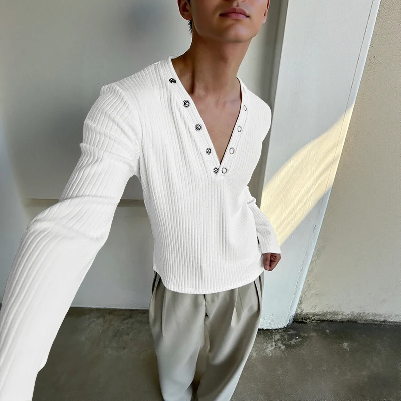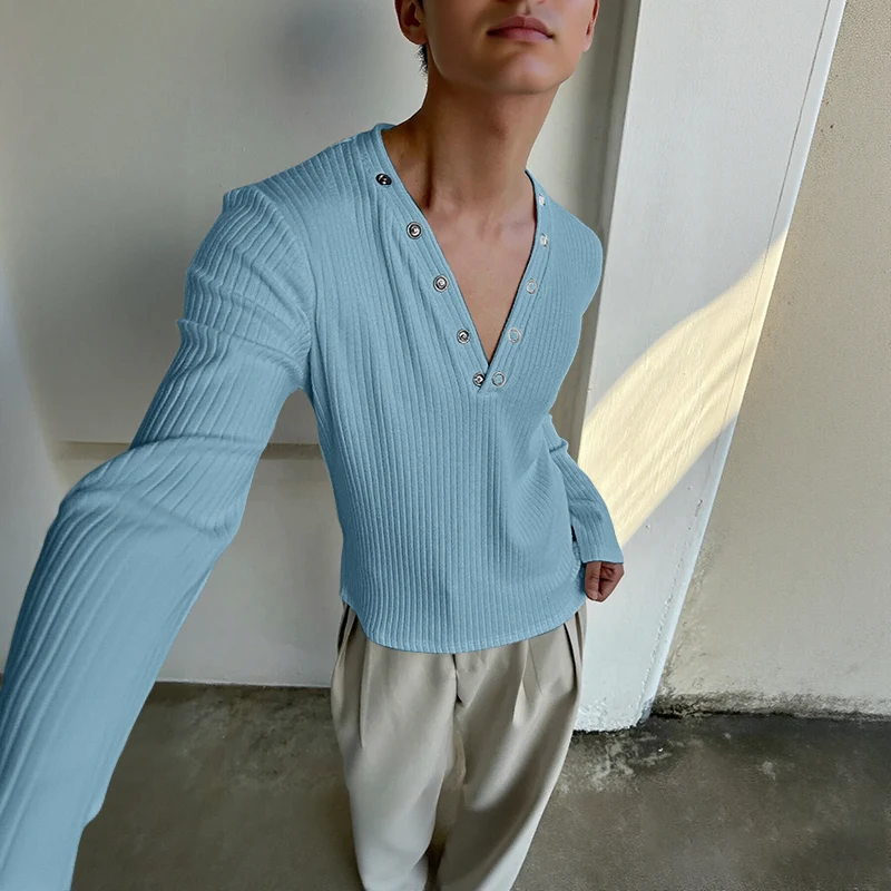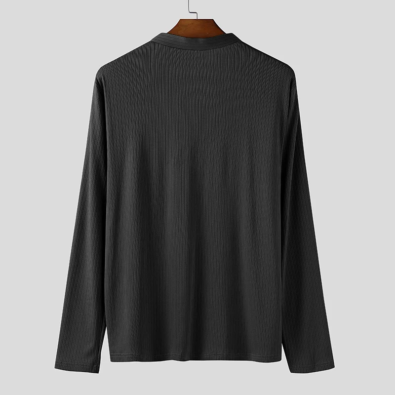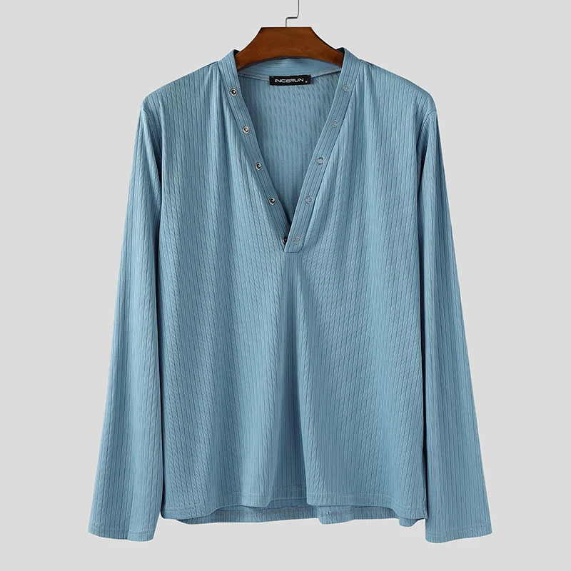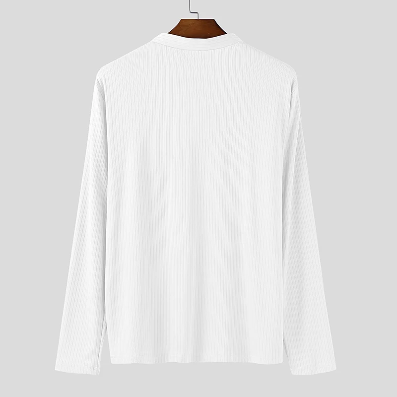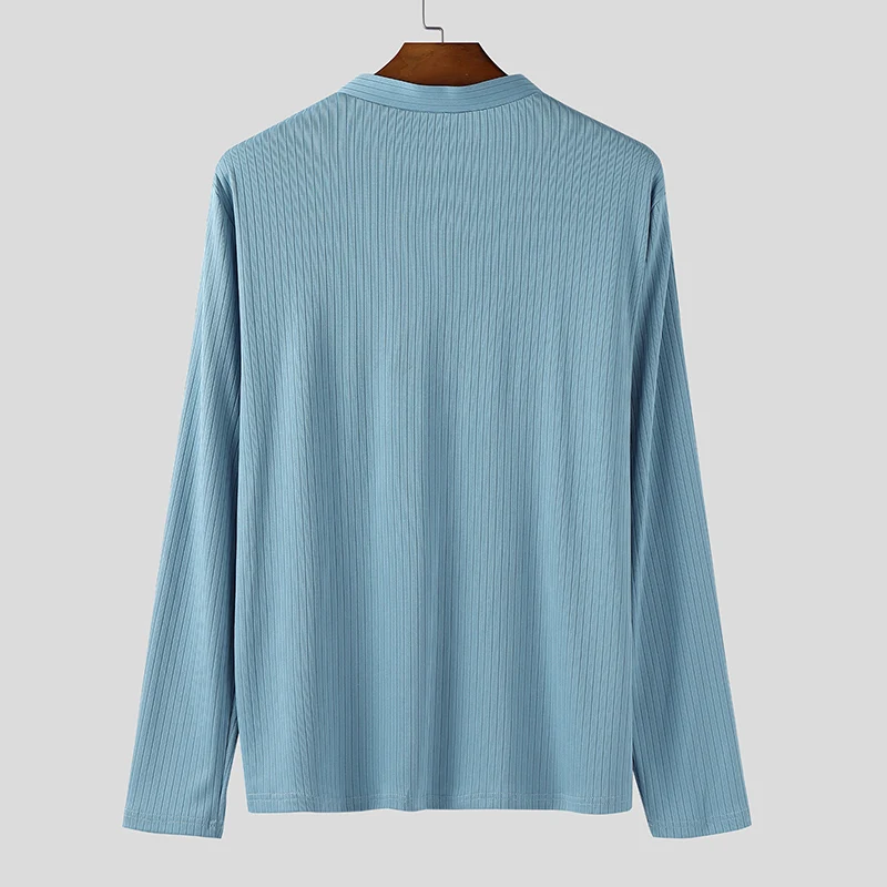 WIAOFELLAS - Men T Shirt Solid Color V Neck Long Sleeve Knitted Male Tee Tops Streetwear Fashion Casual Men Clothing Camisetas S-3XL