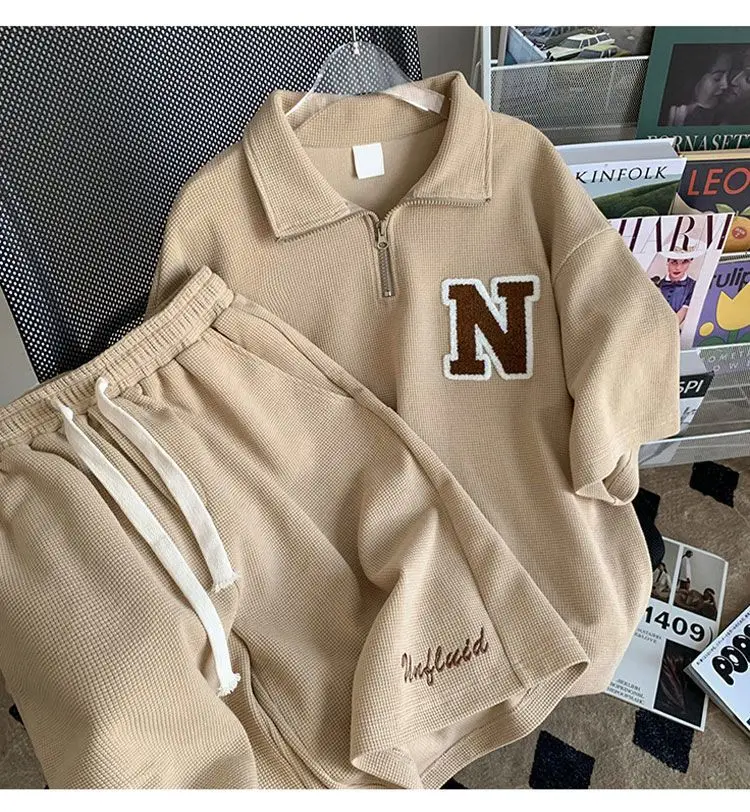 Wiaofellas - Summer Oversize Casual Fashion tracksuit Loose Waffle Suit Men Loose Short-sleeve tshirt + Sports Shorts Letter Print 2pcs Set