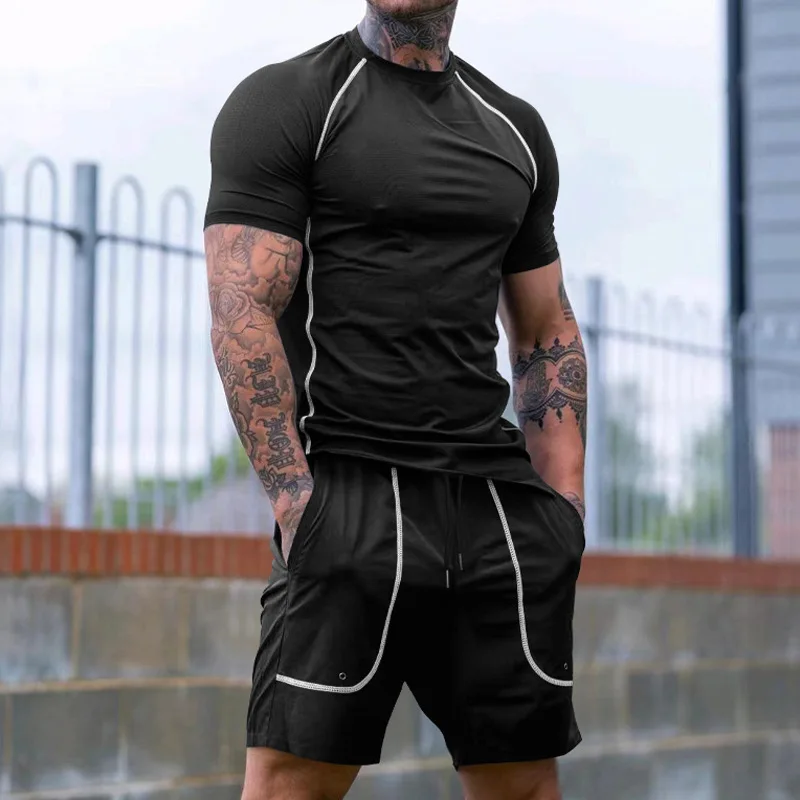 WIAOFELLAS - Versatile New Sports Tight Round Neck Short-sleeved Pullover and Three-quarter Shorts Men's Running Fitness Clothing Set