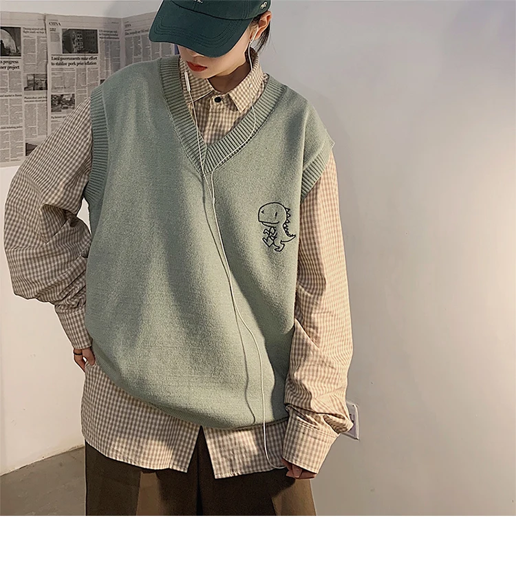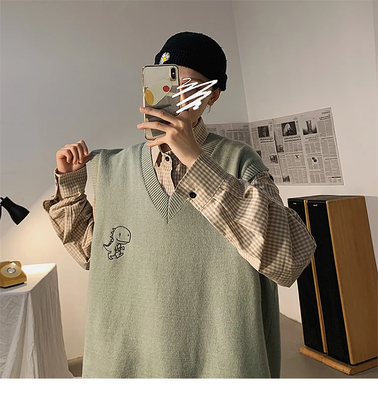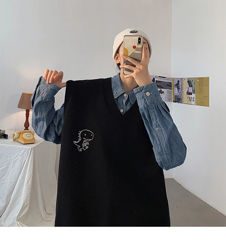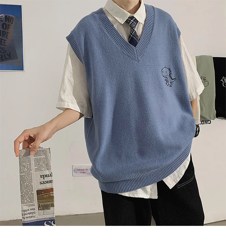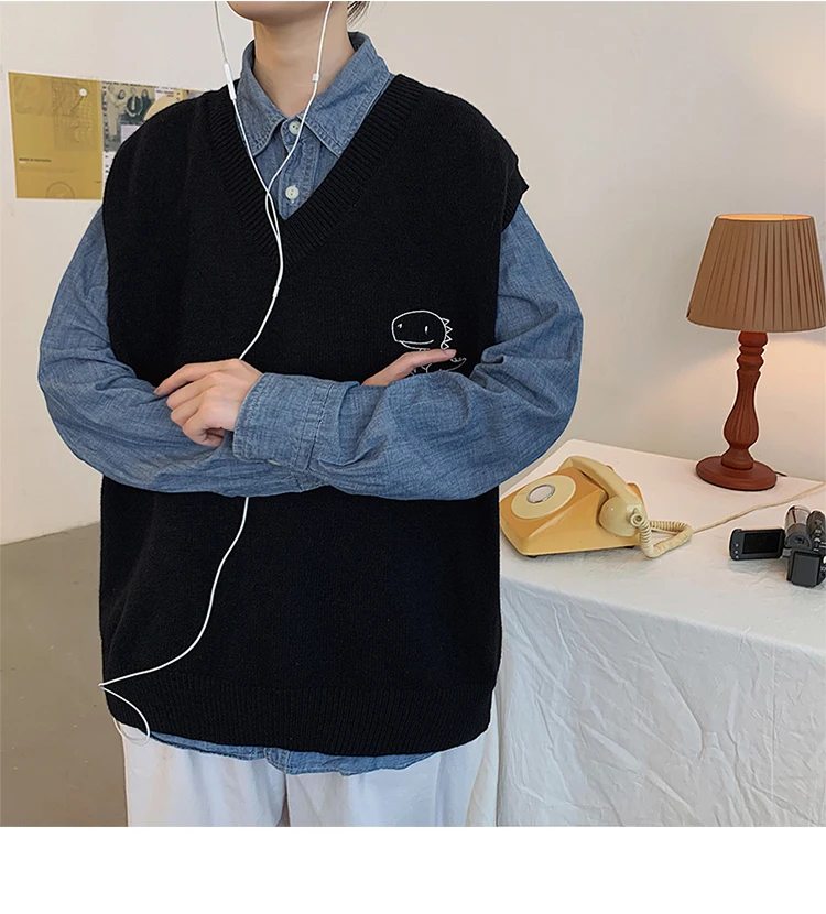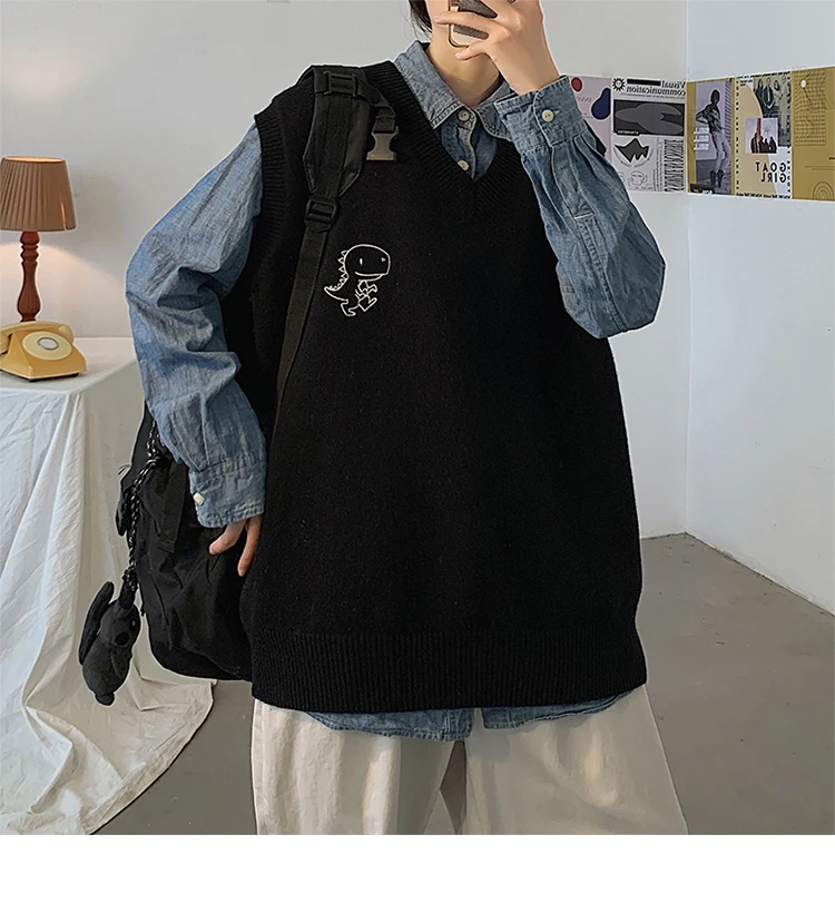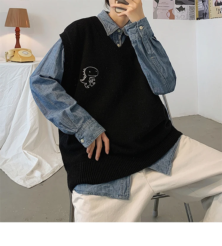 Wiaofellas Men Sweater Vests V-neck Oversize Streetwear Japan Style Couples Cartoon Cute Jumpers Artsy Hip Bf Knitwear Retro Male All-match