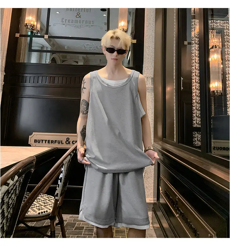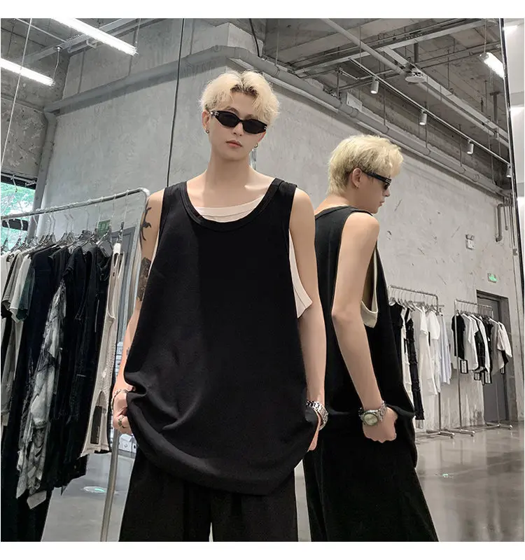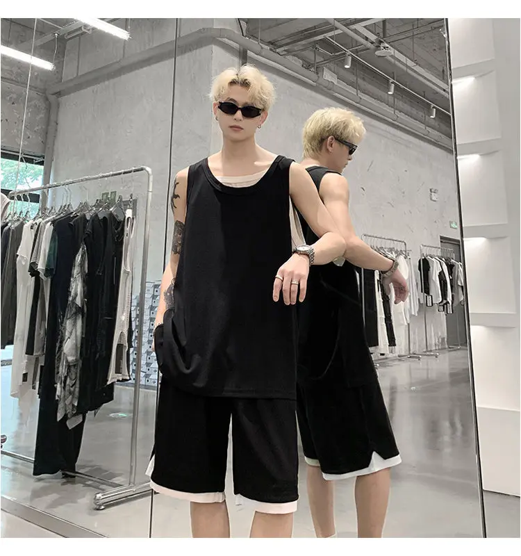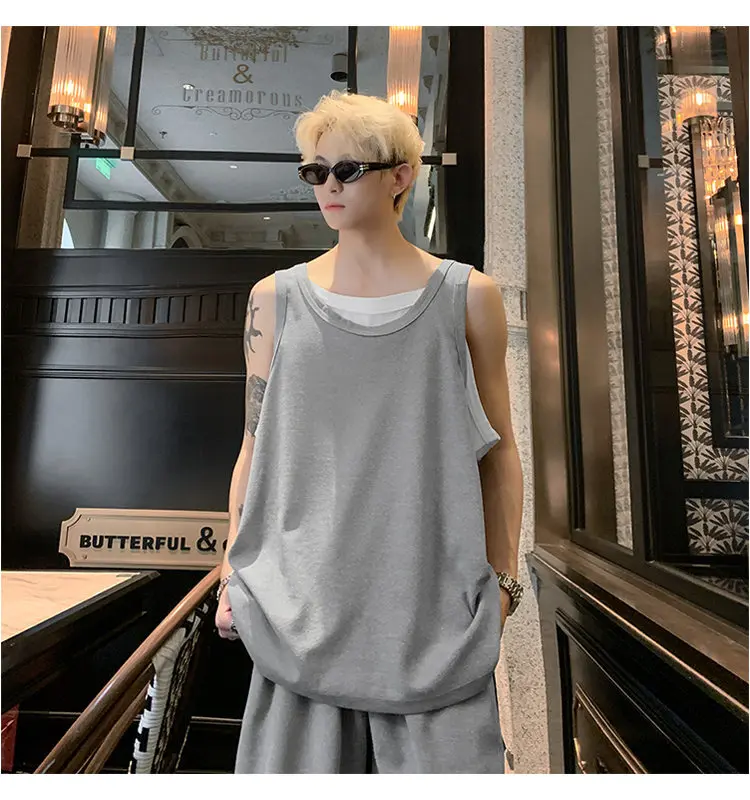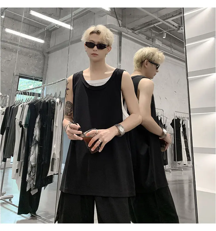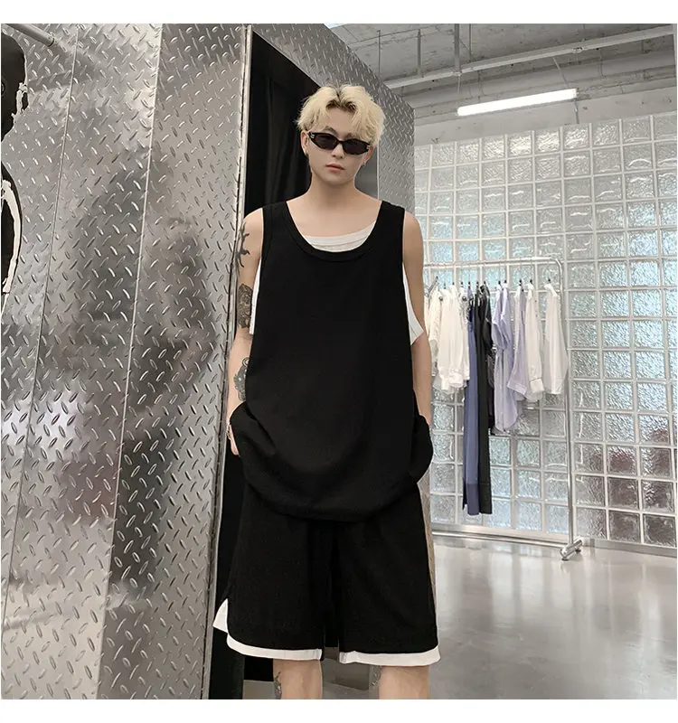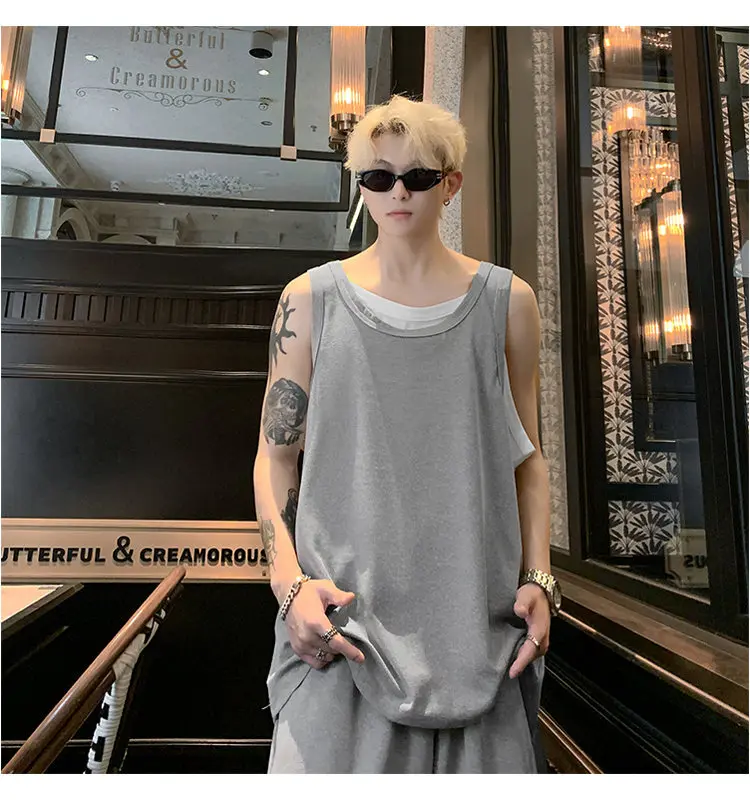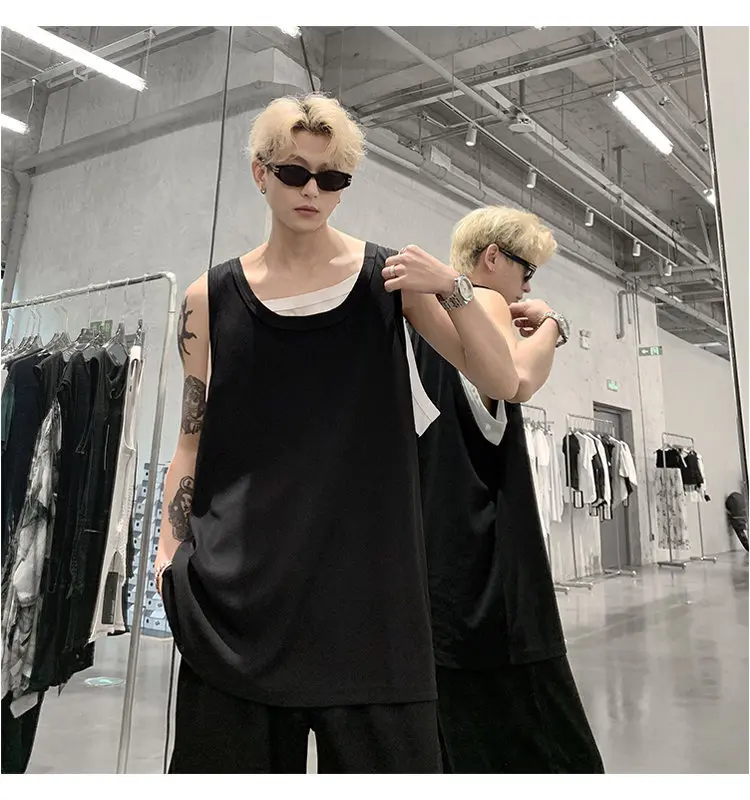 Wiaofellas - fall outfits Fake Two Piece Vest Sleeveless T-shirt Solid Color Round Neck Korea Fashion Male Tops Casual Loose