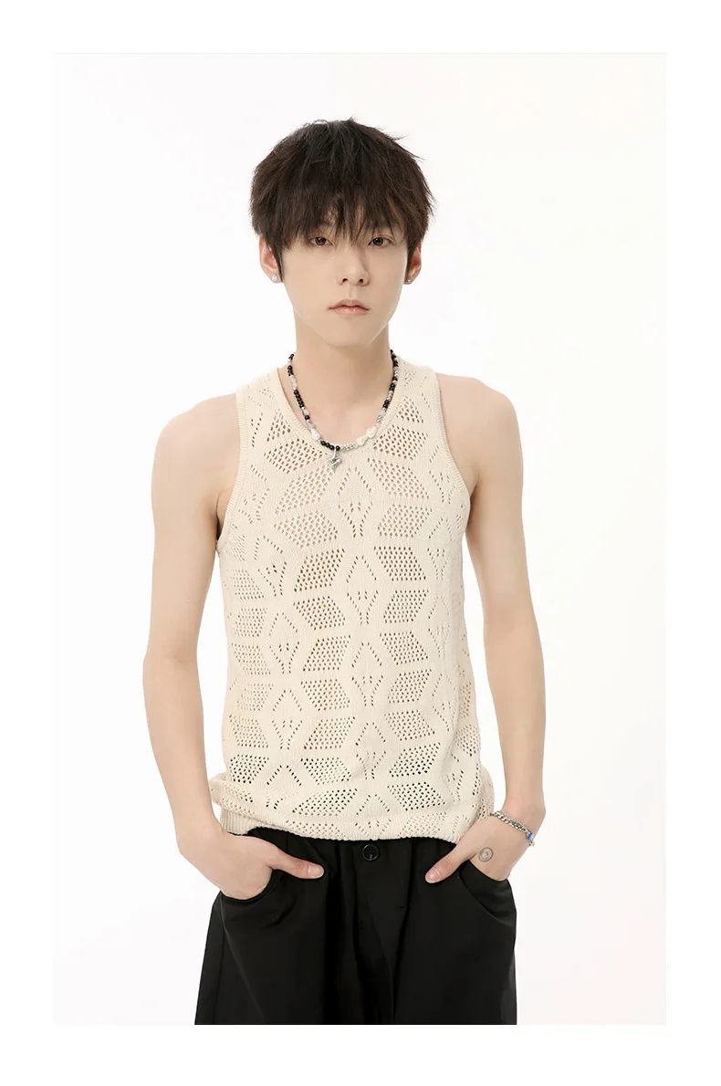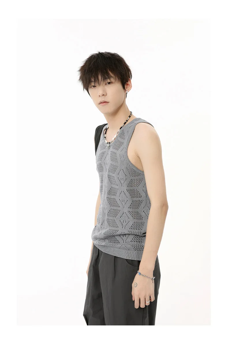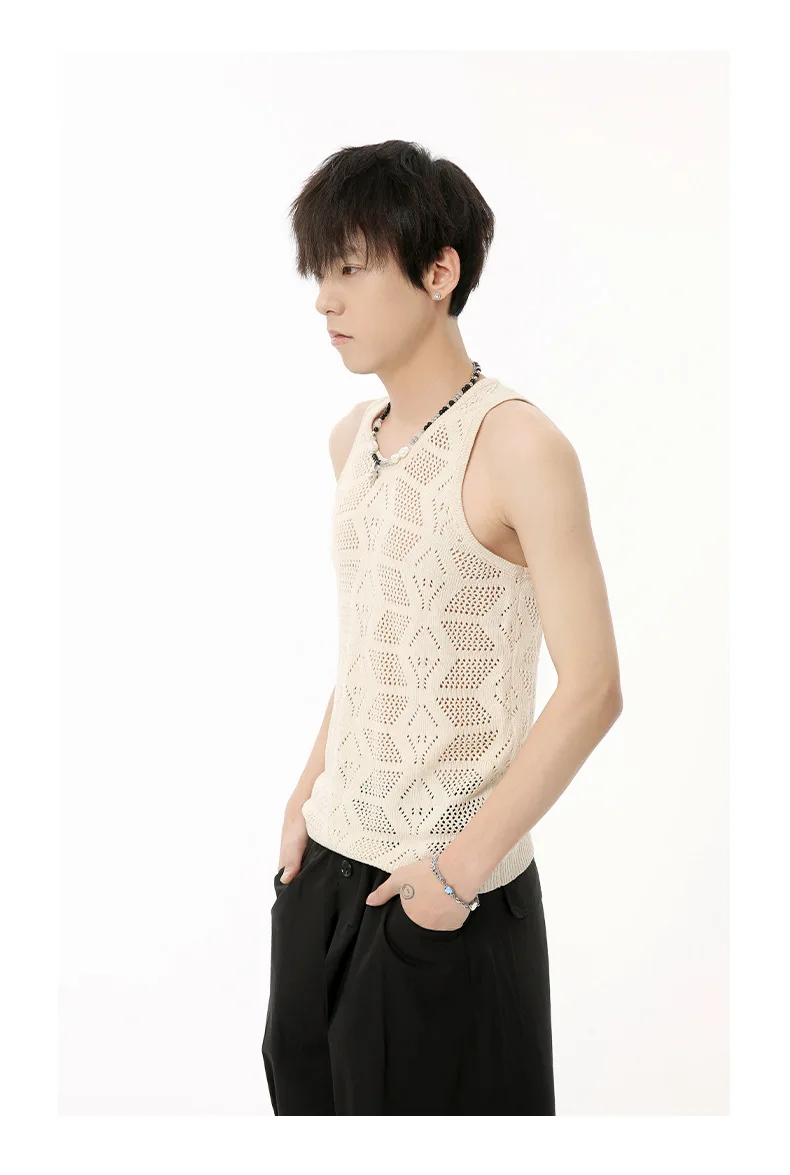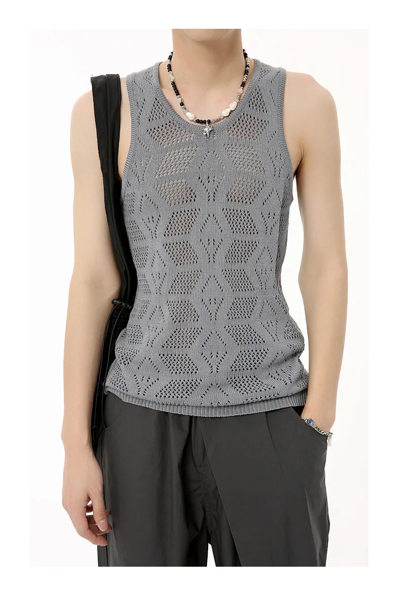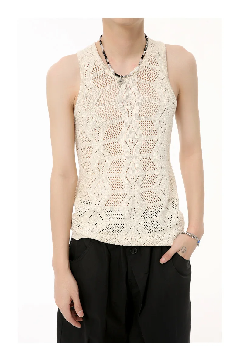 Wiaofellas - Men's Wear Summer Solid Color Round Neck Hollow Out Knitted Vest Casual Korean Style Streetwear Tank Top Sleeveless T-shirt