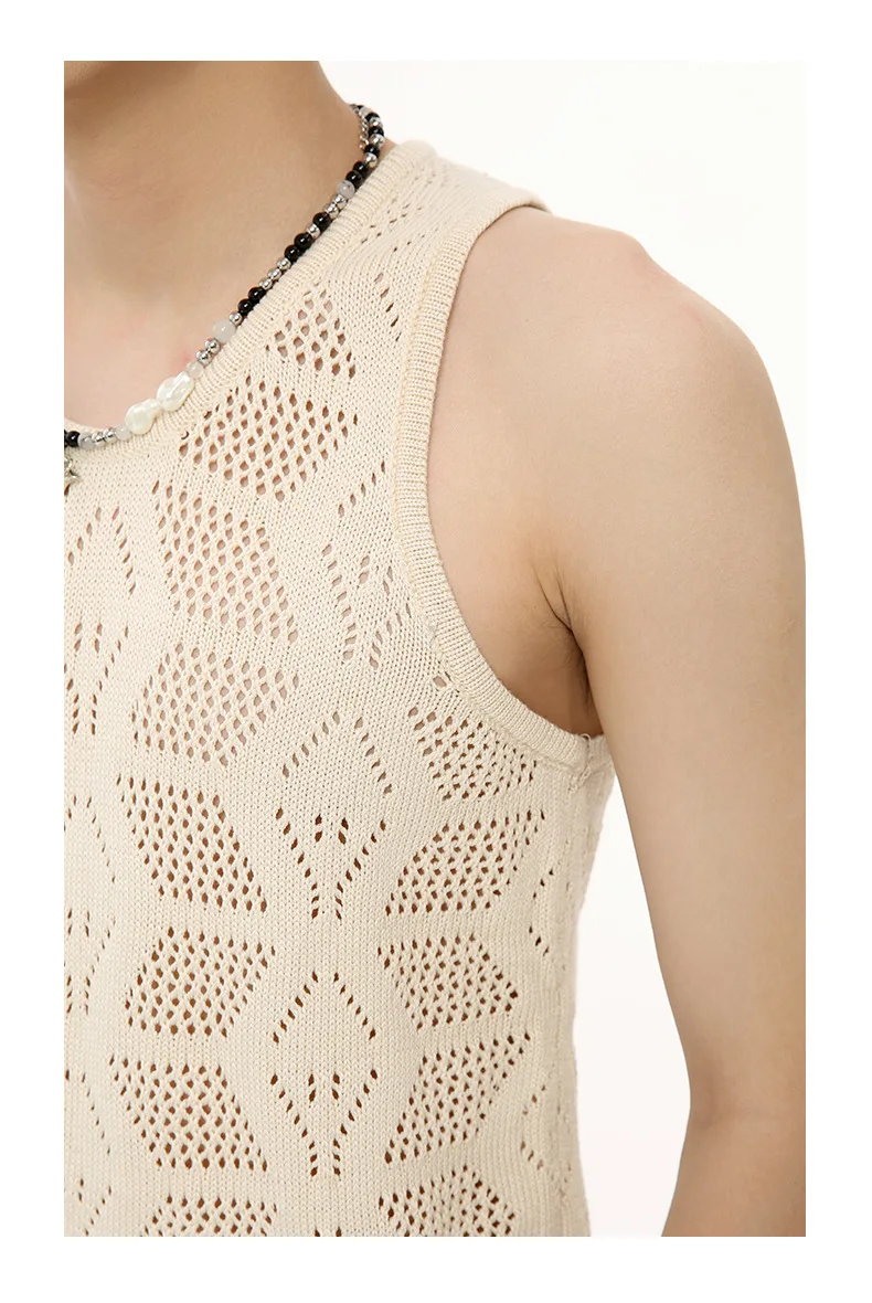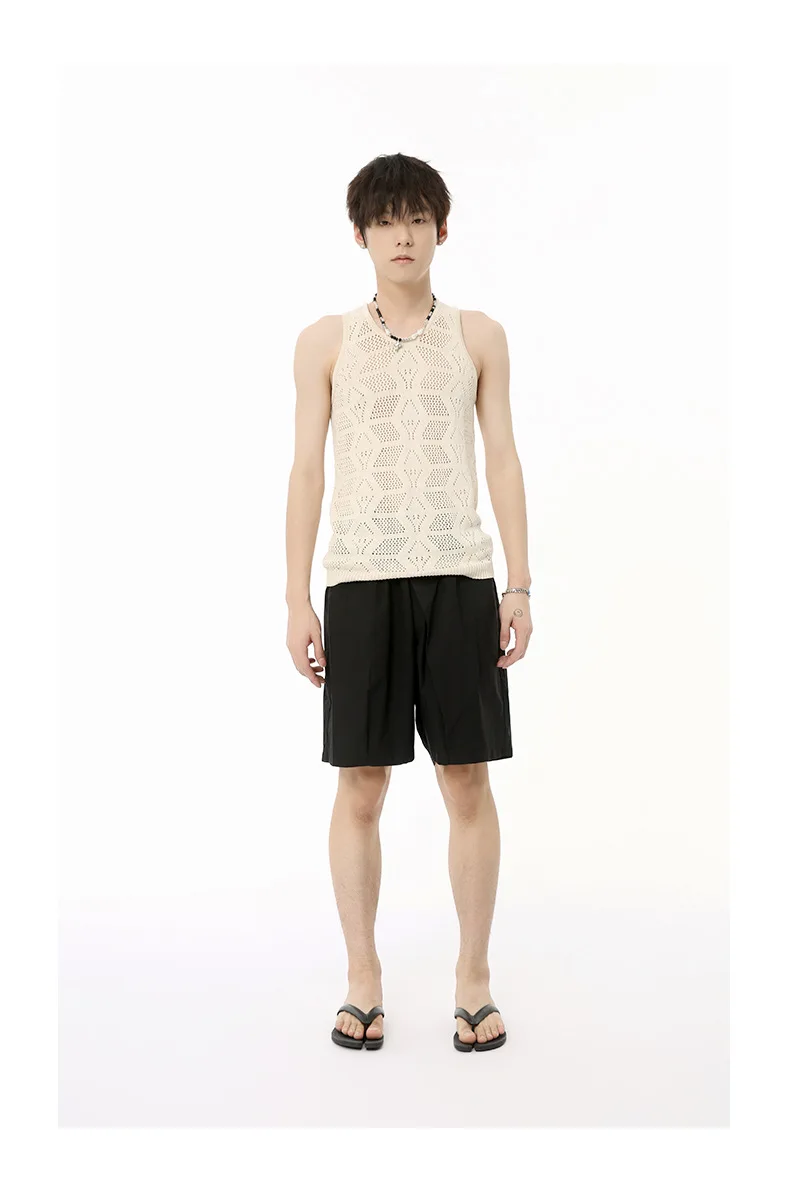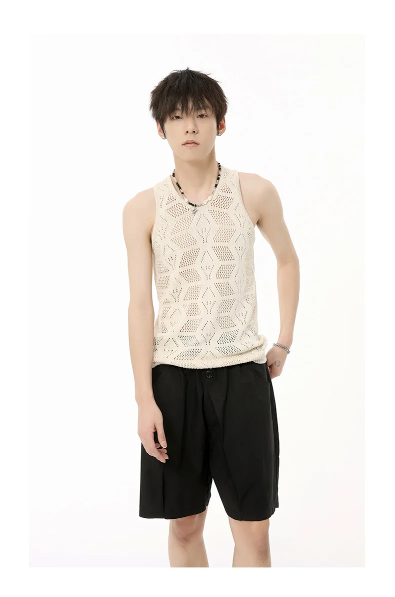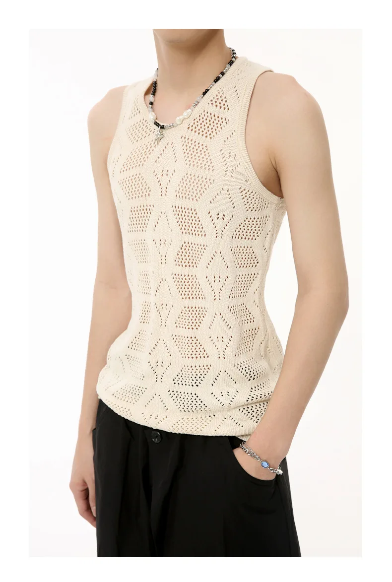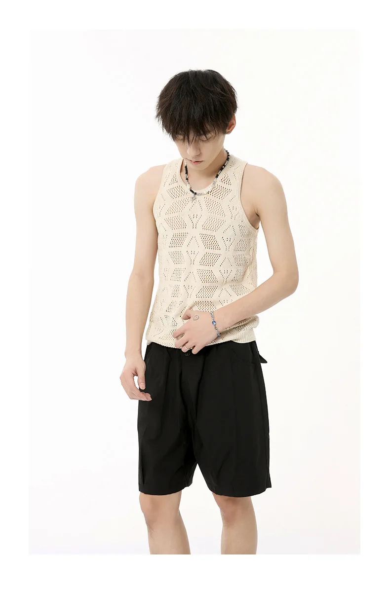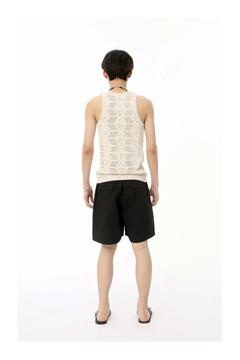 Wiaofellas - Men's Wear Summer Solid Color Round Neck Hollow Out Knitted Vest Casual Korean Style Streetwear Tank Top Sleeveless T-shirt
