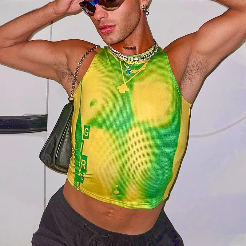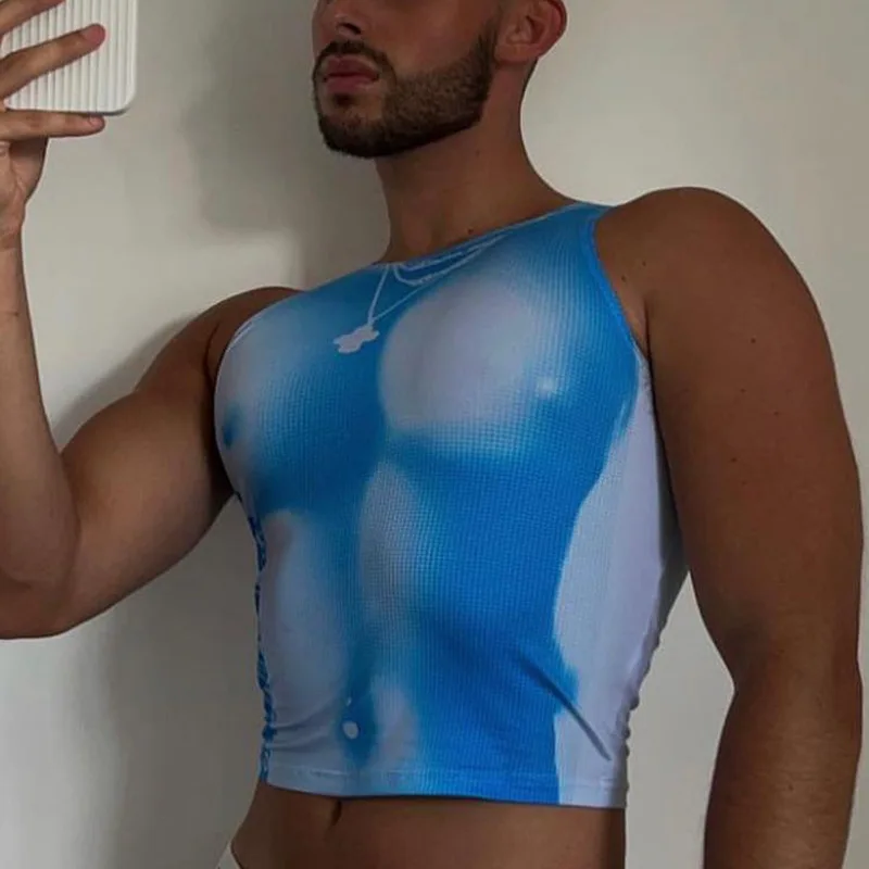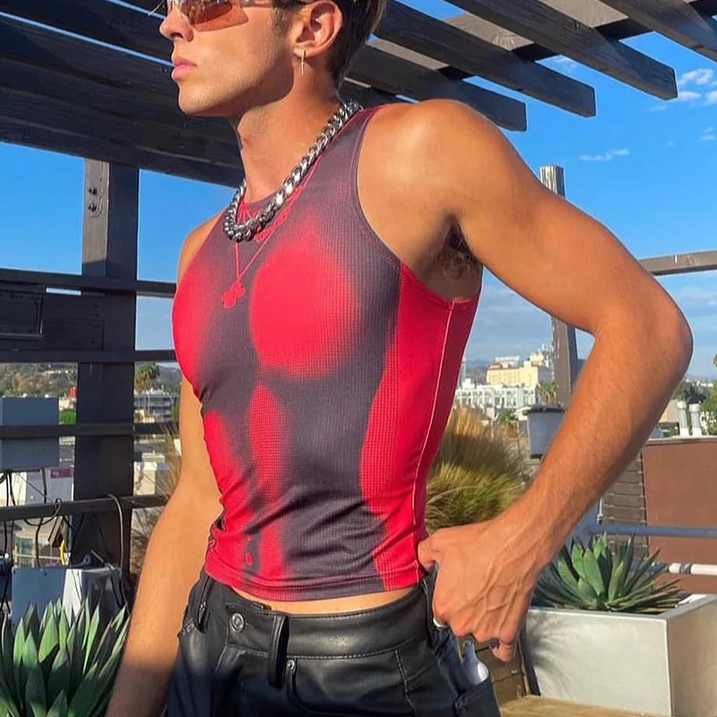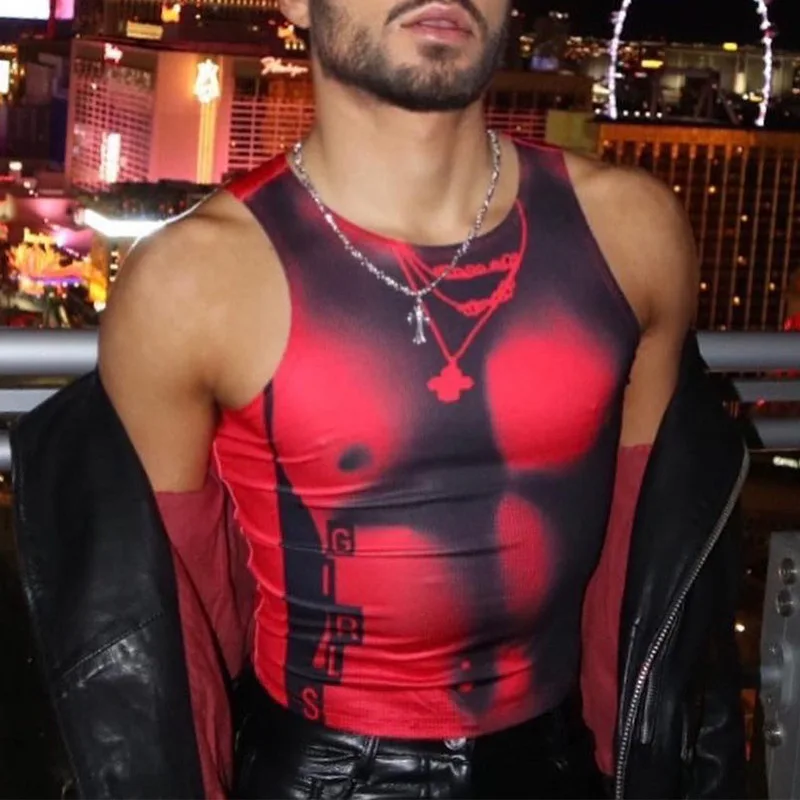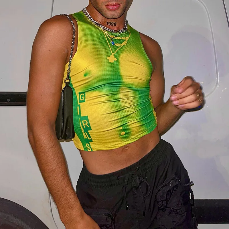 Wiaofellas - Sexy Elastic Slim Tank Tops Mens Nightclub Fashion Printed Sleeveless O Neck Straps Short Vest Streetwear Men Y2K Trend Camisole