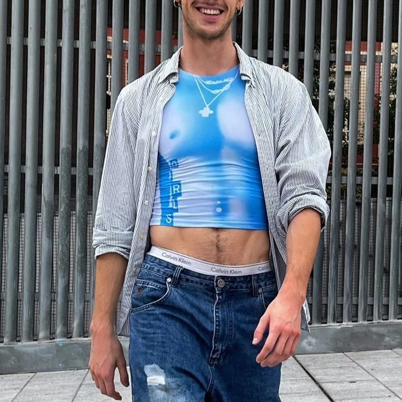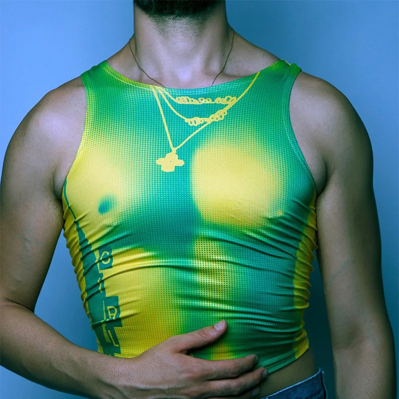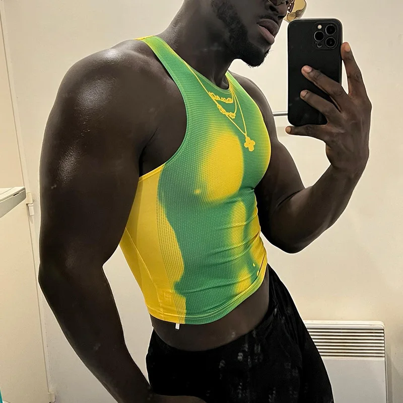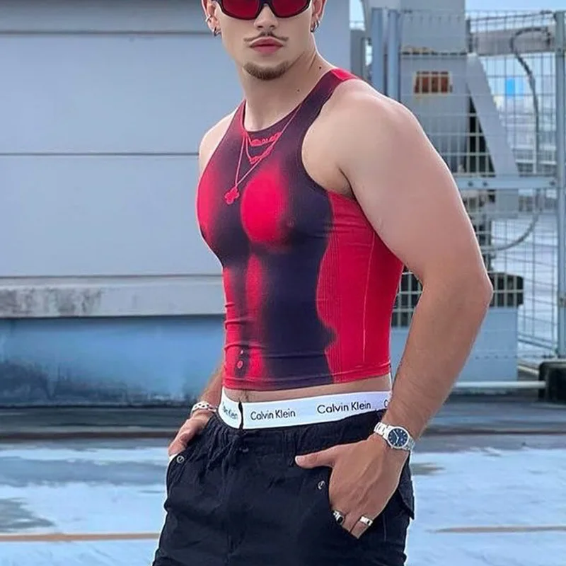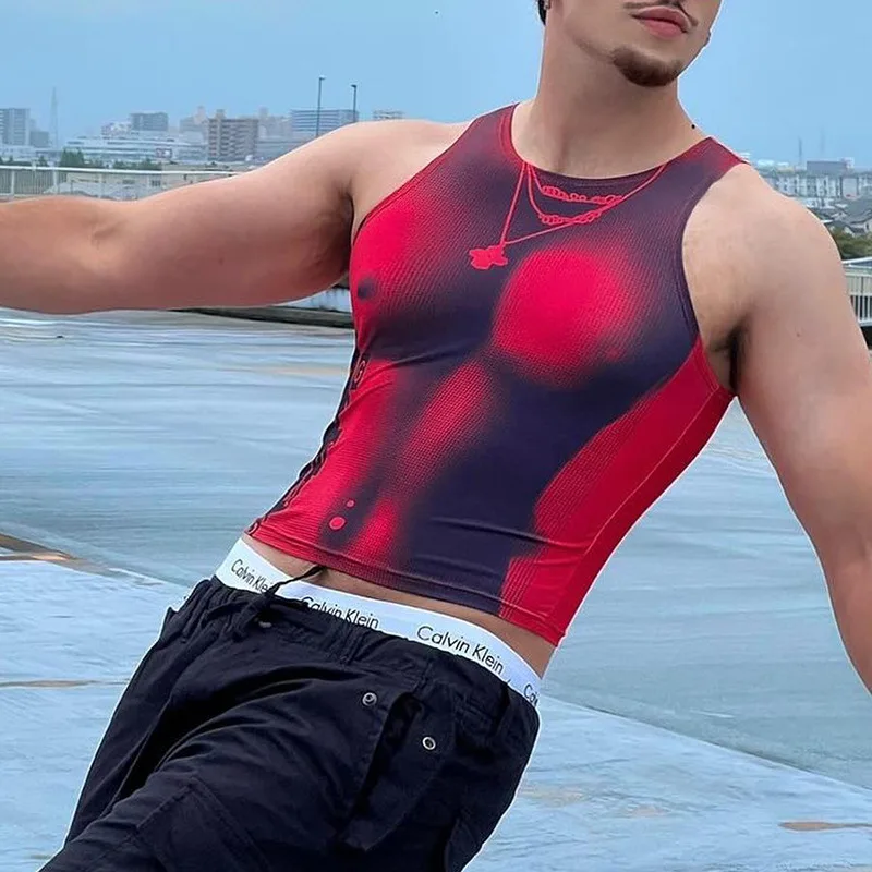 Wiaofellas - Sexy Elastic Slim Tank Tops Mens Nightclub Fashion Printed Sleeveless O Neck Straps Short Vest Streetwear Men Y2K Trend Camisole