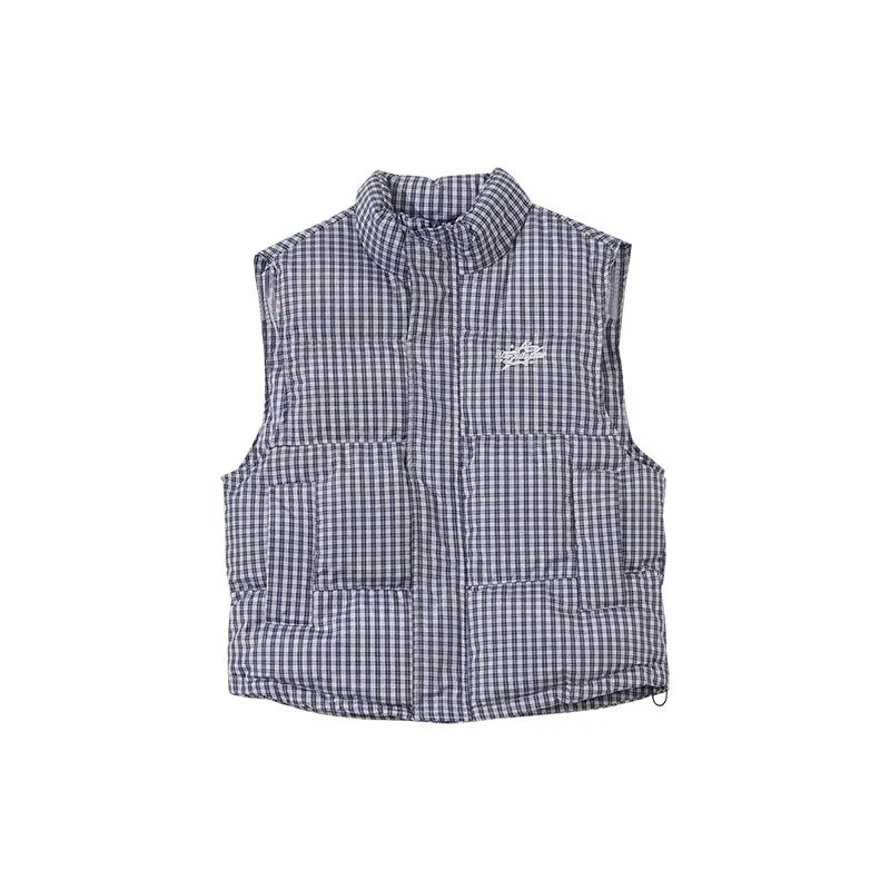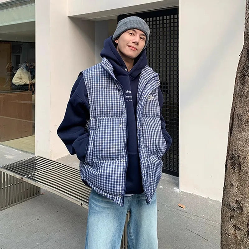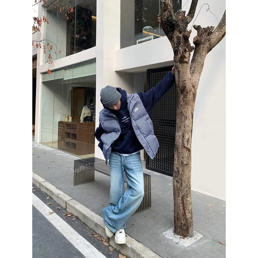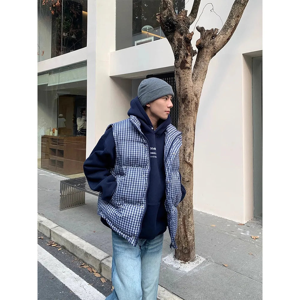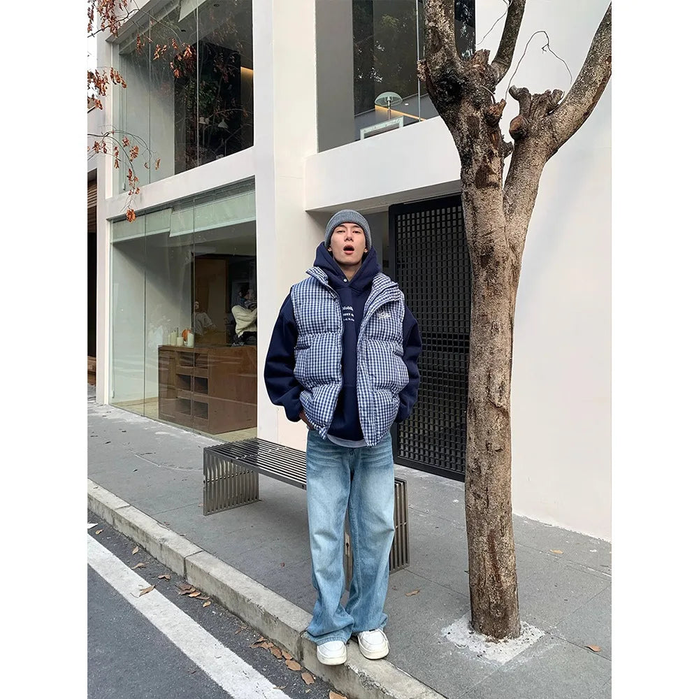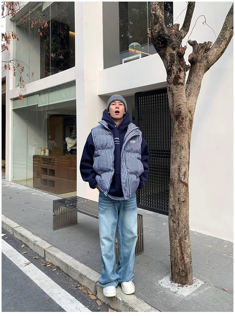 WIAOFELLAS - American retro blue plaid loose cotton vest men and women's trendy autumn and winter cotton jacket layered cotton jacket
