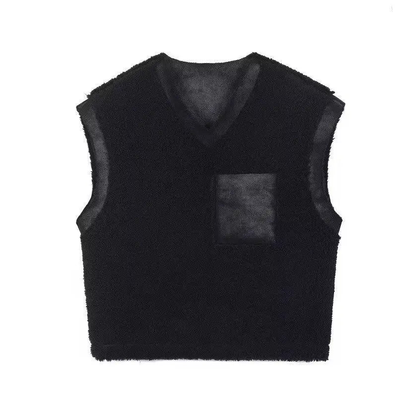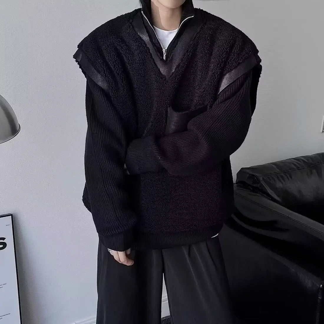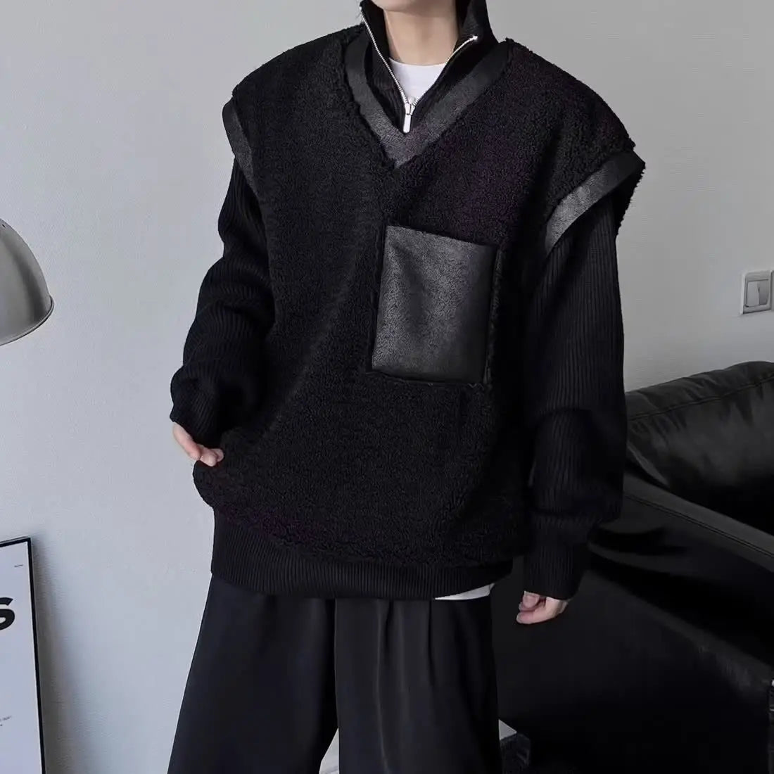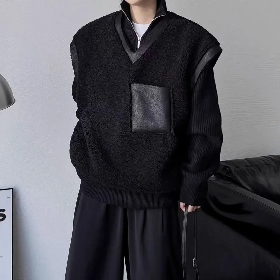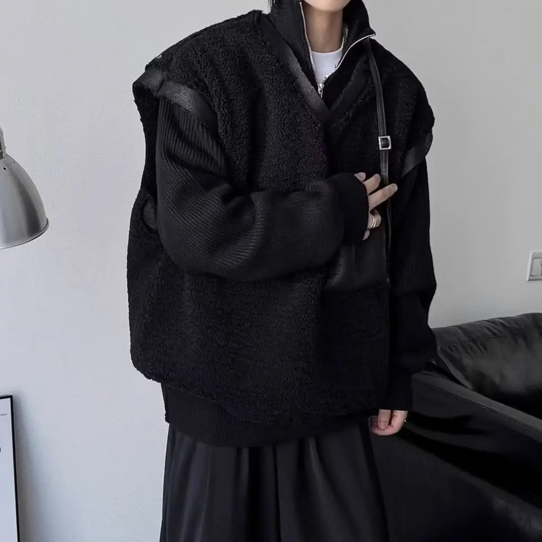 WIAOFELLAS - Dark thickened fur integrated vest vest for men's Japanese retro trendy brand loose versatile splicing V-neck jacket