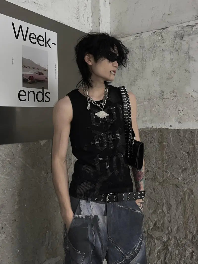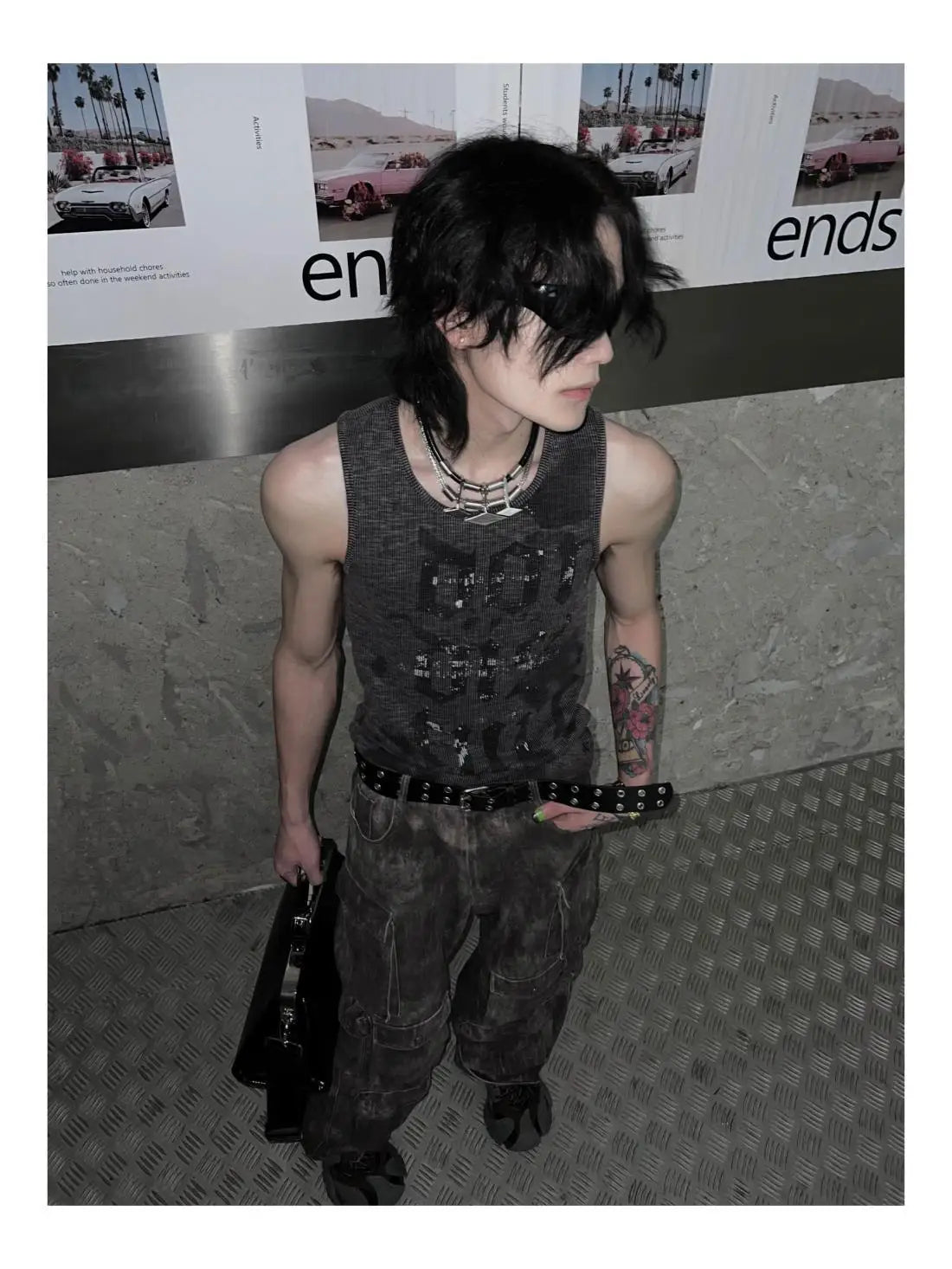 WIAOFELLAS - Men Clothing Tank Tops Summer High-end Designed Chic Niche Amercian Punk Hip-hop Letter Print Slim Fit Sleeveless Vest T-shirt